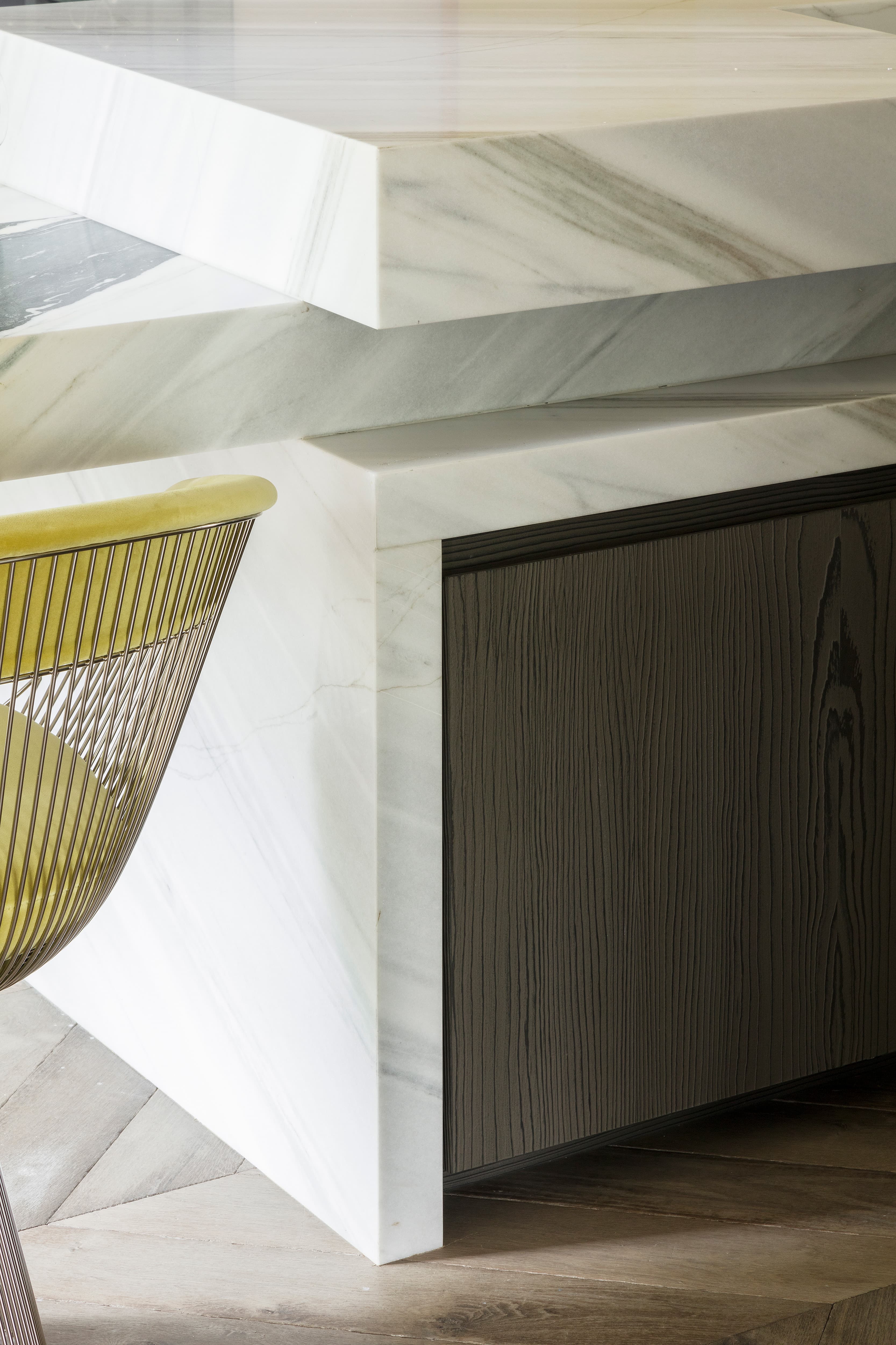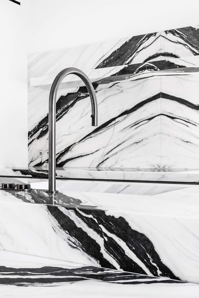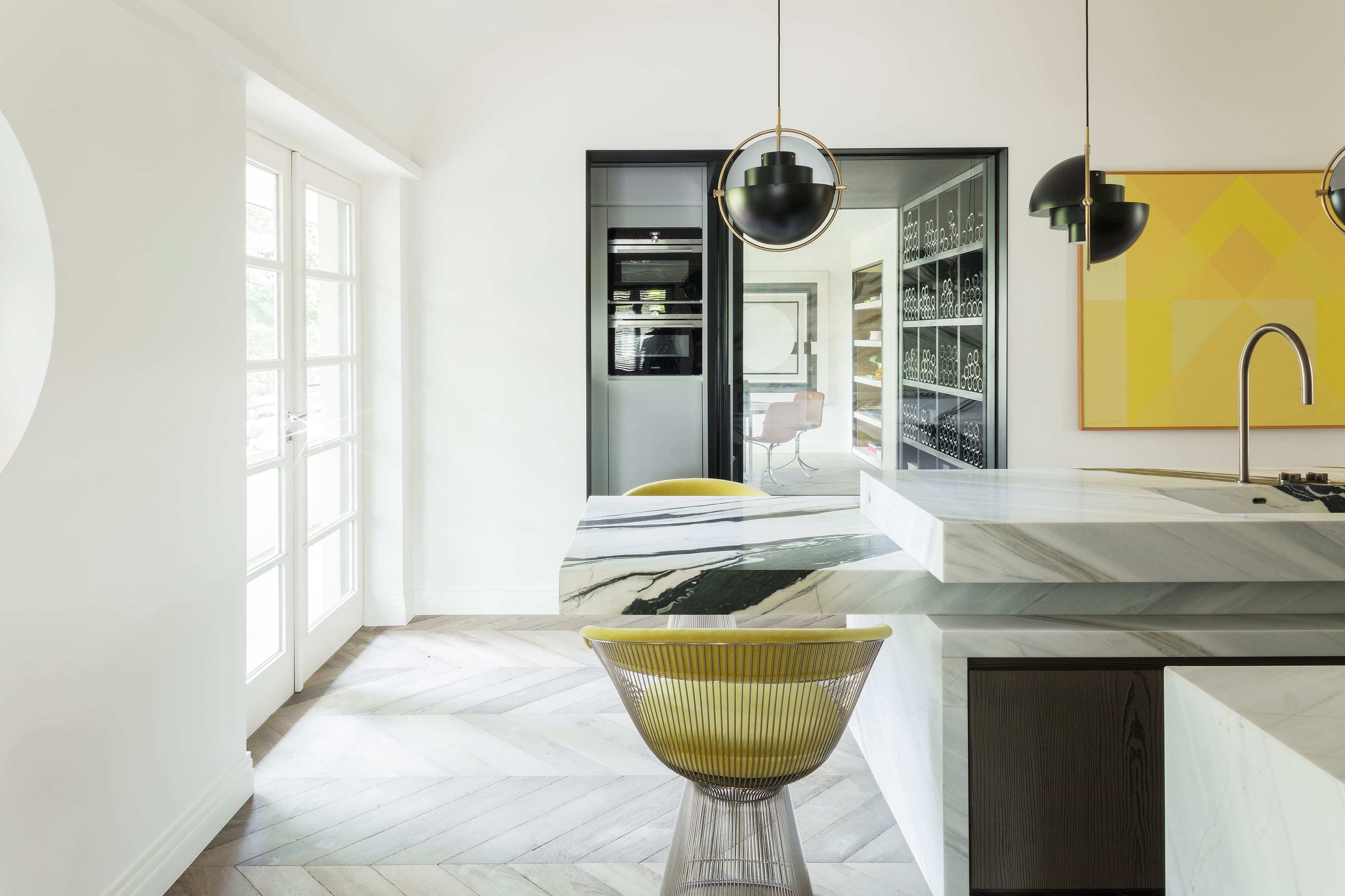 Dirand ziet zijn keuken als een imposant ‘beeldhouwwerk’ waaraan verschillende functies zijn gekoppeld zoals het klassieke keukeneiland en de familietafel. Vanuit dit eiland ontvouwen zich opbergruimtes, kookelementen en andere functies volgens de noden van elk project. Het resultaat is een dynamisch object in een compacte structuur waar eten, koken en werken elkaar vinden. De unieke wit-zwarte Minolo marmer is van natuursteenspecialist Van Den Weghe. Drie wandlampen van Gubi.