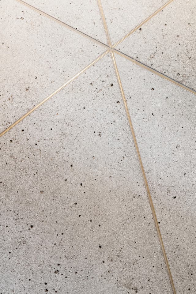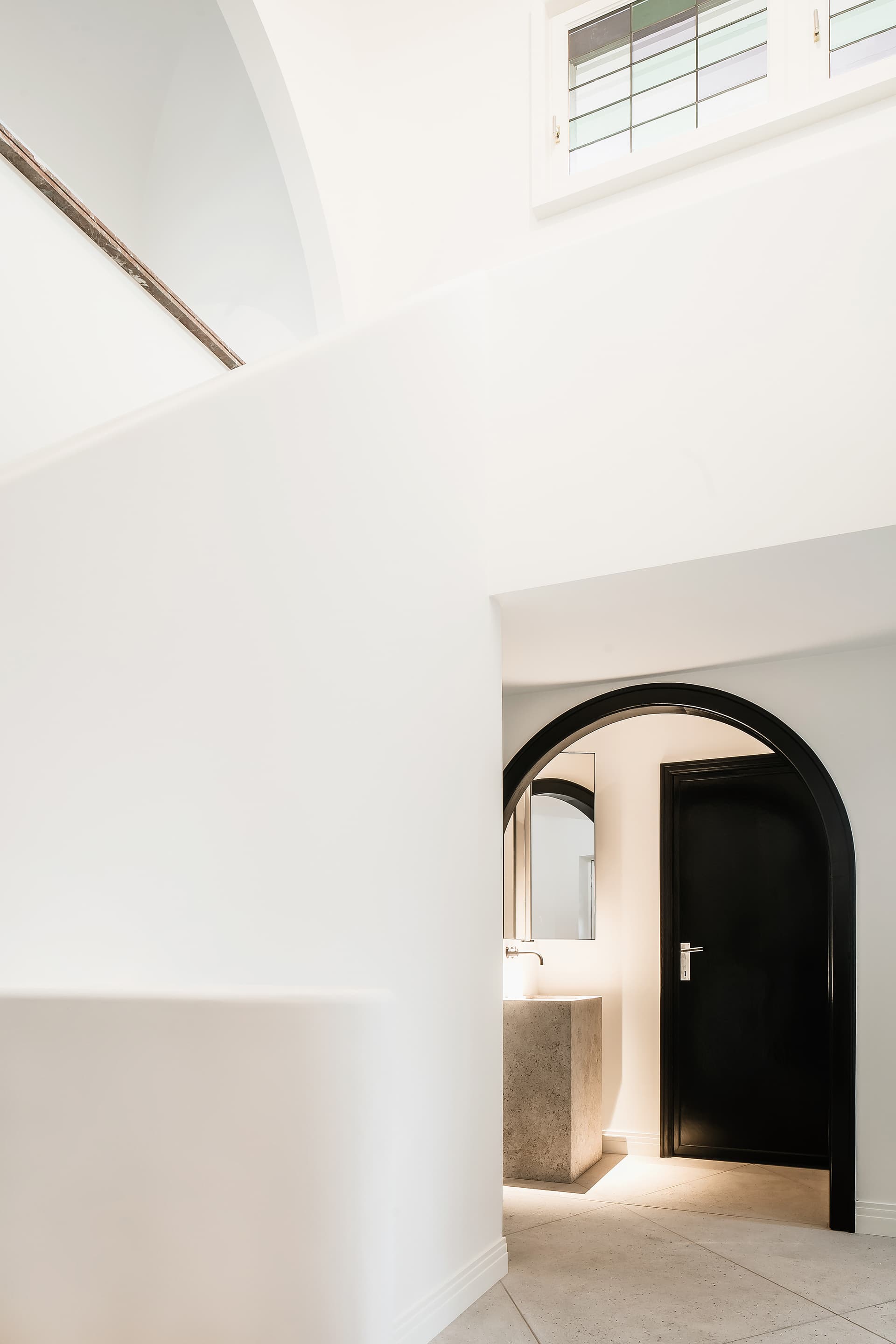 Daarna besloten we de binnenkant volledig te strippen en alleen de buitenmuren te behouden die waren uitgevoerd in cimorné lavé. Dat is een inmiddels in onbruik geraakte techniek waarin cementpleister wordt aangevuld met decoratieve granulaten. Die pleister wordt vervolgens uitgewassen waardoor de granulaten zichtbaar worden. In dit geval waren de granulaten van natuursteen.