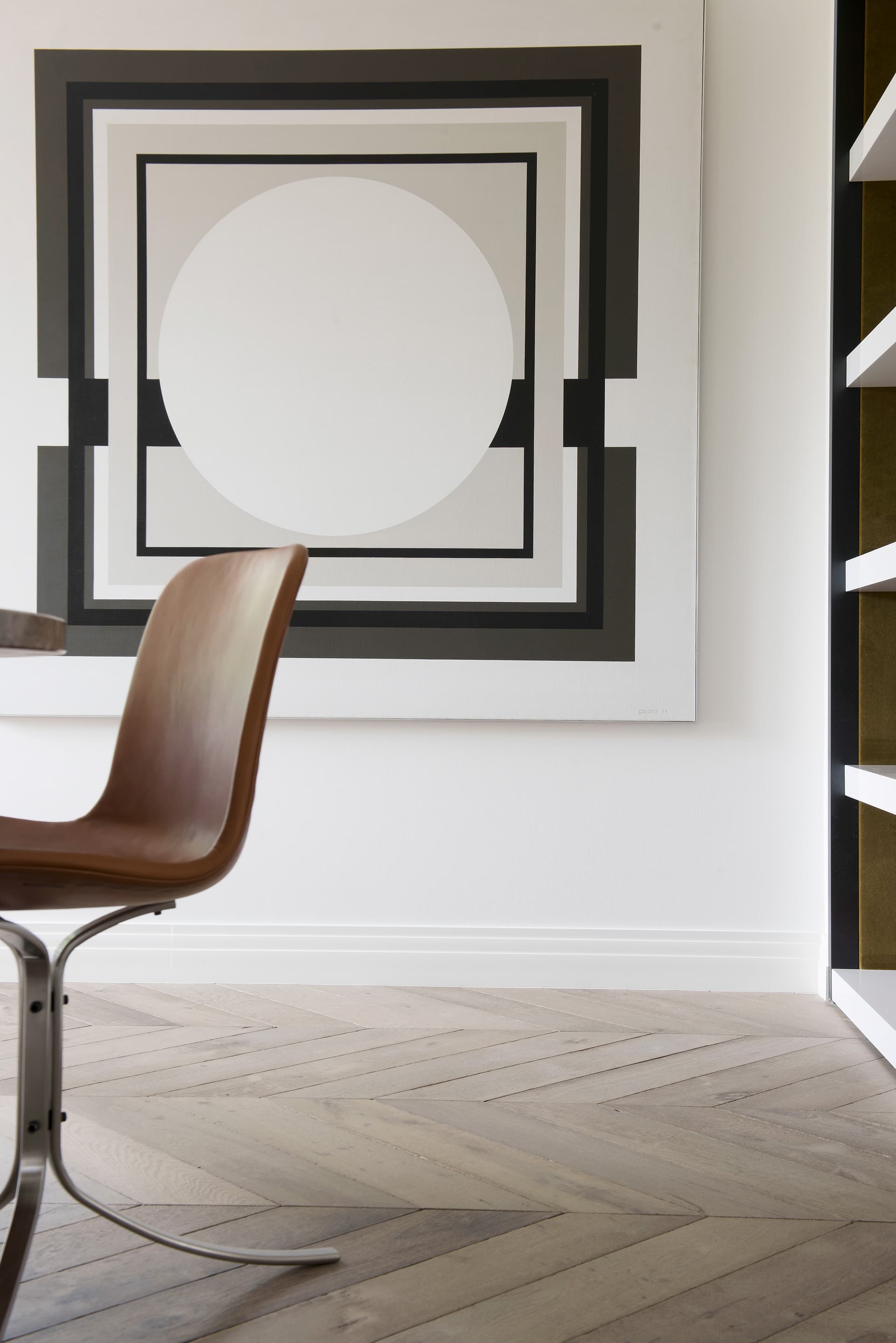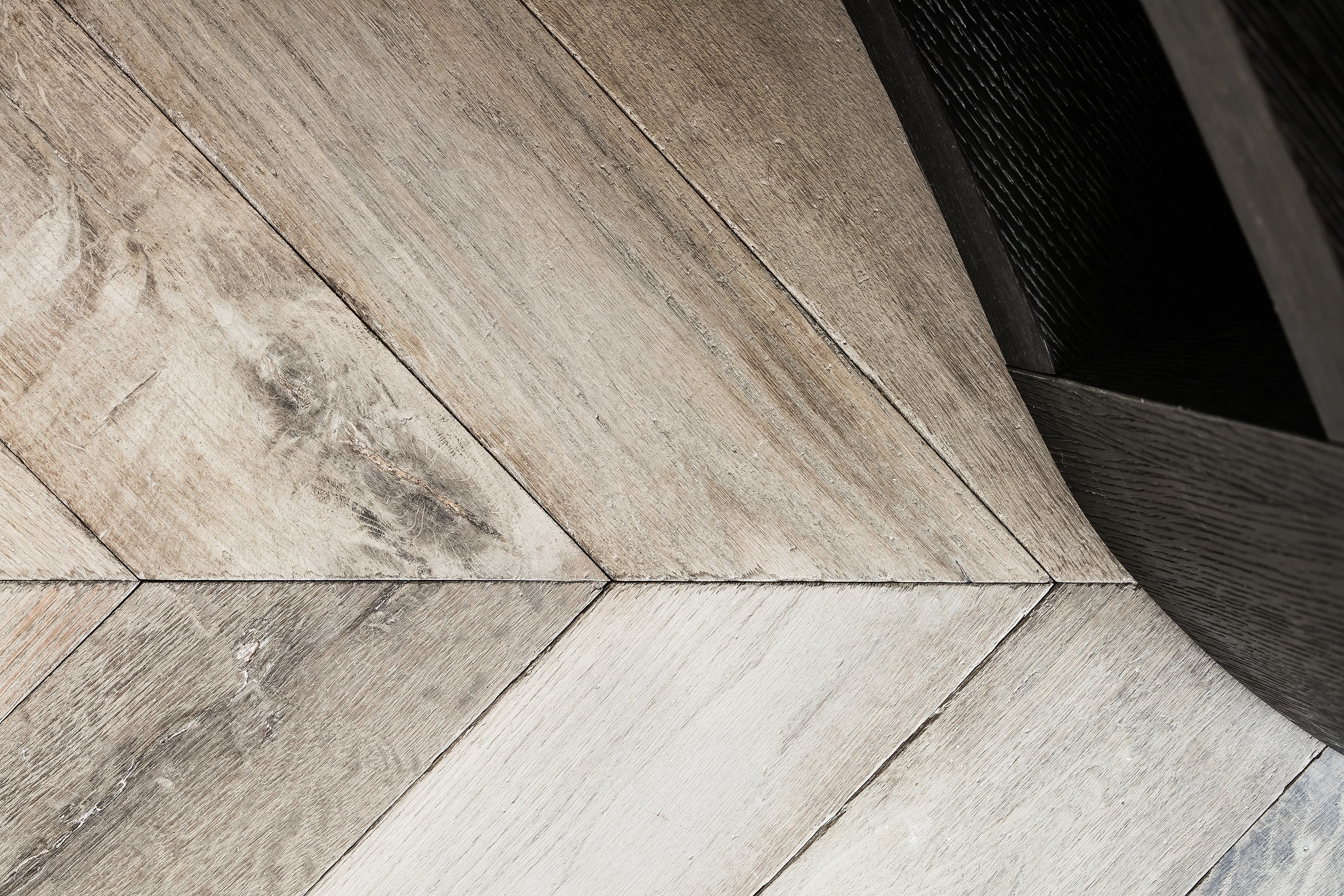 Binnen vinden we ruimtes met enorm veel licht. Zoals de leefkamer die achter de boeg ligt, omsingeld door ramen. Ook in het interieur hebben we zoveel mogelijk teruggevonden elementen gebruikt om alles in de oorspronkelijke staat terug te brengen. Zo vonden we de prachtige, originele deurklinken, ingelegd met ebbenhout, terug. We poetsten ze op en plaatsten ze in de oorspronkelijke, donker gebeitste deuren.