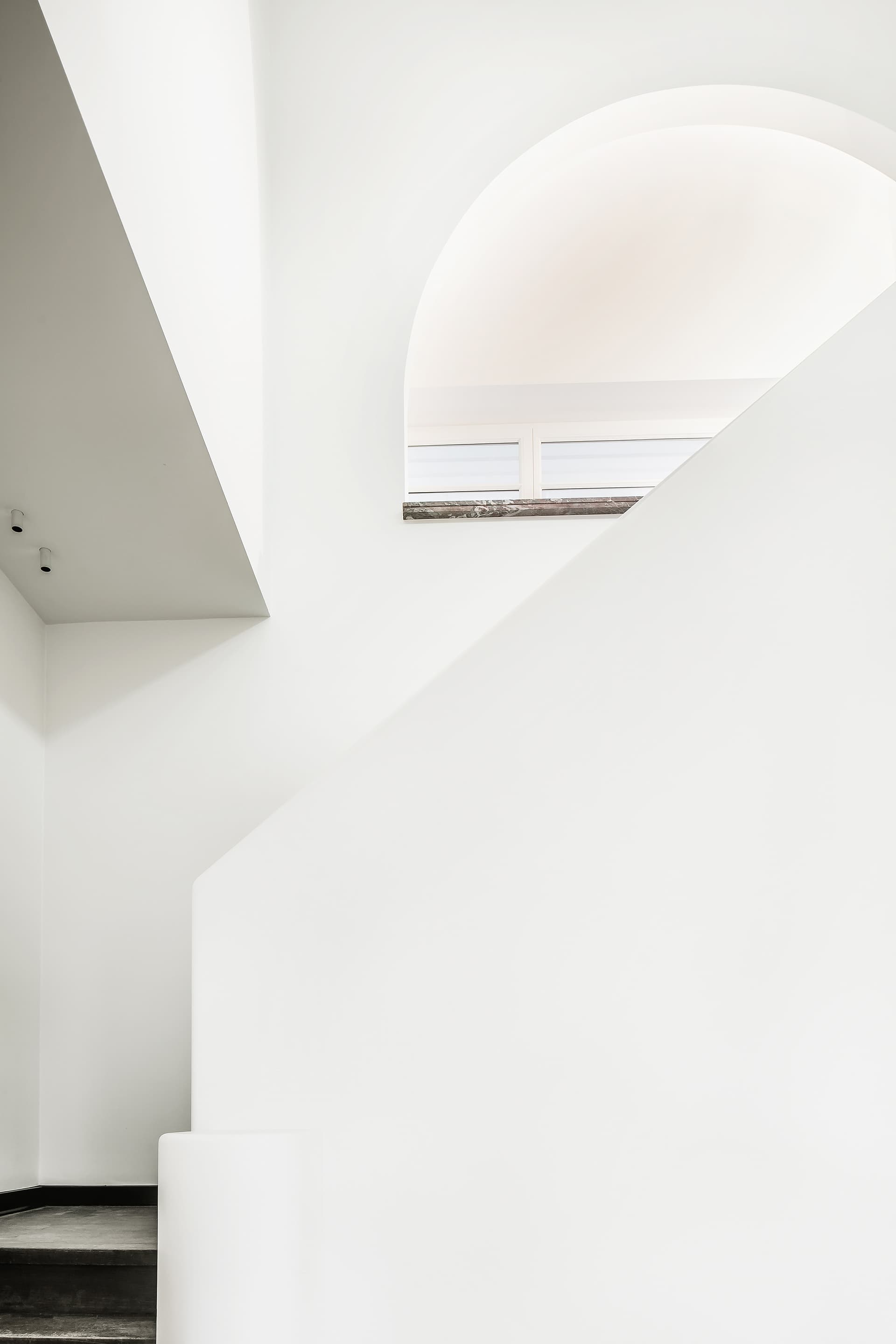 Door het hele interieur vinden we gebogen plafonds die zijn gekoppeld aan de grote dakoversteken aan de buitenzijde. Zij voorkomen dat het binnen een hoekig geheel wordt en leveren, in combinatie met strategisch geplaatste lampen, een fraai lichtspel op. De glas-in-lood ramen zijn opnieuw samengesteld. De lichtinval brengt de kleuren van de buitengevel ook naar binnen.