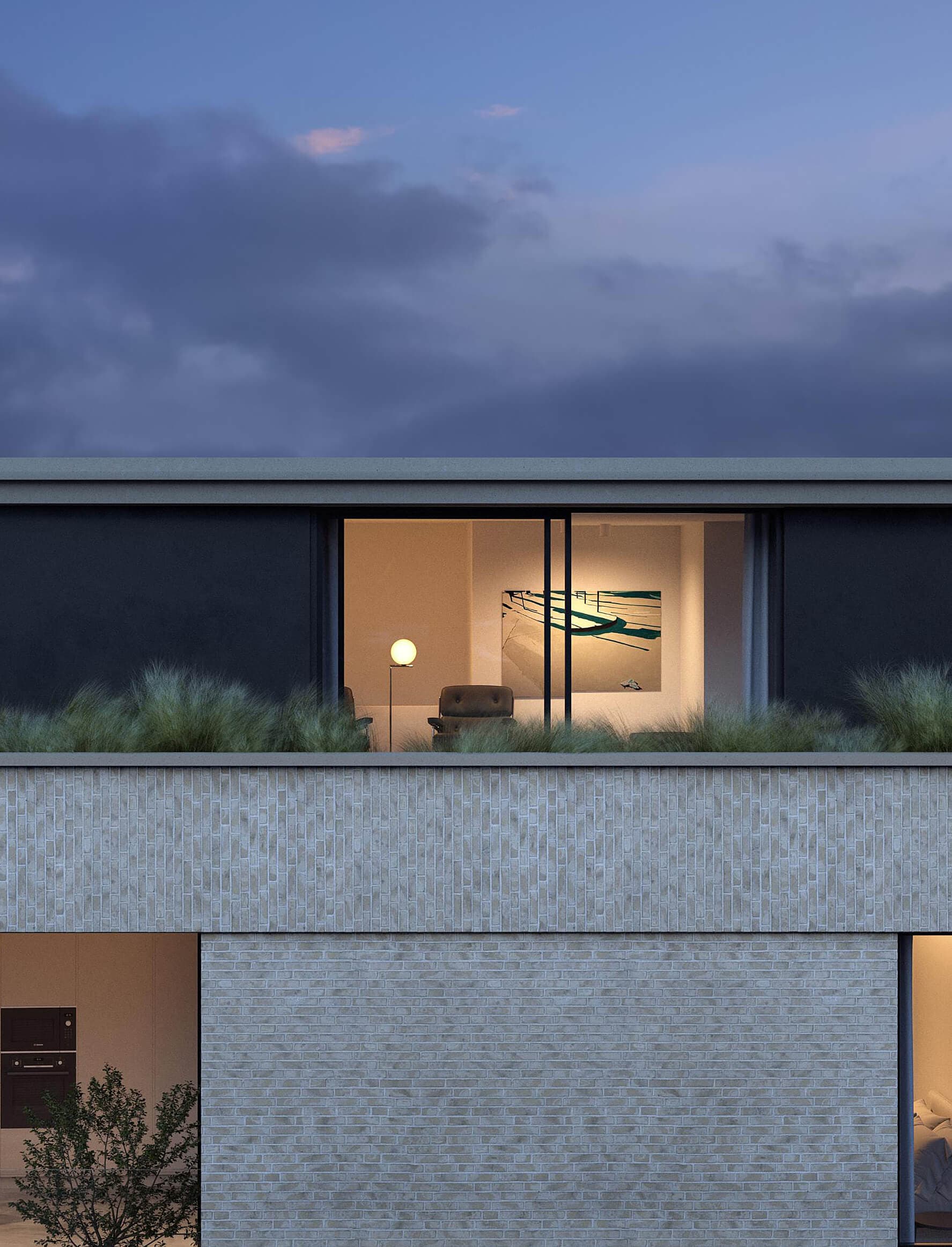 Het materiaalgebruik bestaat uit een duurzame beige baksteen en minimaal onderhevig is aan veroudering, geflankeerd door fijn geprofileerde zwarte ramen en glazen borstweringen die de openheid naar de leefruimtes minimaal verstoren. Dit alles zo gedetailleerd om tot een elegant geheel te komen.