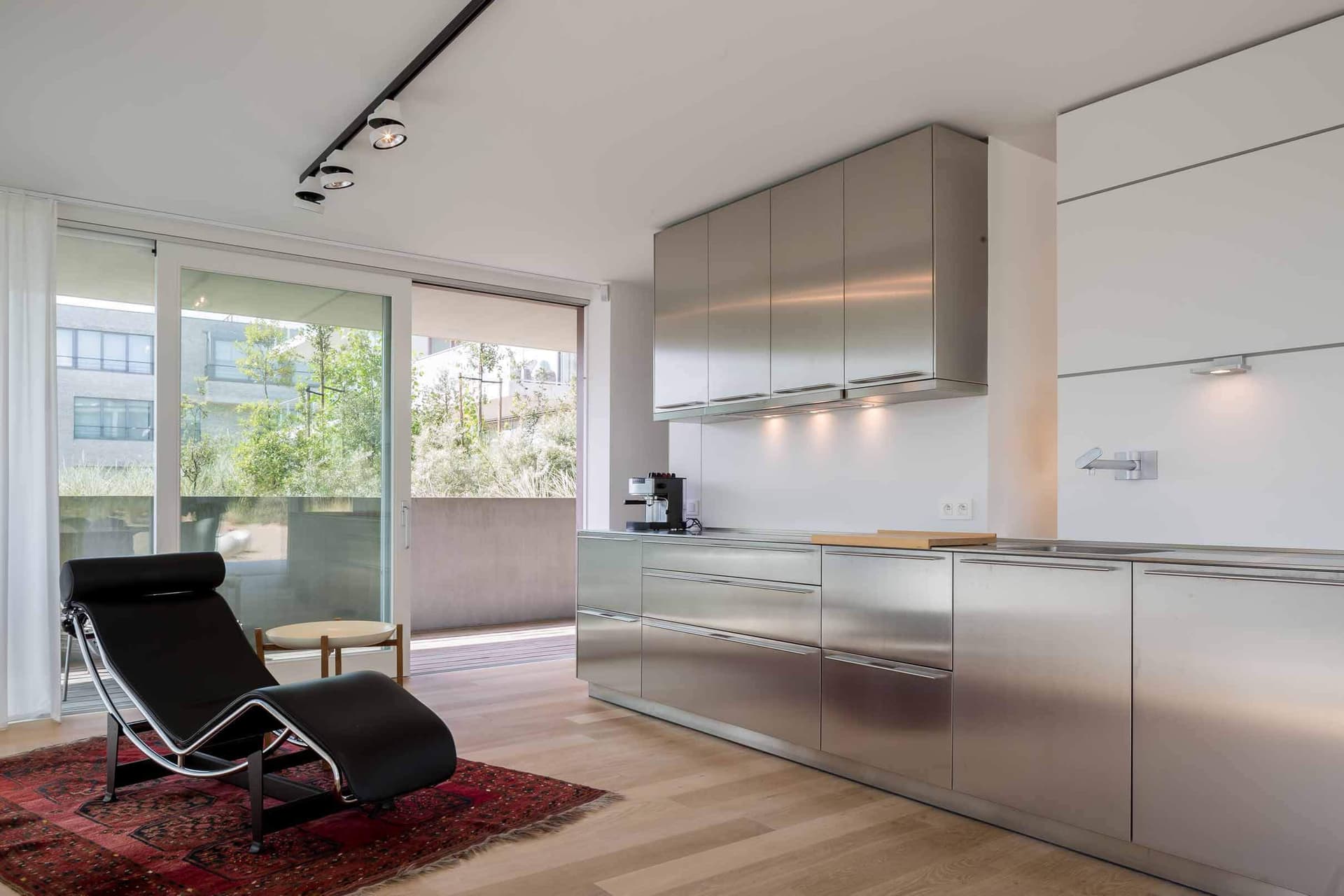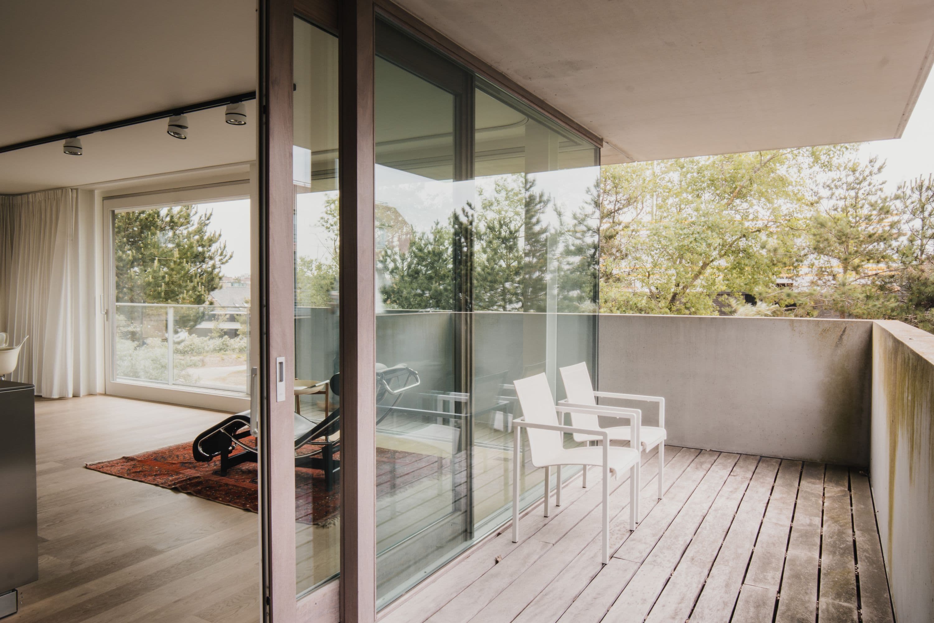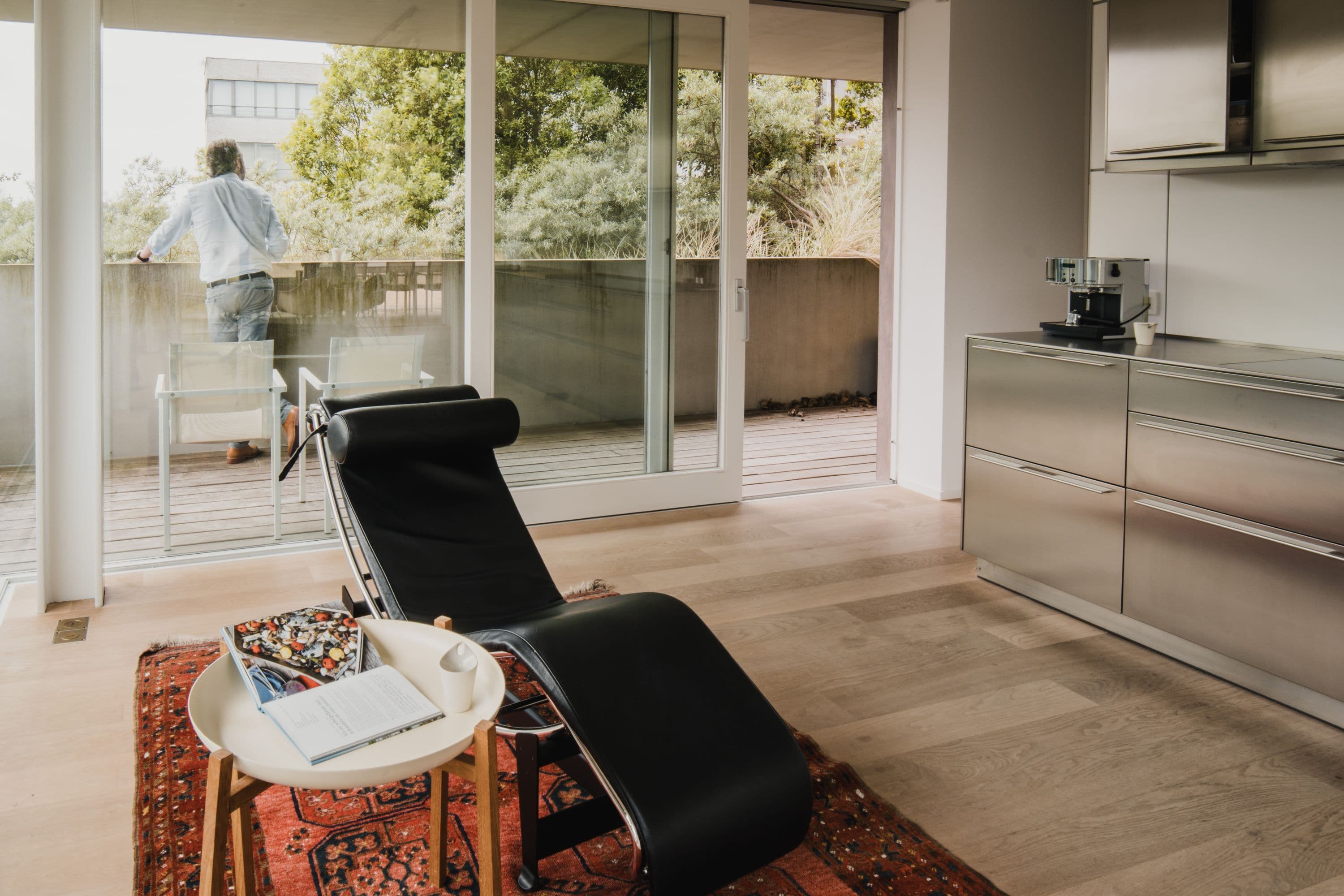 Elk appartement in Residentie Arne Jacobsen geniet van prachtige zichten op de groene omgeving. De gevel met zicht op het natuurgebied is afgeschermd door een verschuifbare houten wanden. De houten wanden kunnen gebruikt worden als claustra’s en privacy tools. Oriëntatie, planopbouw en materialen houden aldus rekening met bezonning en natuurlijke opwarming. Dit is een eerste vereiste van goede architectuur die veel te vaak over het hoofd wordt gezien. Ruime terrassen aan de glazen gevels vergroten de appartementen niet alleen visueel maar ook ruimtelijk.