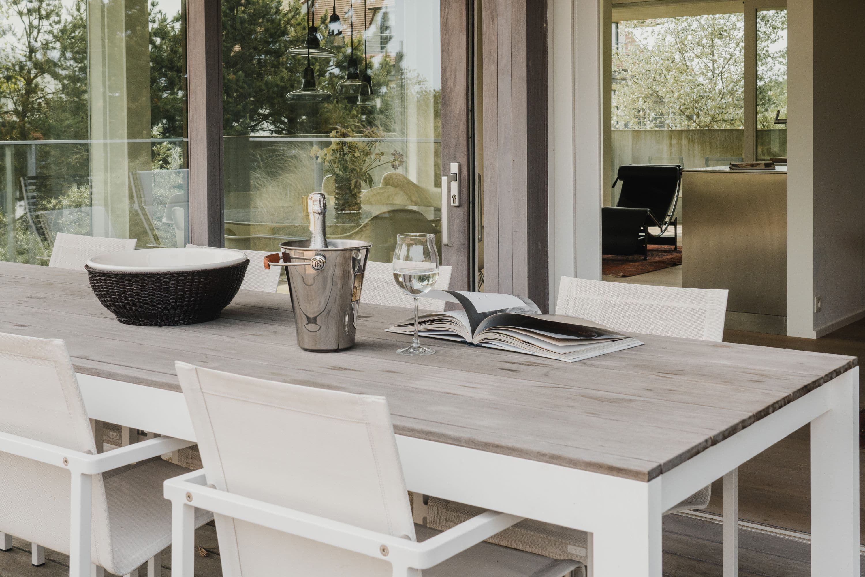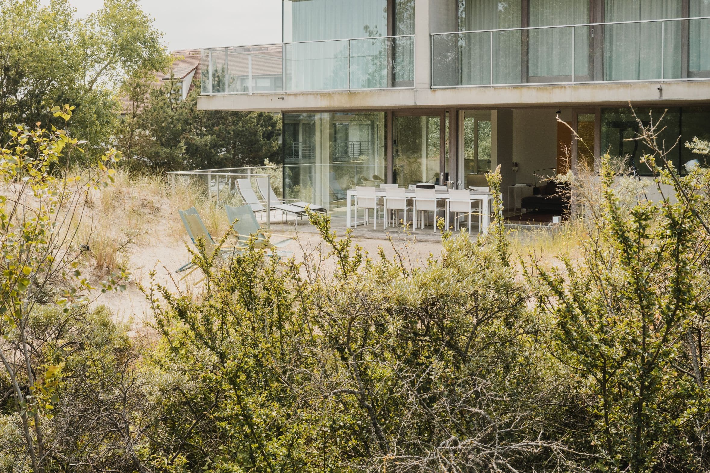 De grote raampartijen functioneren niet louter als openingen, maar als zorgvuldig georiënteerde kaders op het duinlandschap en de zee. Door de strategische plaatsing van deze glasvlakken ontstaan doorzichten over de terrassen heen, waardoor binnenruimtes zich vanzelfsprekend uitbreiden in de buitenlucht.