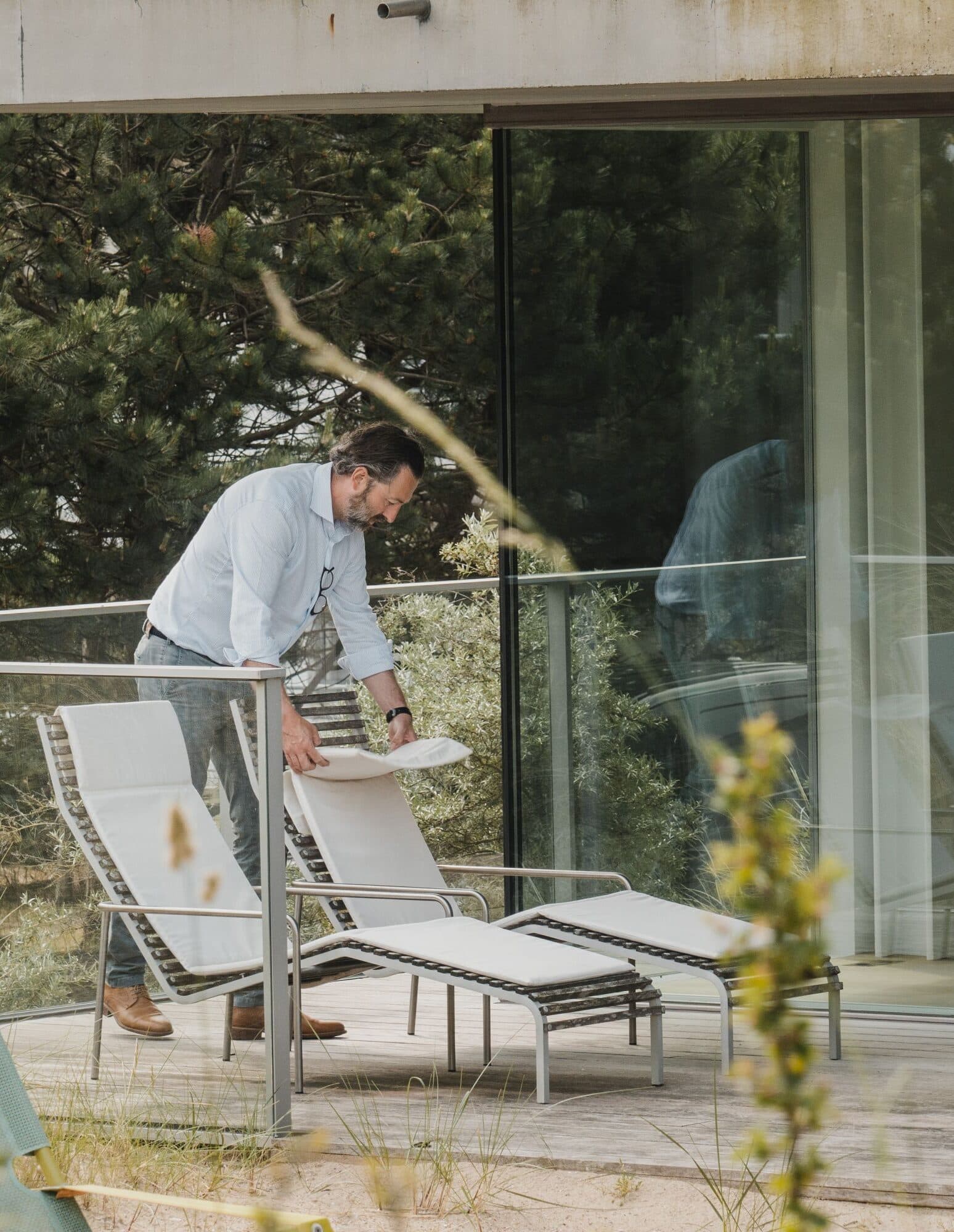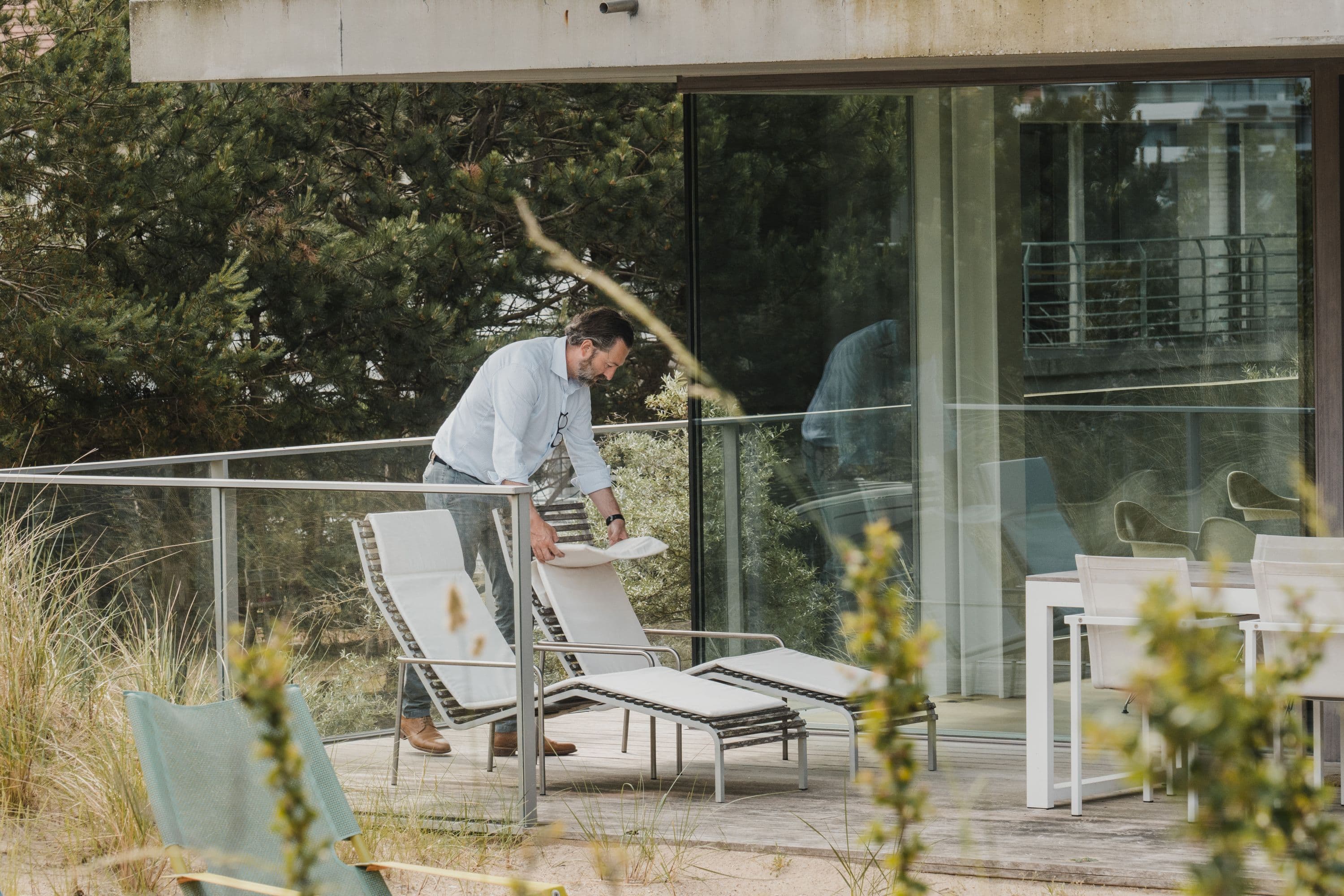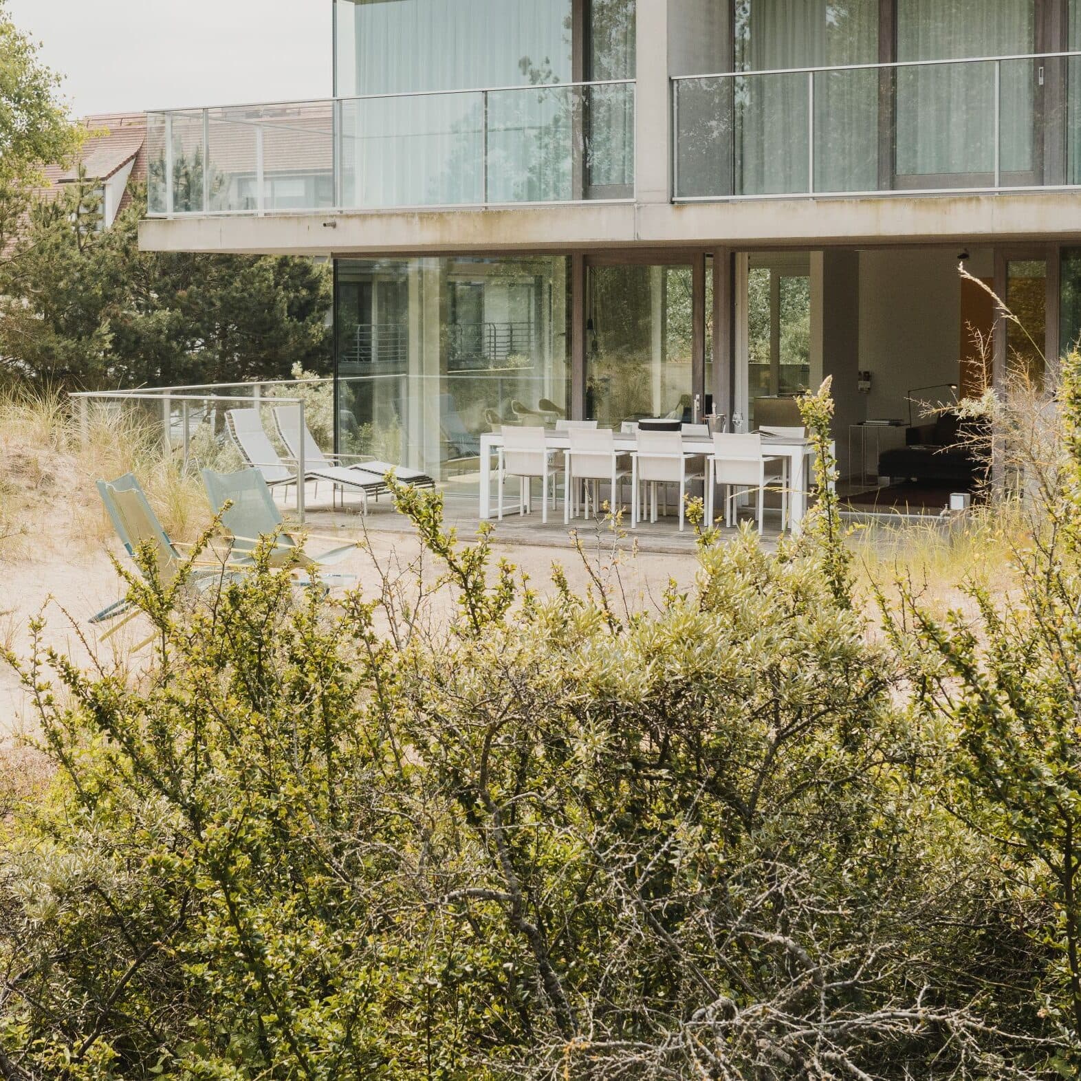 Vergrote terrasuitbouwen vormen verlengstukken van de leefruimtes en stimuleren een buitenleven dat meebeweegt met de zonoriëntatie. Ze werken als beschutte uitkijkpunten, zwevend tussen interieur en duinvegetatie.