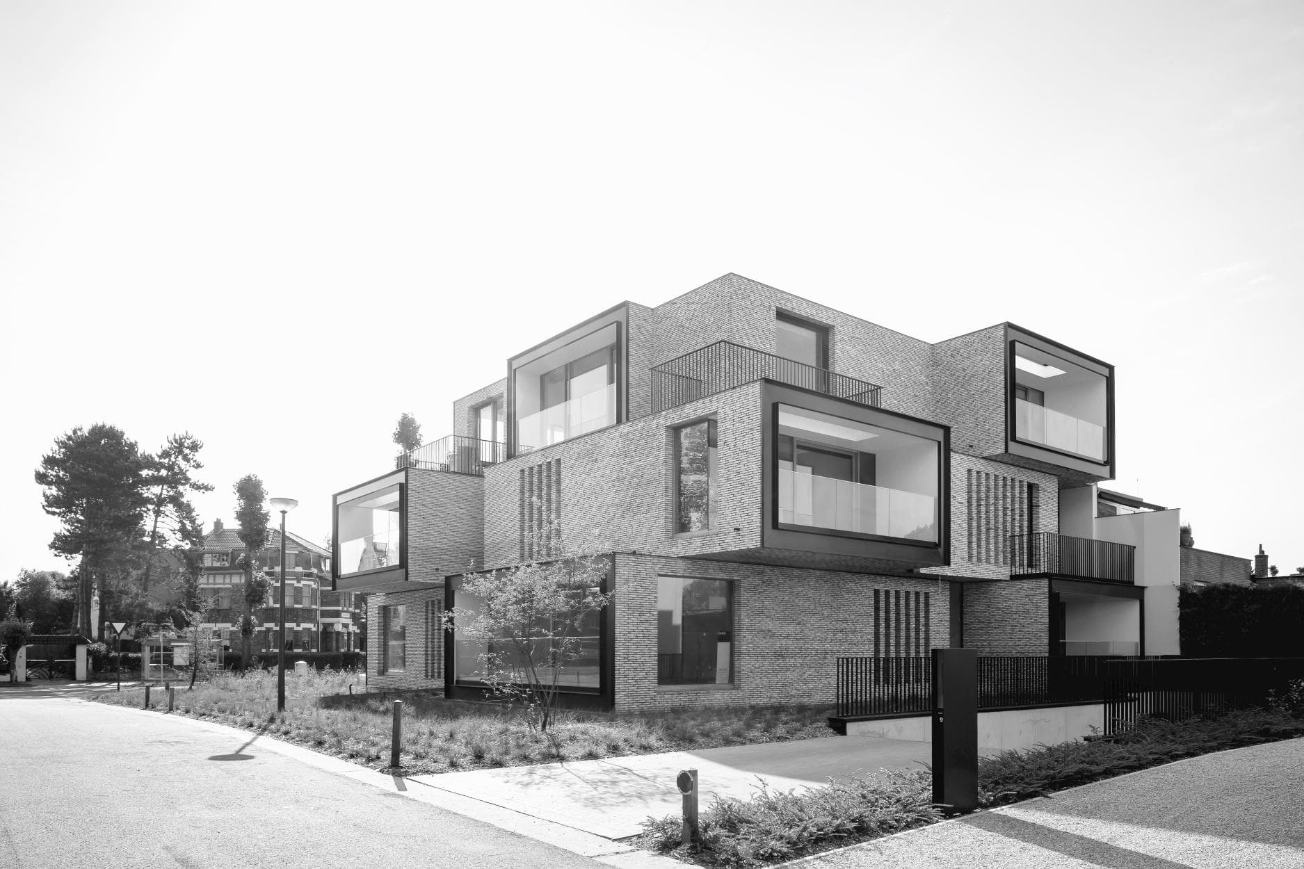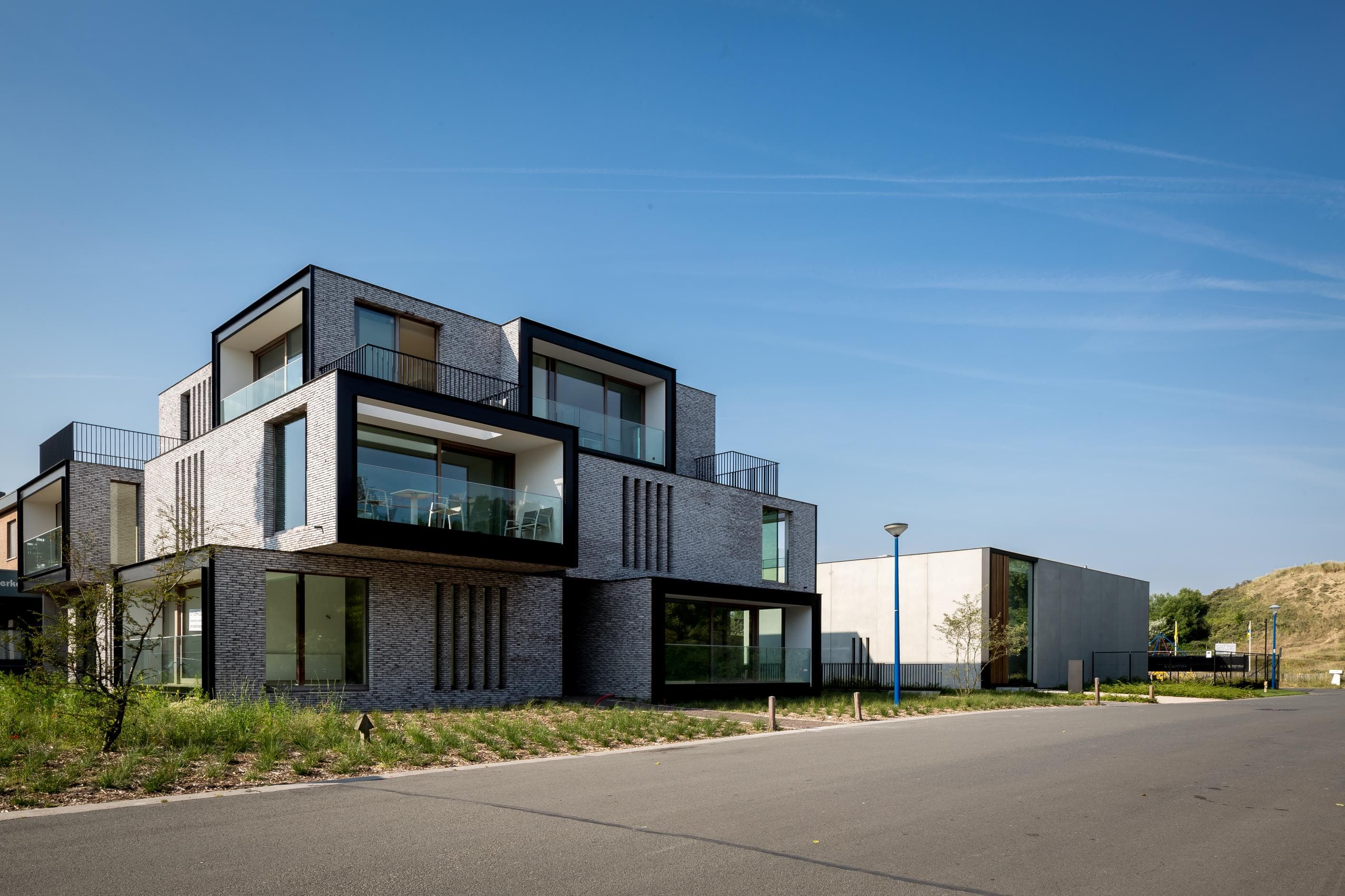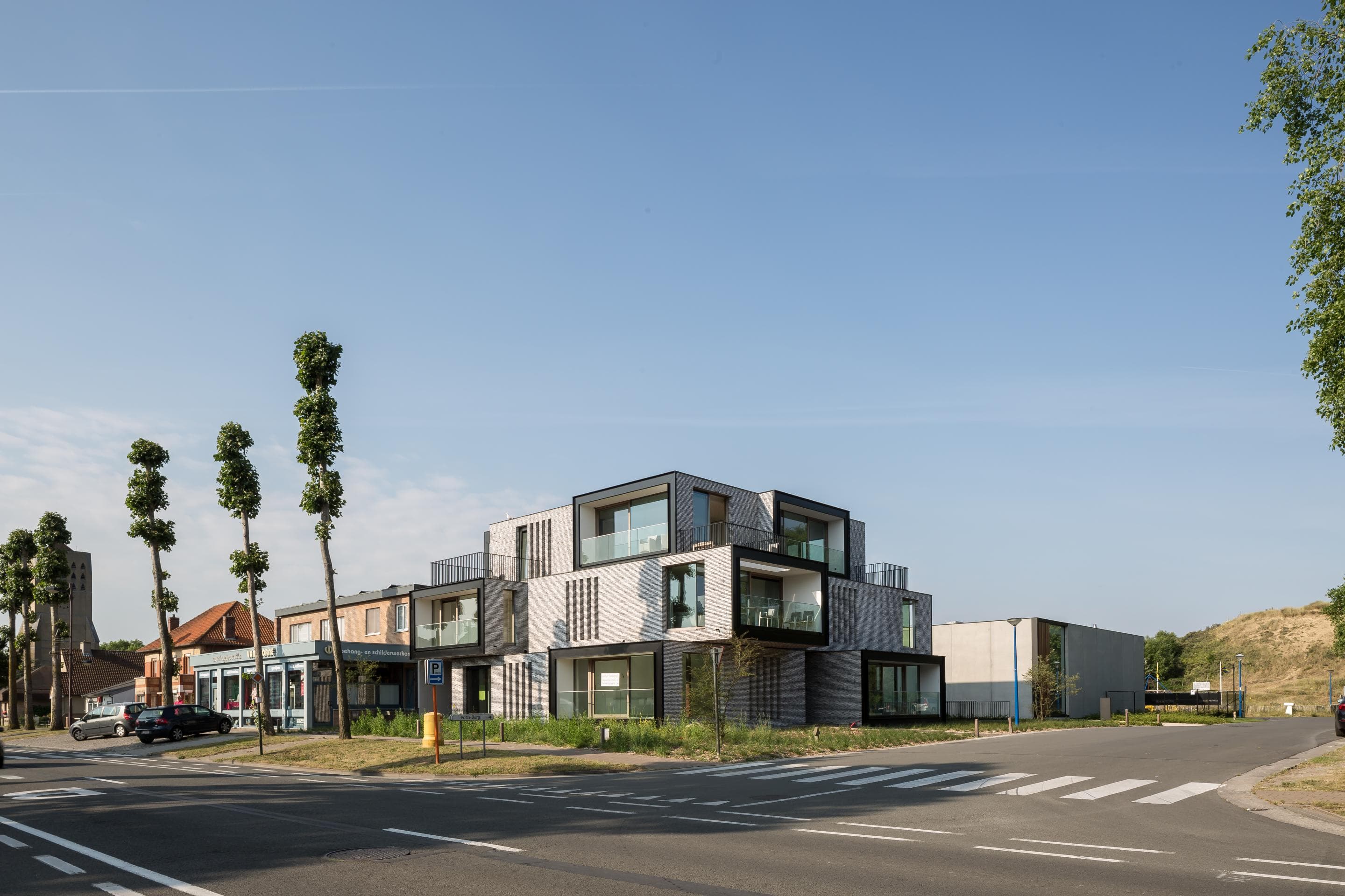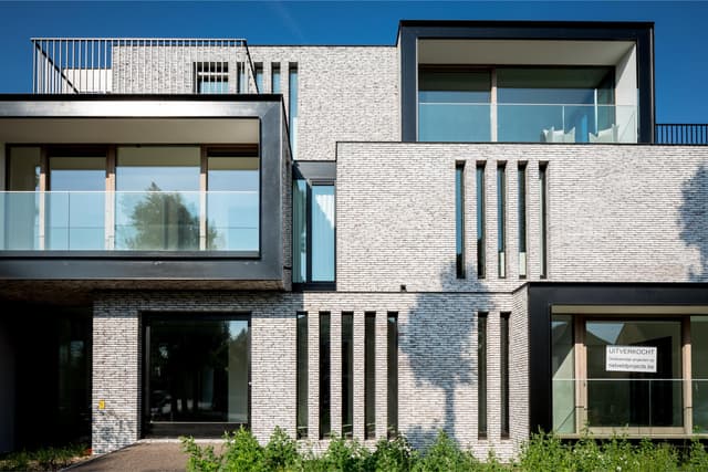 Beperkte open uitbouwconstructies versterken de stapeling van volumes en geven de architectuur extra diepte en karakter. In combinatie met het gekozen materiaalgebruik, lichtgrijs handvorm gevelmetselwerk vormt Residentie Bauhaus een echte blikvanger aan de toegangspoort van het natuurgebied Witte Burg.