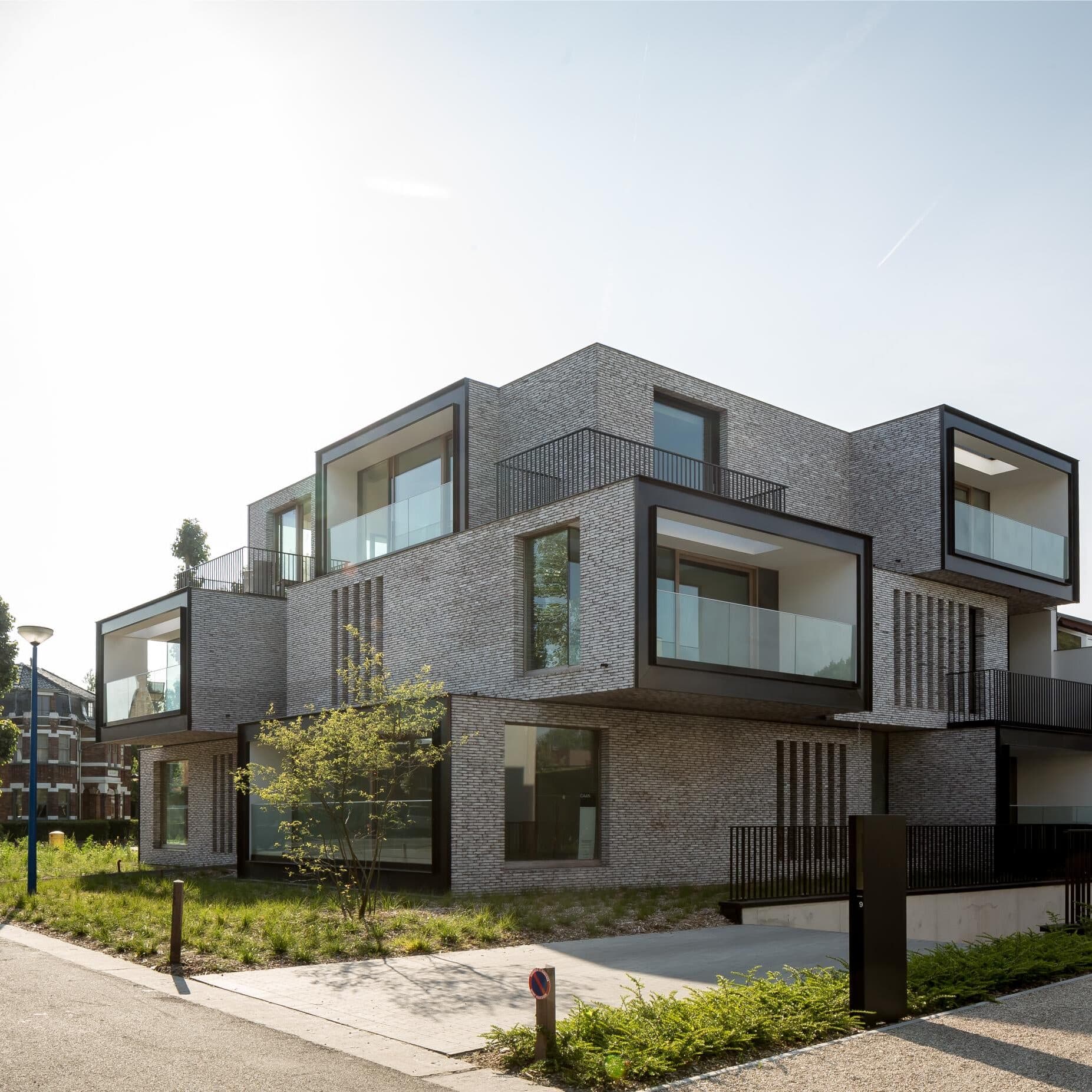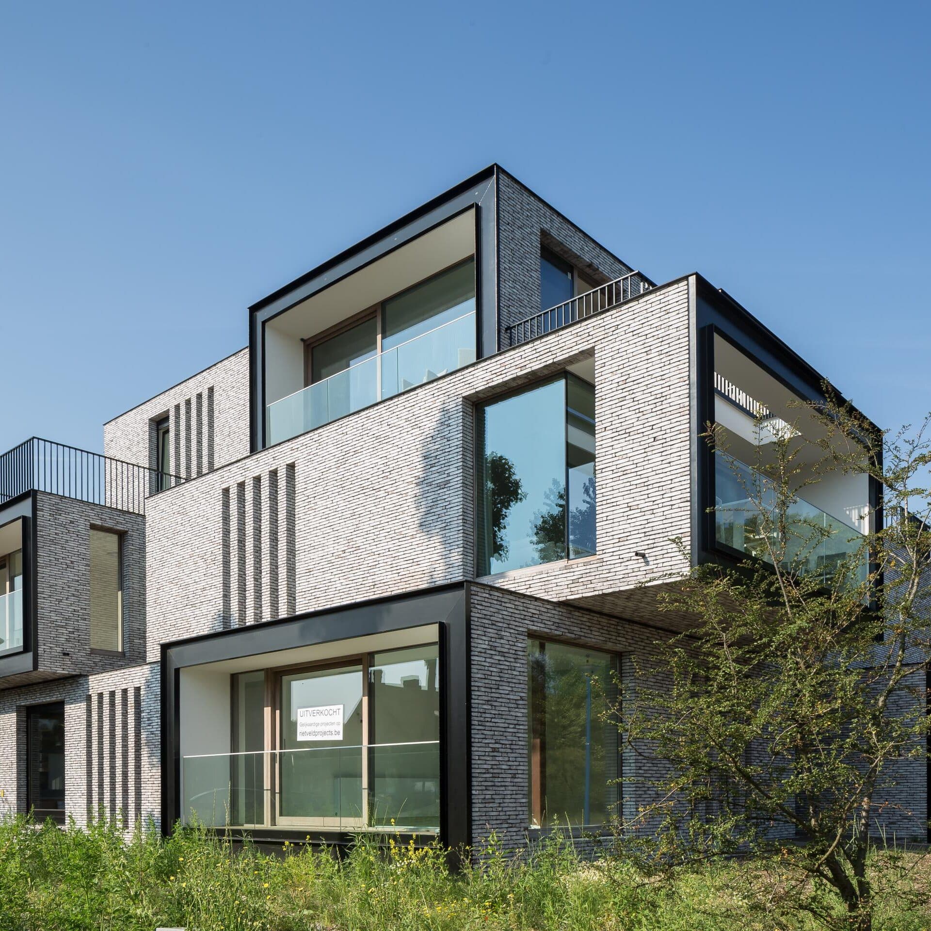 Het buitenschrijnwerk bestaat uit zwart gelakt aluminium, met als alternatief afrormosia houten schrijnwerk, wit geolied, voor wie een meer natuurlijke toets verkiest. De kopse kanten van de raamkaders, die bewust uit het gevelvolume springen, worden afgewerkt in zwarte metaalplaat, wat het architecturale lijnenspel extra benadrukt.