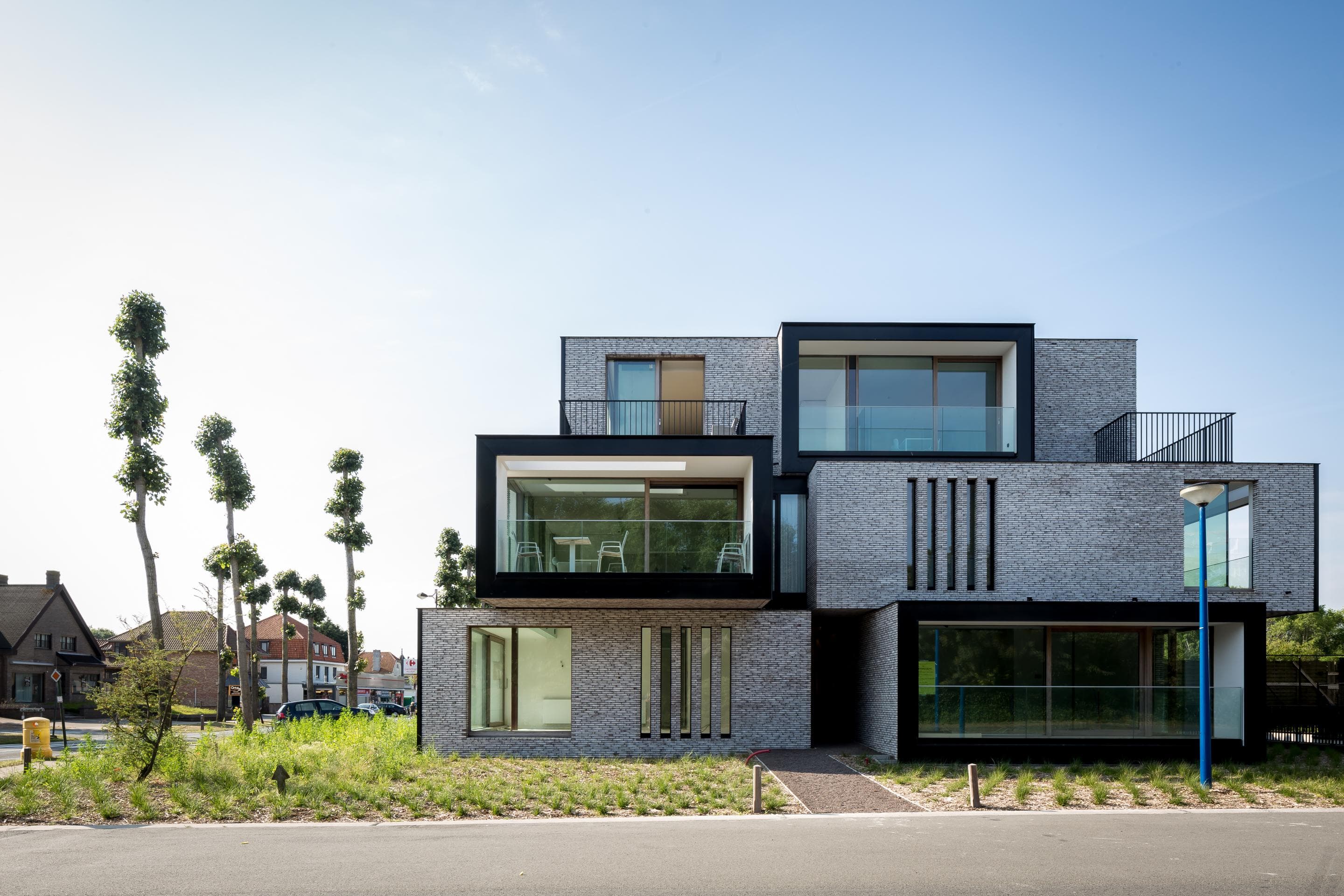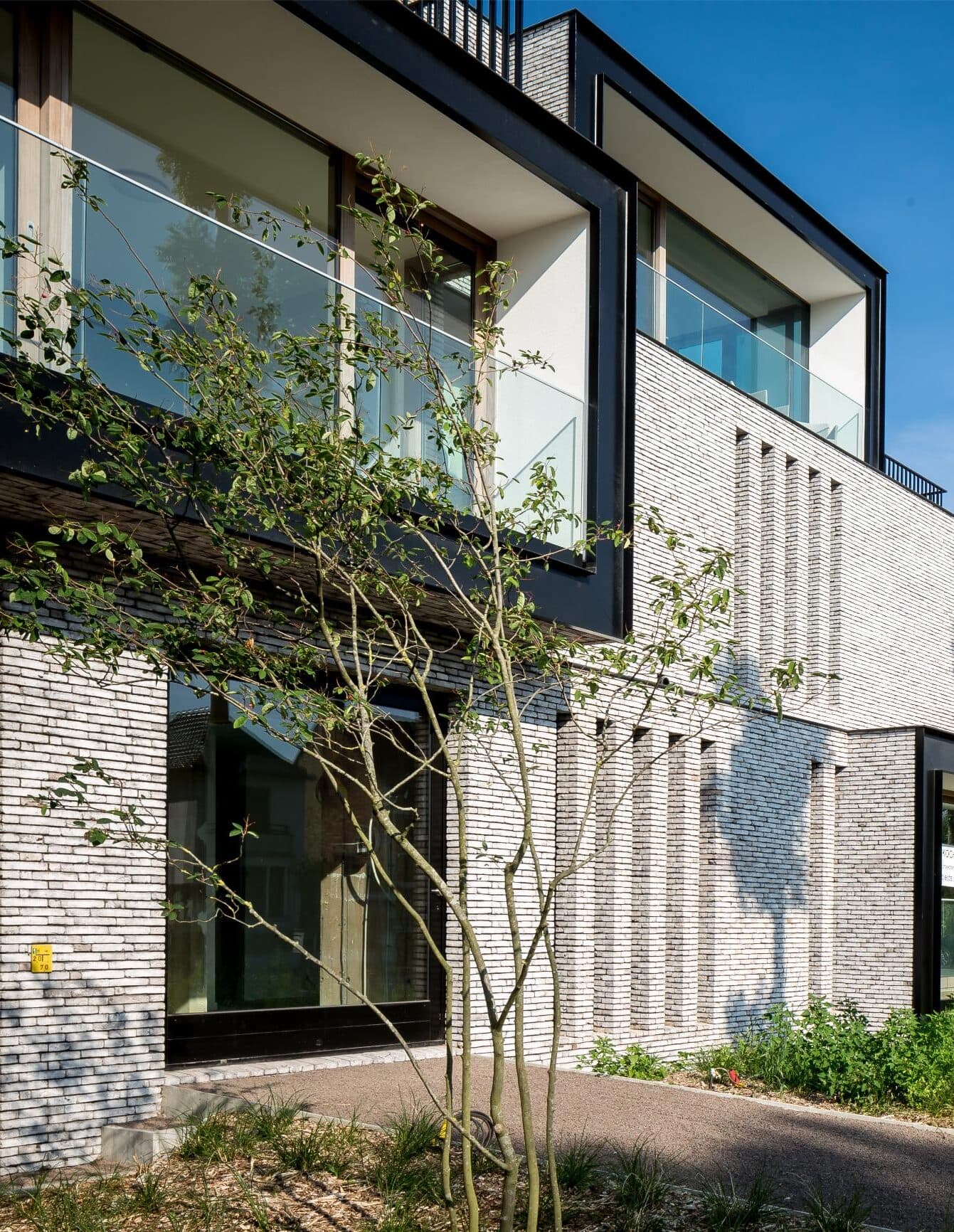 De architectuur is bewust consistent én speels opgevat. Verspringende raamkaders, langgerekte en meer gesloten gevelvlakken, subtiele gevelverspringingen tussen gelijkvloers en verdieping, evenals luifels en overkragingen creëren een uitgesproken ritmiek. Deze zorgvuldig opgebouwde gelaagdheid zorgt voor een dynamisch gevelbeeld dat tegelijk rust en verfijning uitstraalt.
