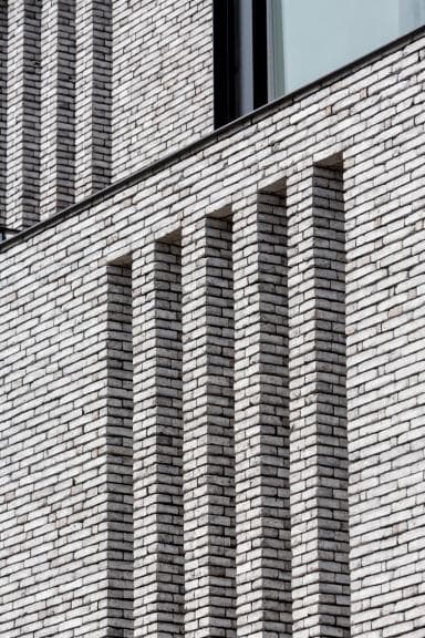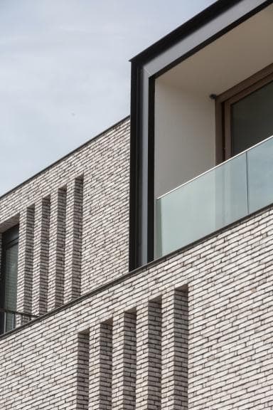 Voor het exterieur wordt gekozen voor een verfijnde en duurzame materiaalcombinatie. De gevels worden uitgevoerd in lichtgrijs handvorm gevelmetselwerk, wat zorgt voor een warme en genuanceerde uitstraling.