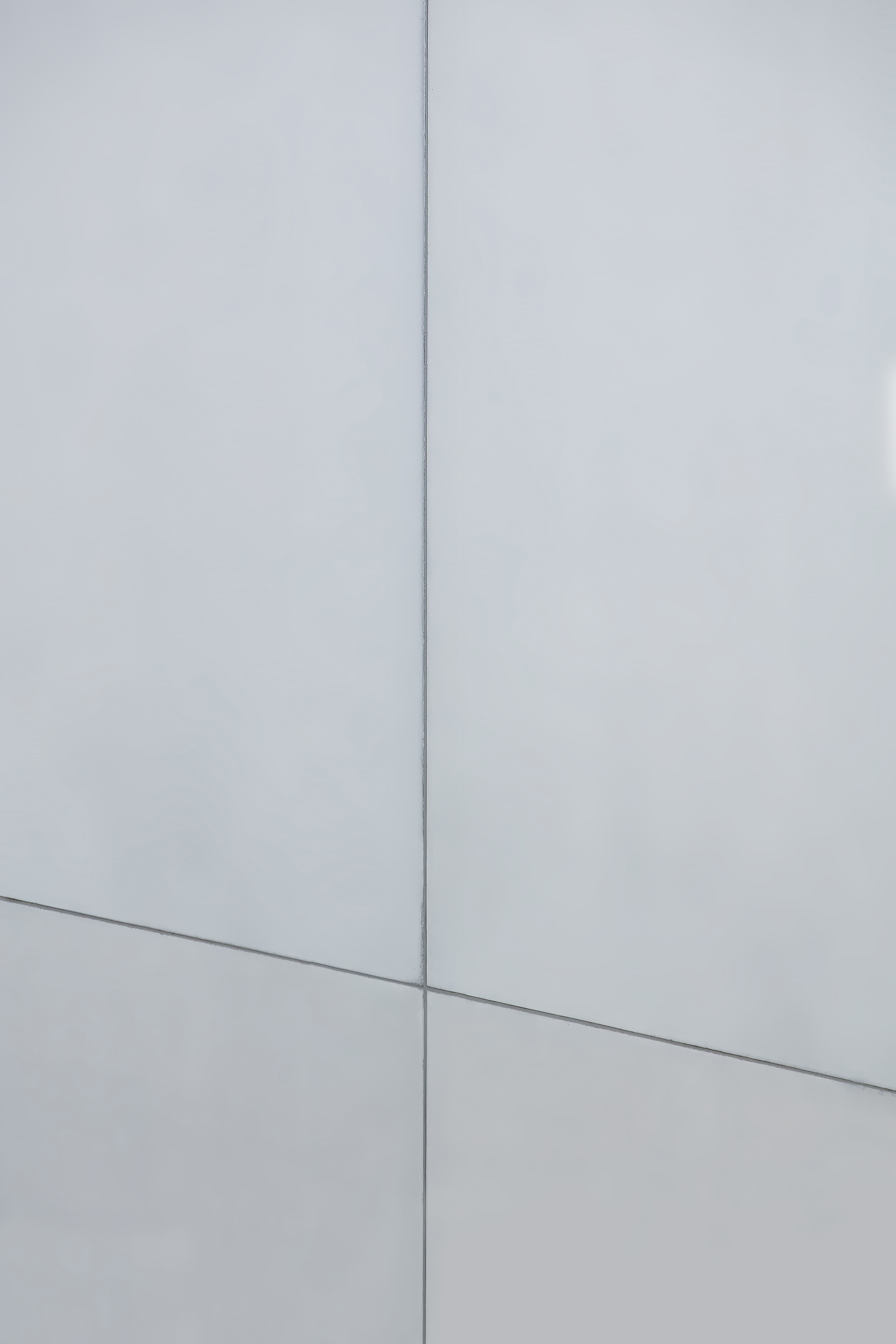De semi-gesloten wand van de gevel is uitgewerkt in verspringende vlakken voorzien, in lijn met de reliëfwerking van de semi-industriële gebouwen aan de overkant van de straat. Maar ook om aan te geven dat de bebouwing dieper in de Dorlodotlaan residentieel is.