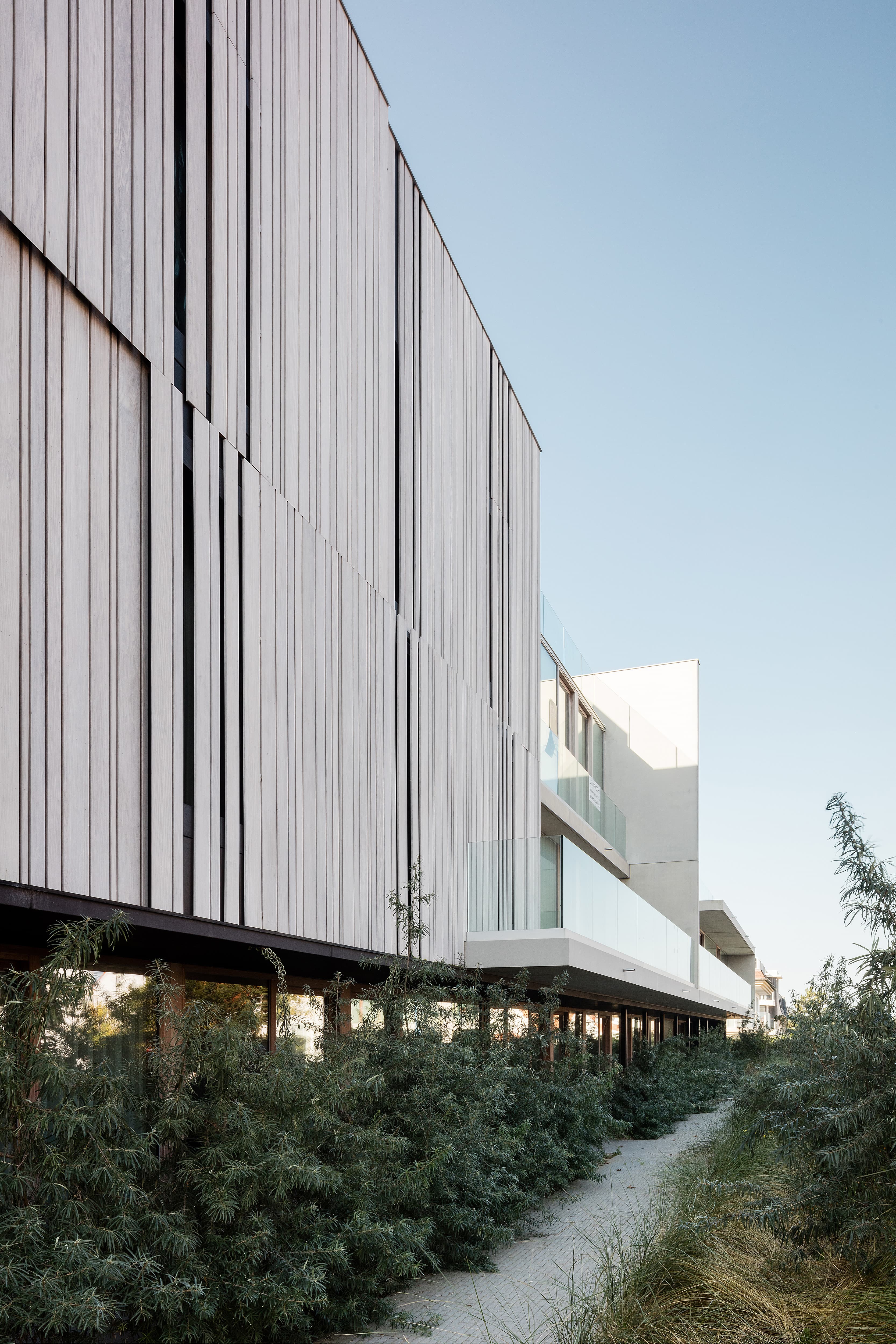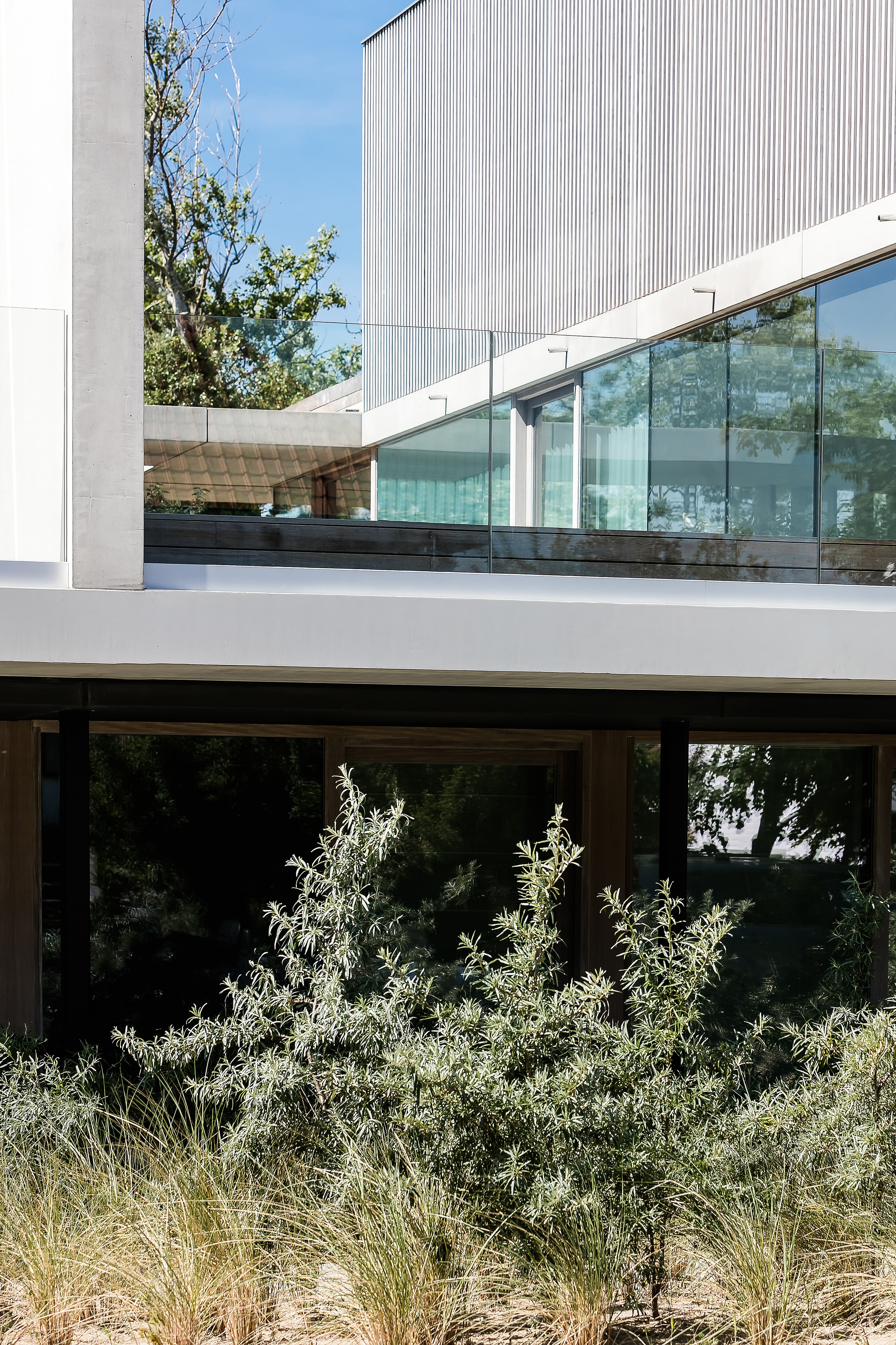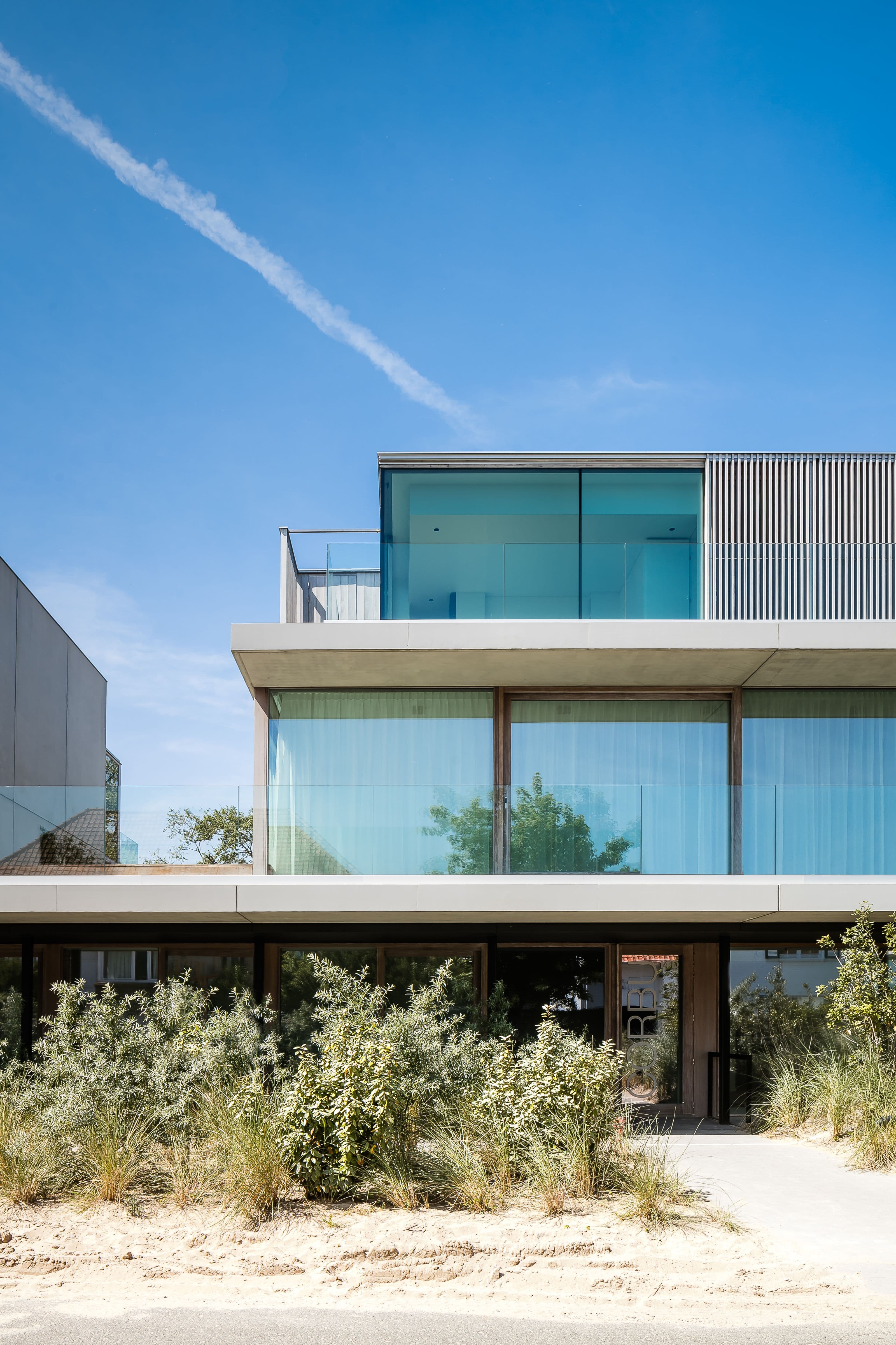 Tim van de Velde, CafeineVan een kleine afstand bezien zou je kunnen denken dan Residentie Corbu in de heropgebouwde duin-structuur geschoven is. Zo goed en fraai gaat het op in haar omgeving. De basis van het concept is een langwerpig sokkel-volume waarop een 2e rechthoekig verticaal volume is geplaatst.