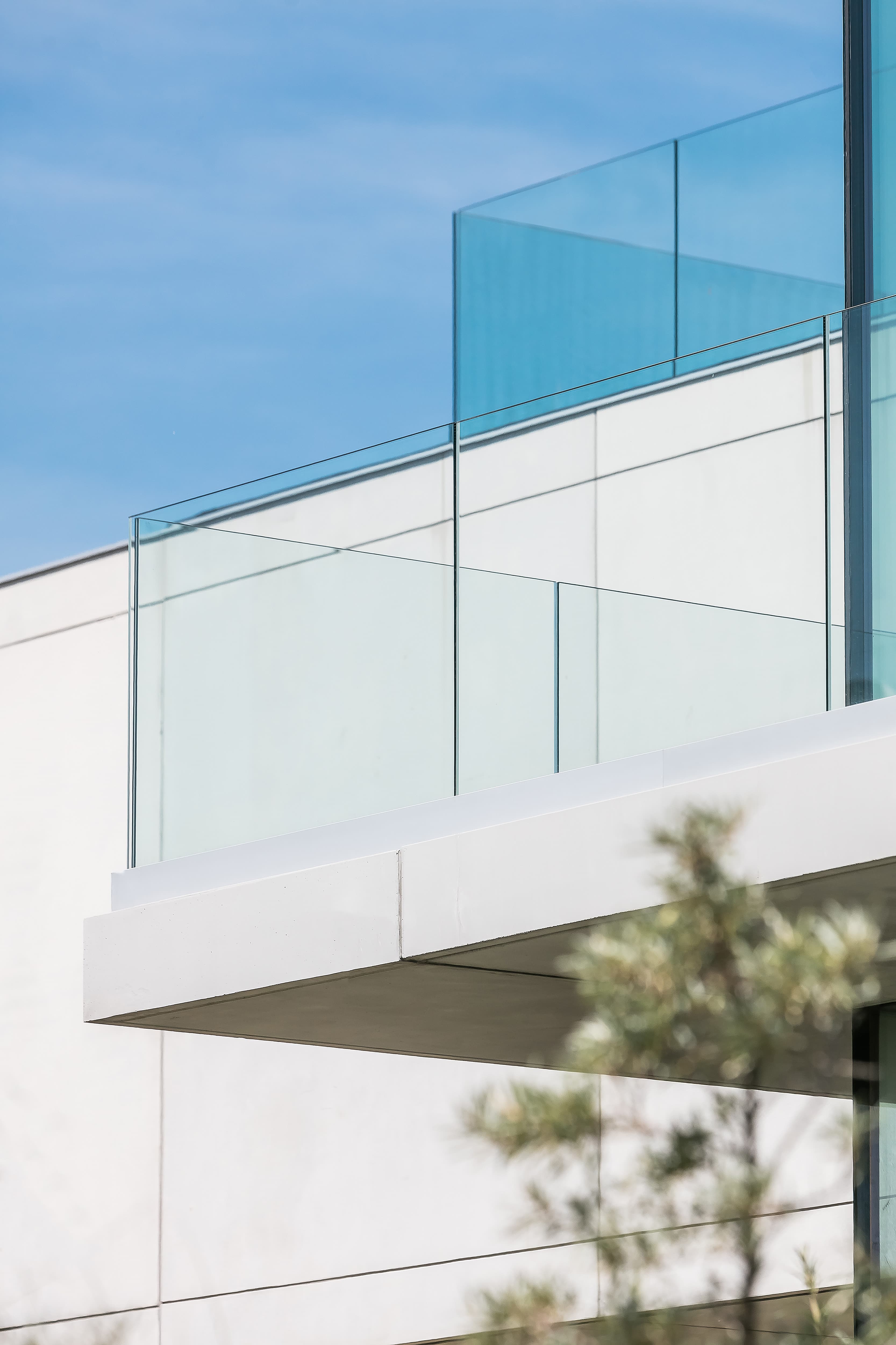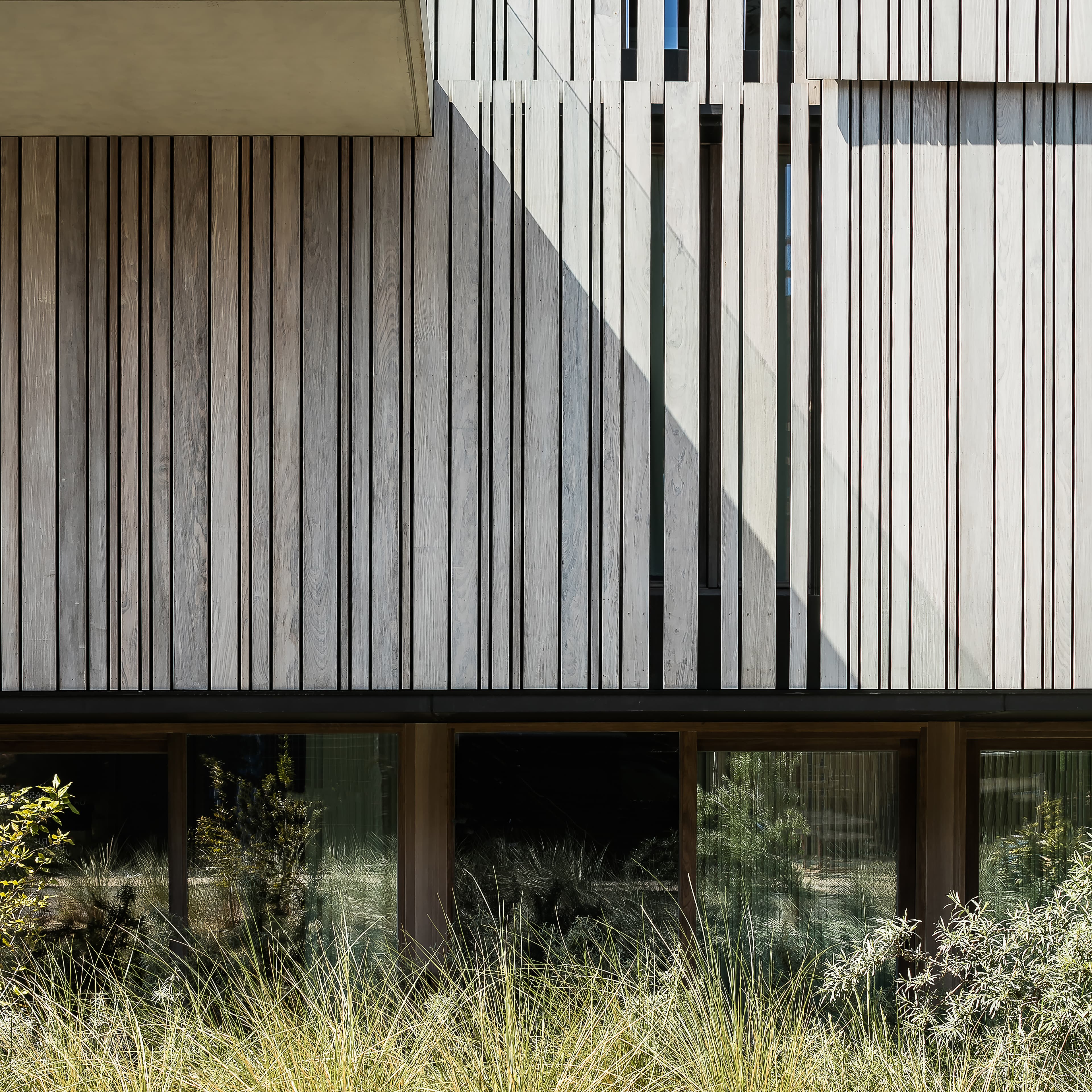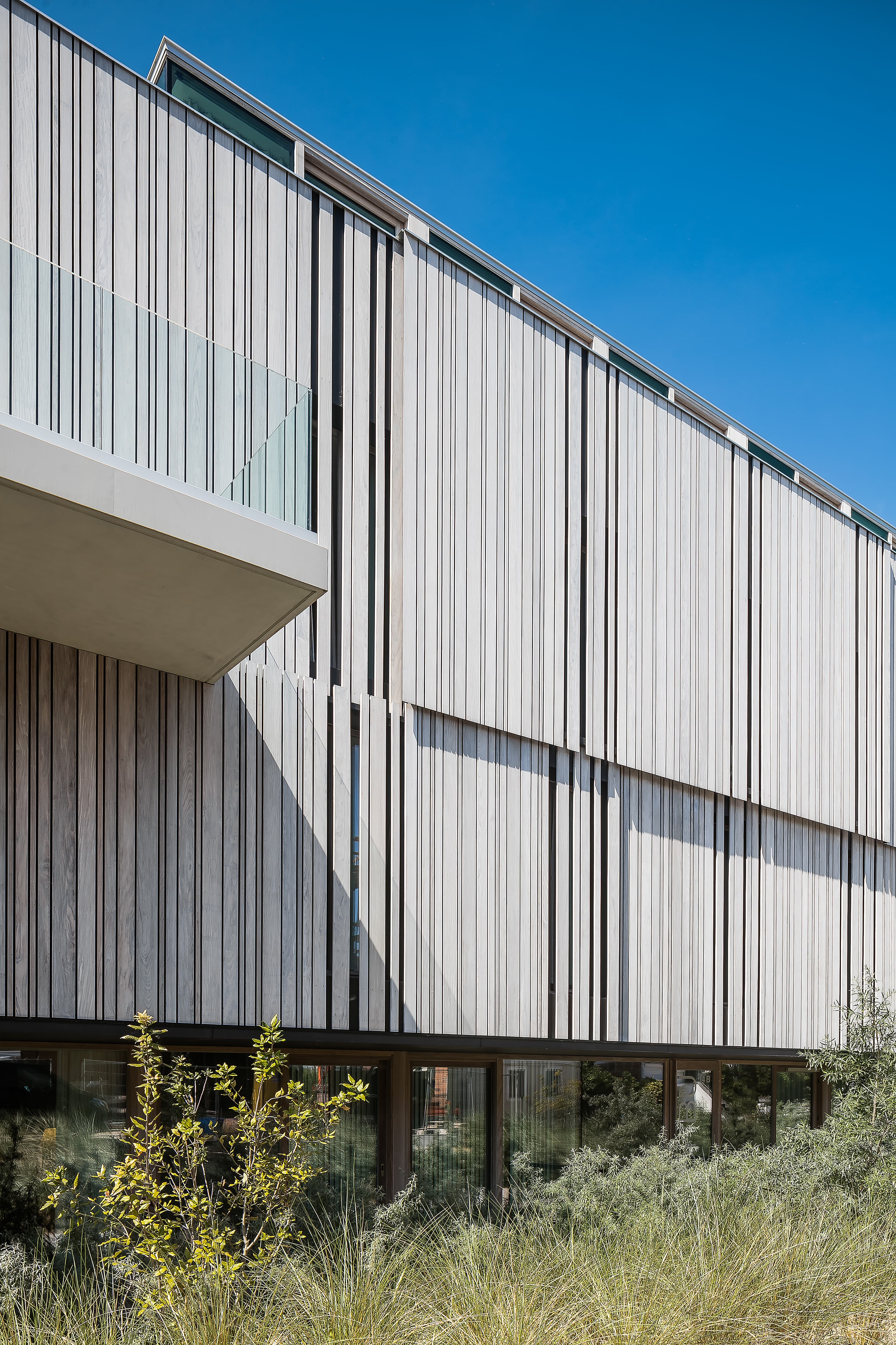 Het voorstel van materiaal- en kleurgebruik van het gebouw is zorgvuldig gekozen in harmonie met de natuurlijke omgeving. De wanden van het sokkelvolume zijn uitgevoerd in een donkerkleurige zichtbeton. De terrassen en de achterliggende gevels van de bovenbouw zijn van lichtgrijs glad zichtbeton. De semi-gesloten voorgevelwand van het bovenbouw volume heeft een structuur die voor het grootste deel bestaat uit houten, verticale geprofileerde planken. Het hout is behandeld met een olie-gedragen bleacher. De vlakken in deze afwerking verspringen, waardoor een gevoel van een reliëf ontstaat. De terrassen worden omlijst door houten ramen en ingeklemde beglazing.