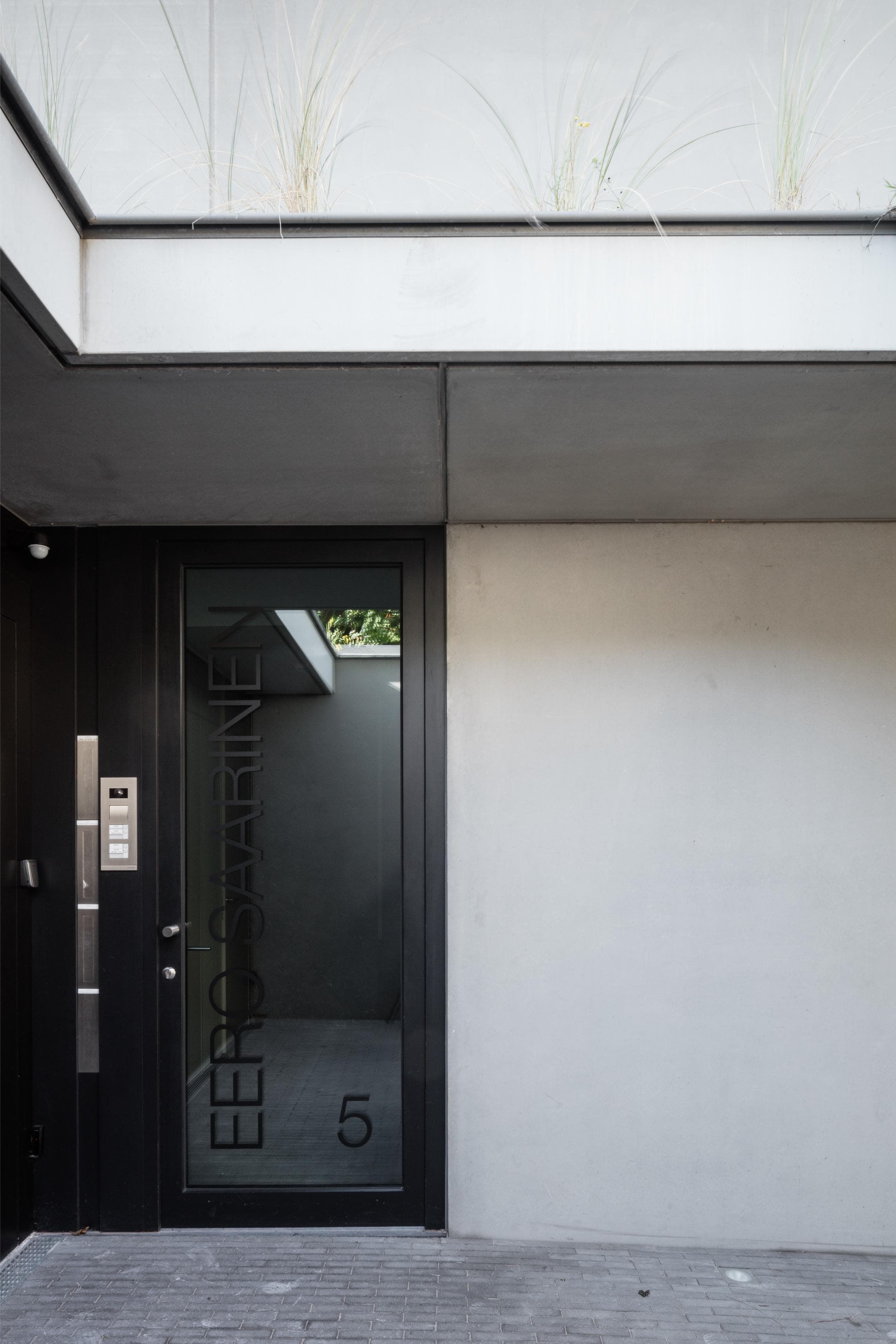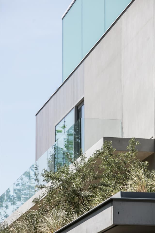 Uit respect voor de privacy van de zuidgerichte gevel van de linker aanpalende buur werd de oostgevel bewust meer gesloten gehouden. Enkel een verticale, spleetvormige opening en een raampartij met bijhorende terrasuitbouw op de uiterste achterzijde doorbreken hier het basisvolume.