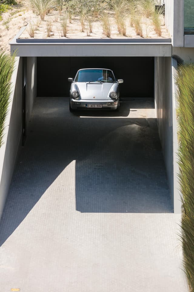 Aan de zuid- en westzijde daarentegen opent het gebouw zich royaal naar het landschap: zichtlijnen vloeien over het aangrenzende natuurgebied, richting zee en de open zuidwestoriëntatie. De toegang tot de meergezinswoning is verbonden met de inrit van de ondergrondse parking en ligt op ca. 1,20 m boven het niveau van de rijbaan, waardoor een lichte, verheven entree ontstaat.