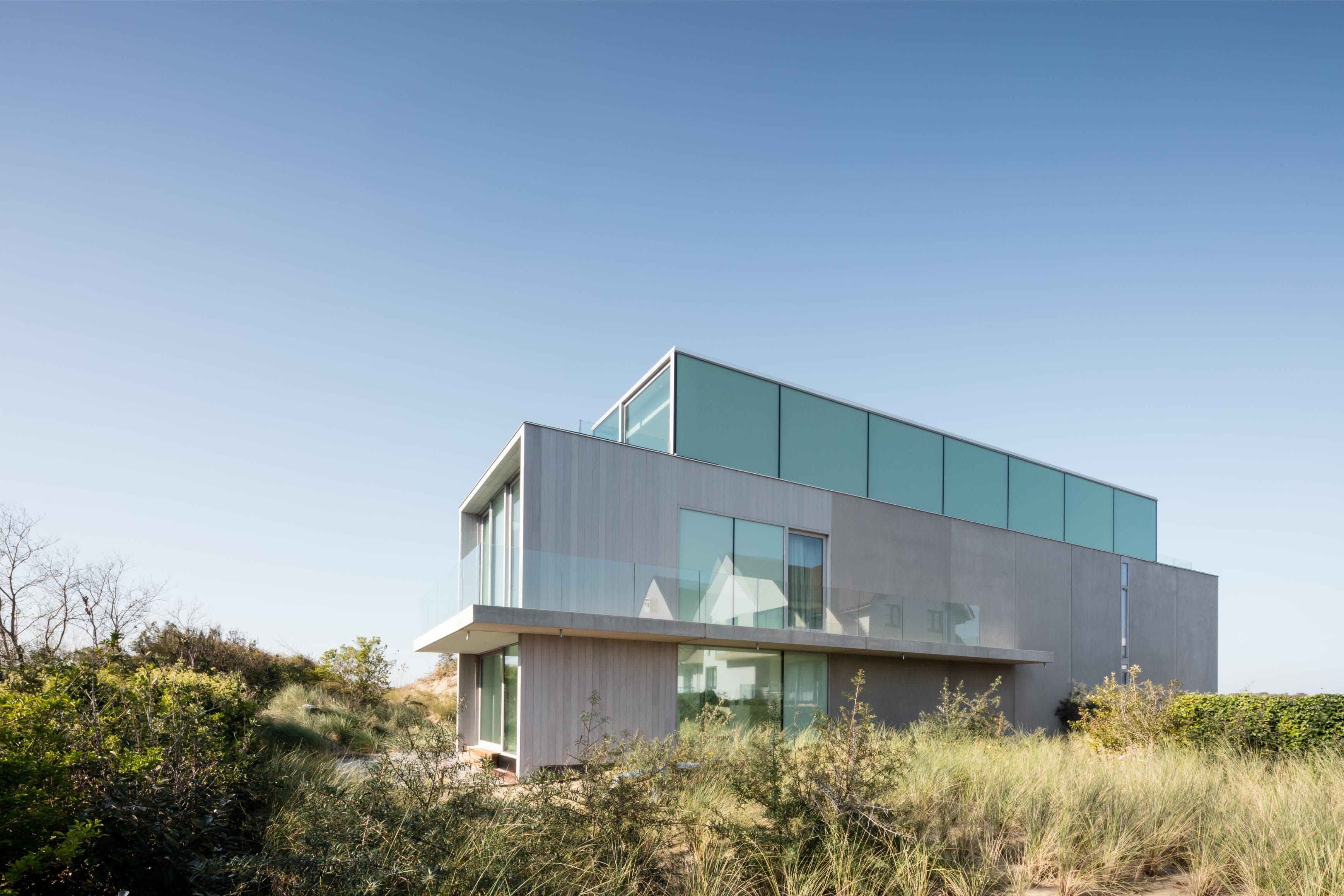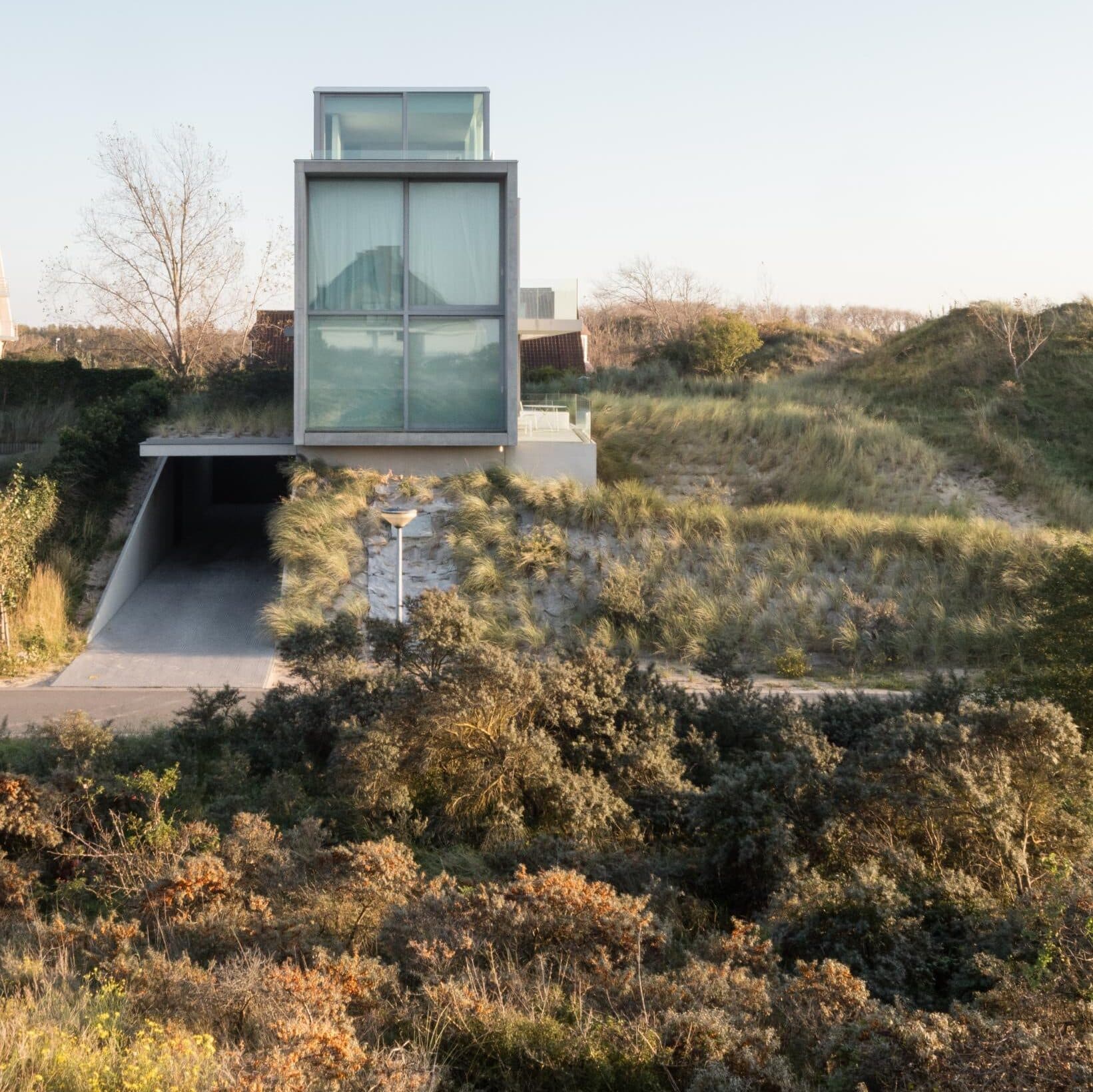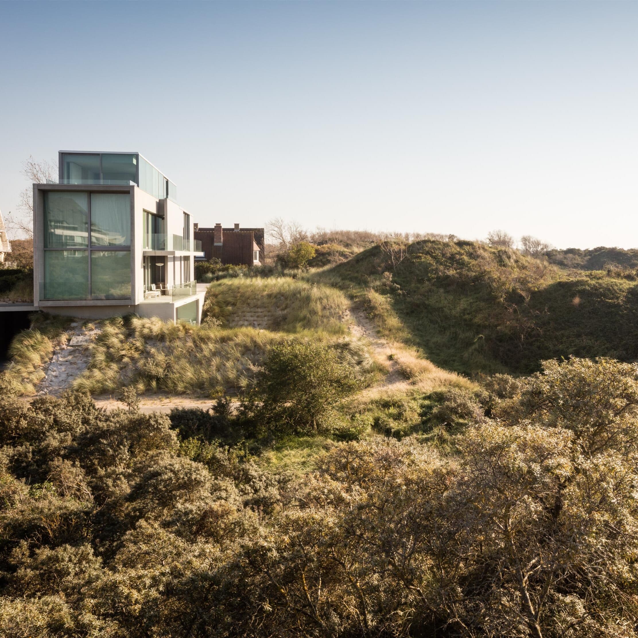 Zwevend balkvolume, geschoven in het duinlandschap