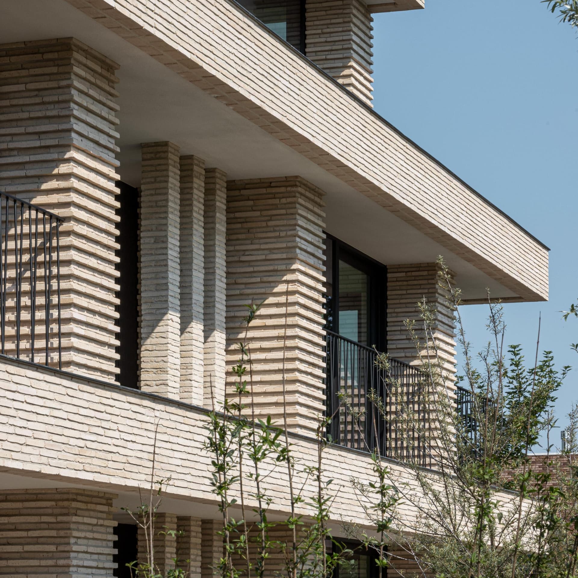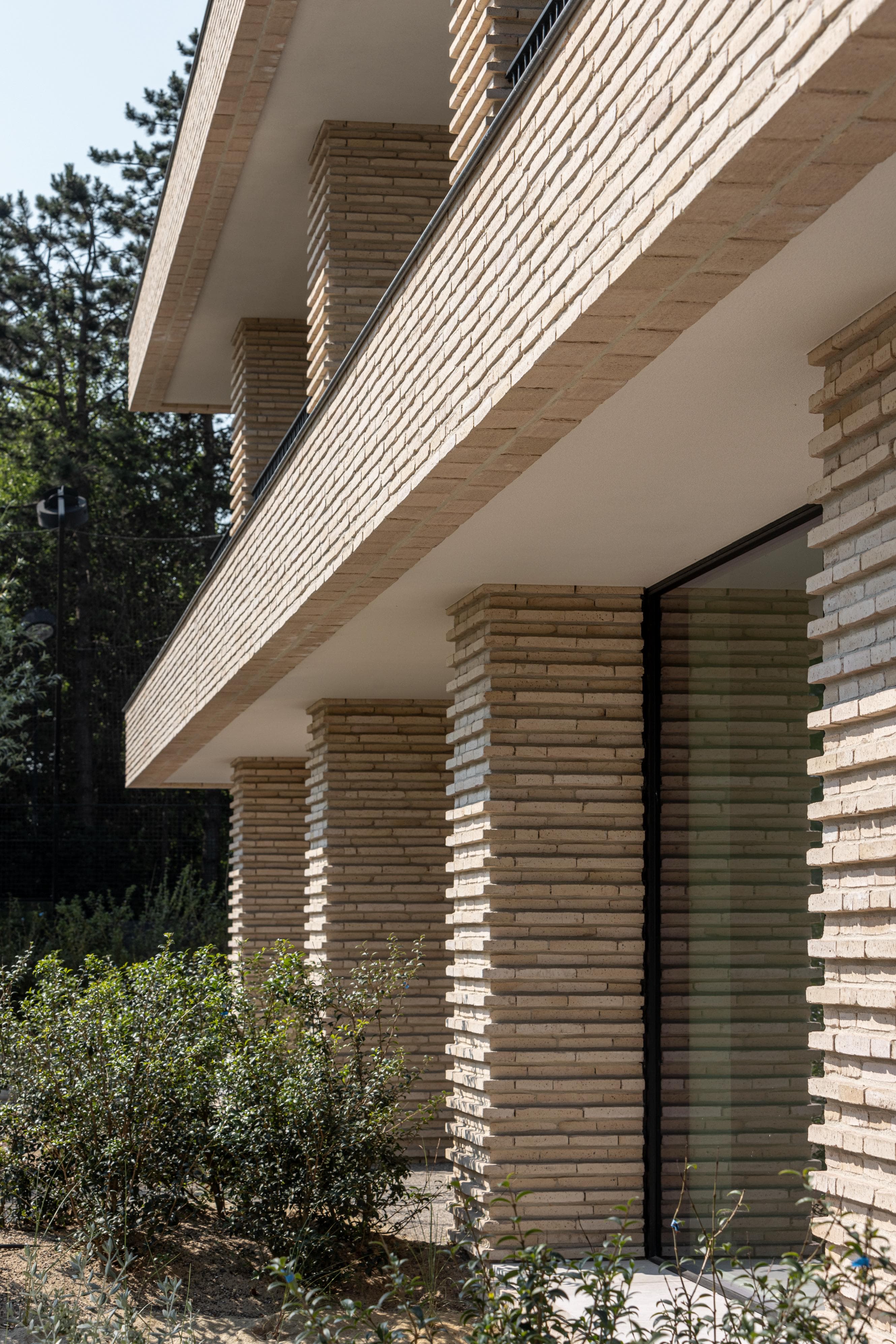 Hierdoor speelden bakstenen een belangrijke rol in de uitvoering van zijn architecturale ideeën. De gevel is een canvas van ingetogen afwisseling dankzij vlakke gevelborden, verspringende penanten (metselwerk rond bijv. ramen) en de zijdelingse massieve muren.