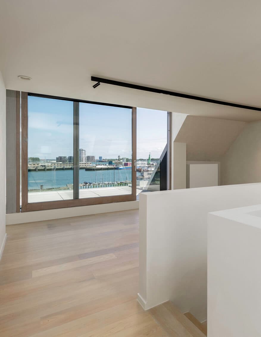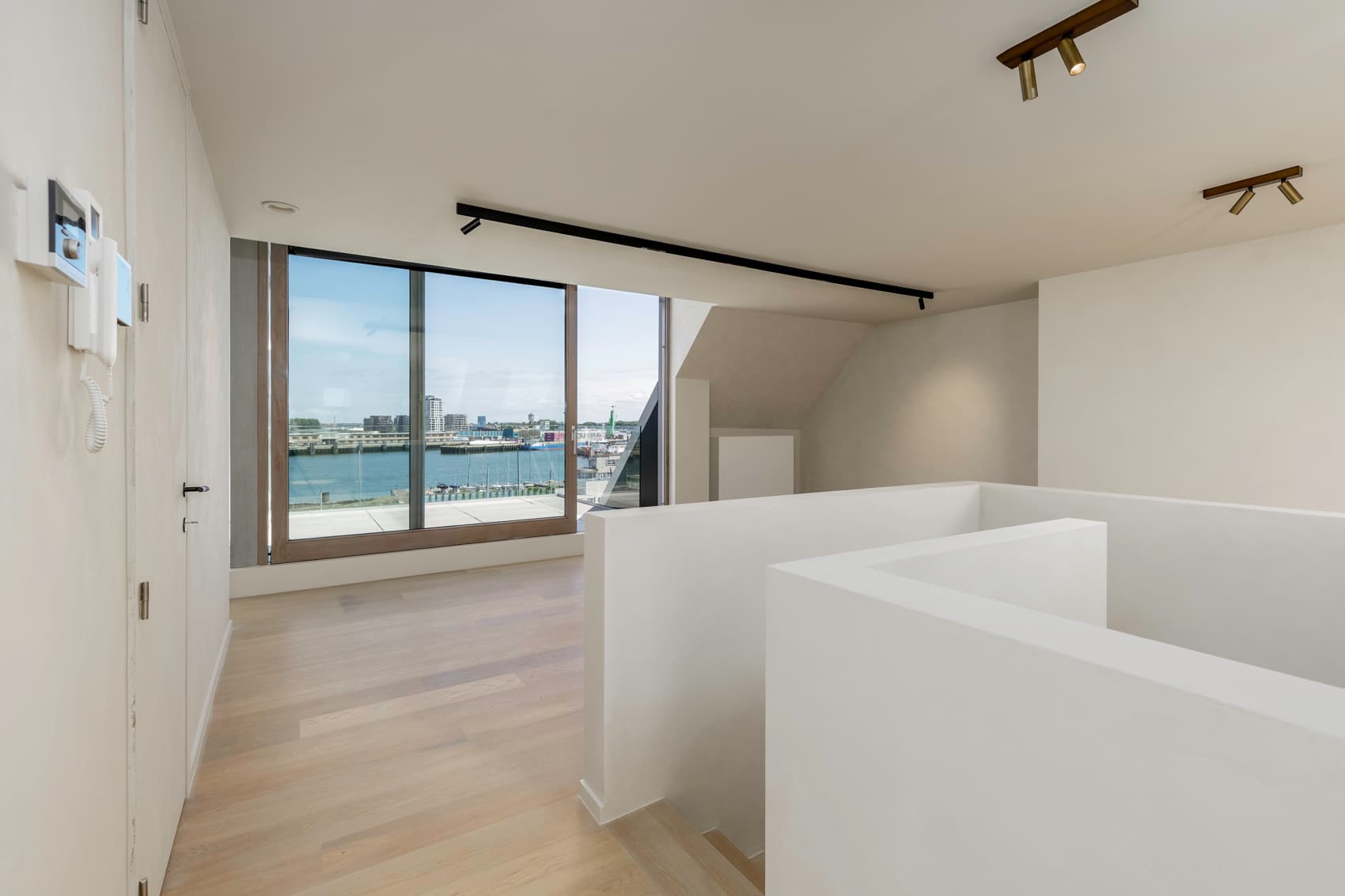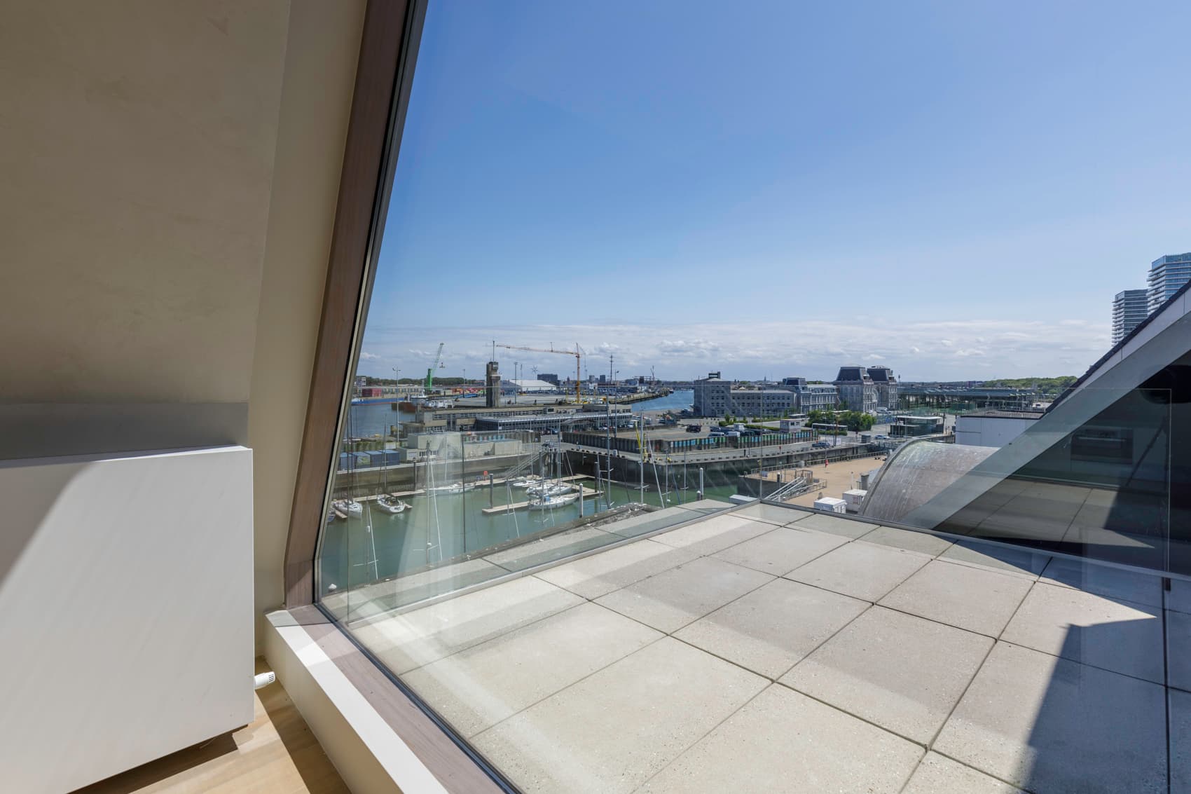 De lichtrijke leefruimte op de bovenverdieping biedt een spectaculair panoramisch zicht op de kustlijn, de vaargeul en het stadsbeeld. Aansluitend bevindt zich een royaal dakterras – uw privé-uitkijkpunt over zee en stad, ideaal om te genieten van rust, licht en lucht.