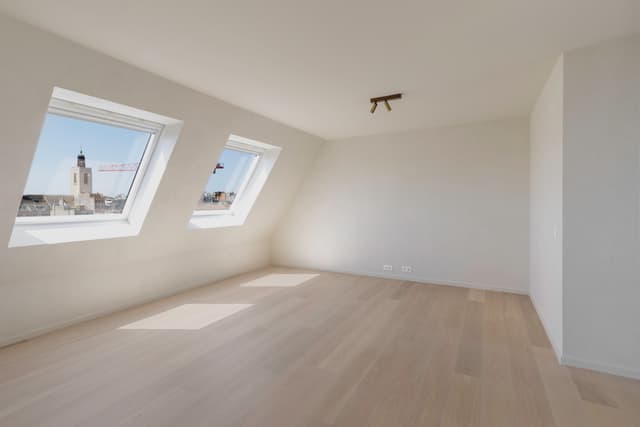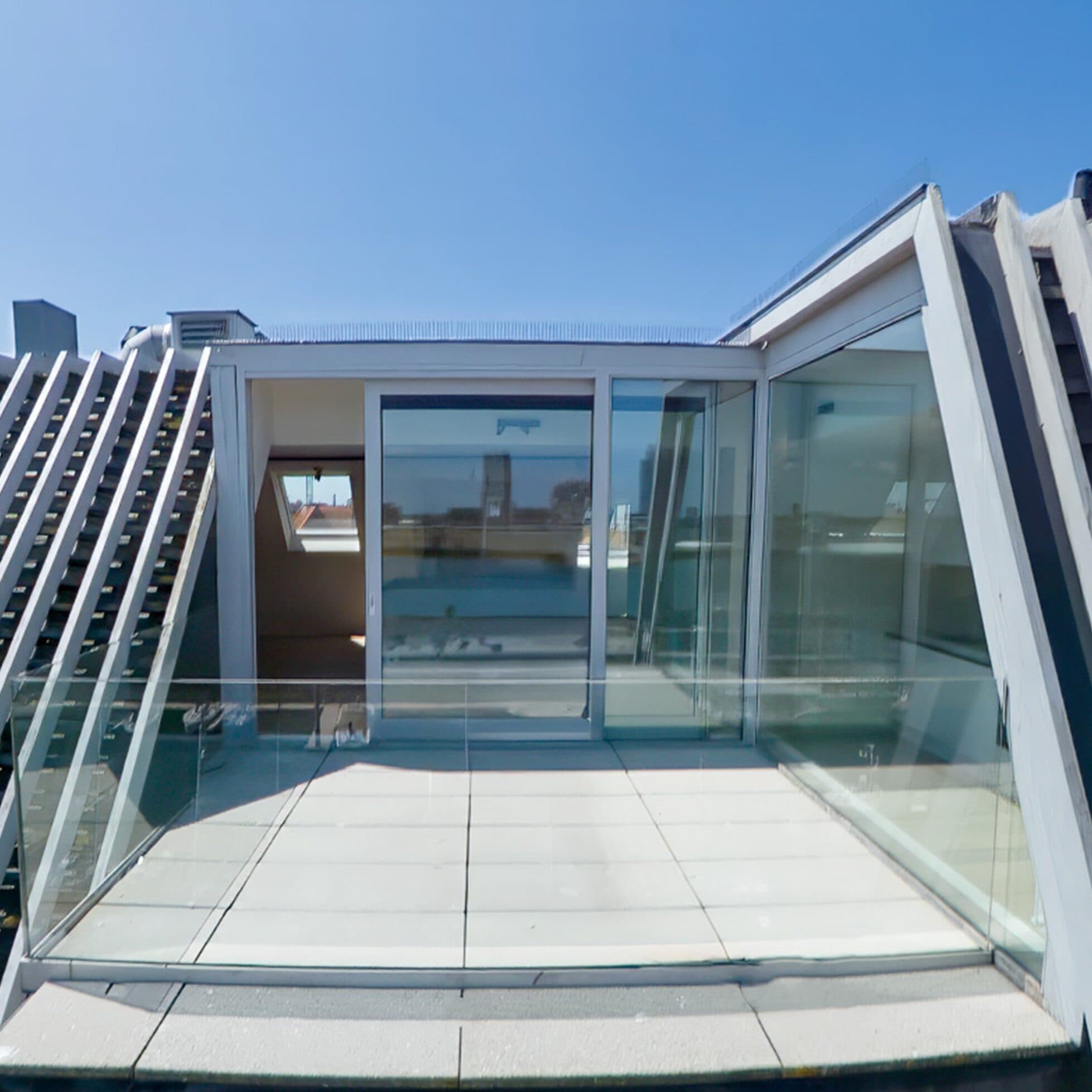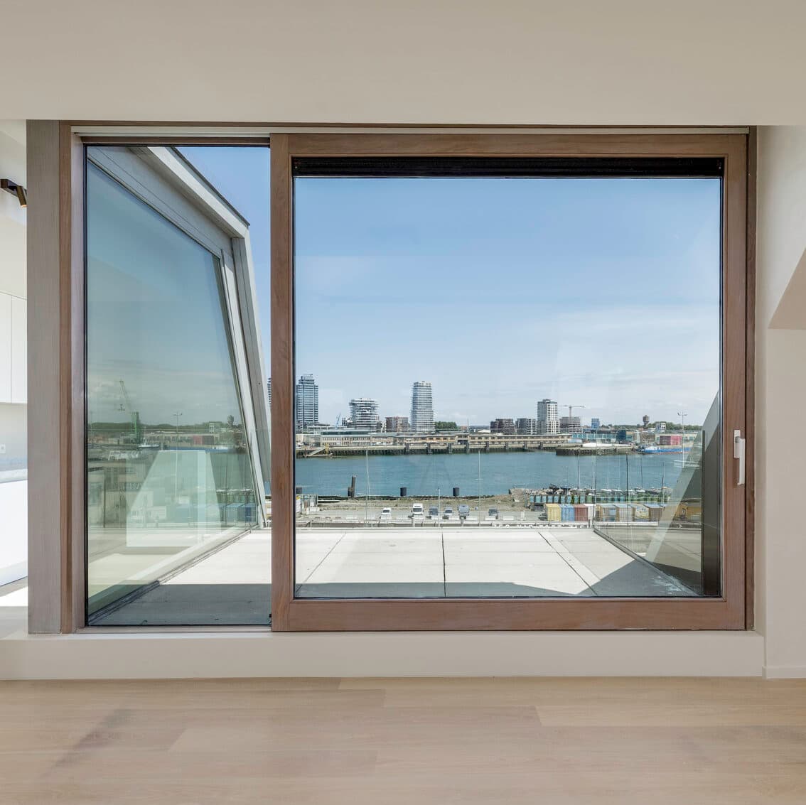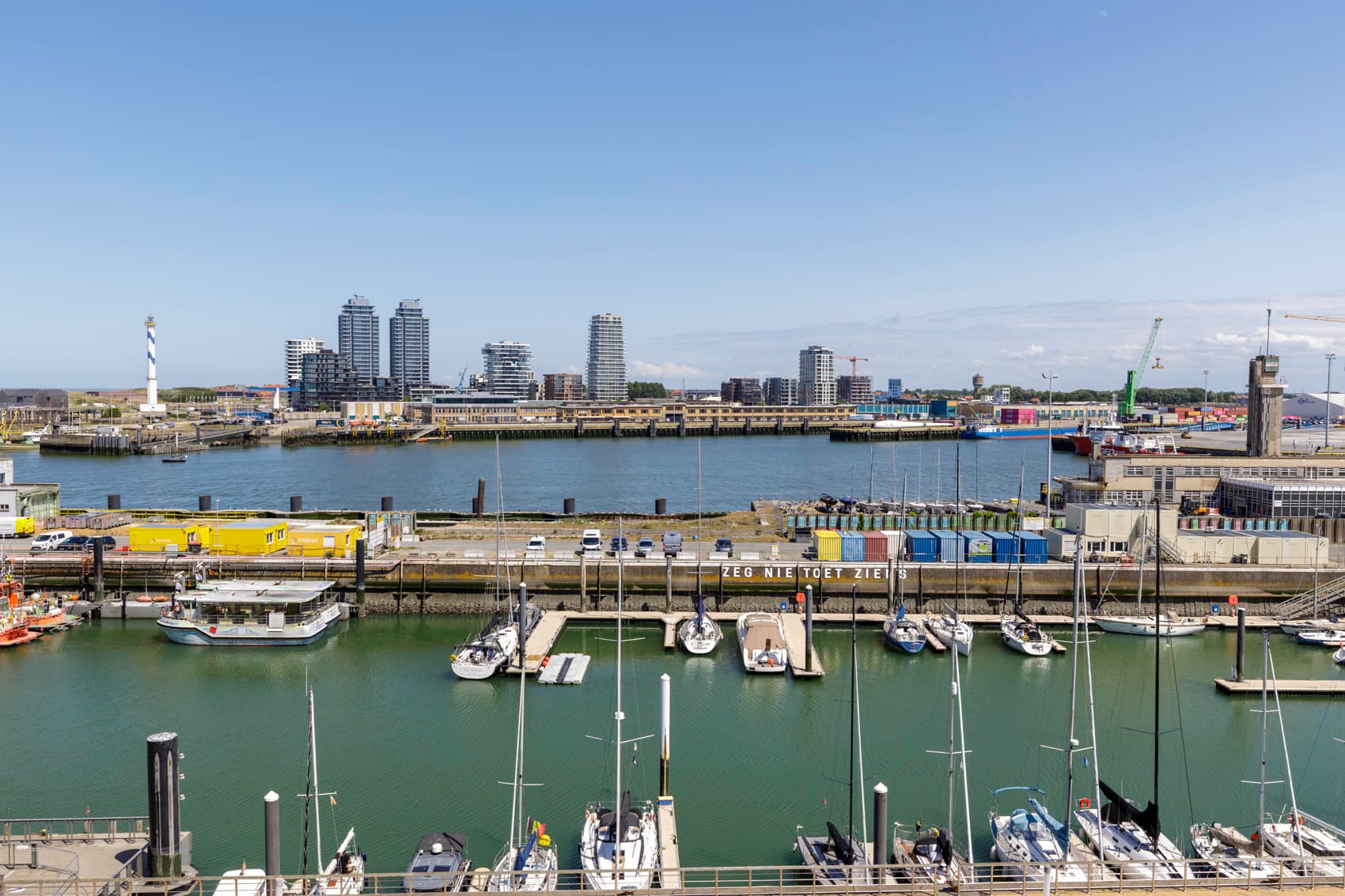 De lichtrijke leefruimte op de bovenverdieping biedt een spectaculair panoramisch zicht op de kustlijn, de vaargeul en het stadsbeeld. Aansluitend bevindt zich een royaal dakterras – uw privé-uitkijkpunt over zee en stad, ideaal om te genieten van rust, licht en lucht.