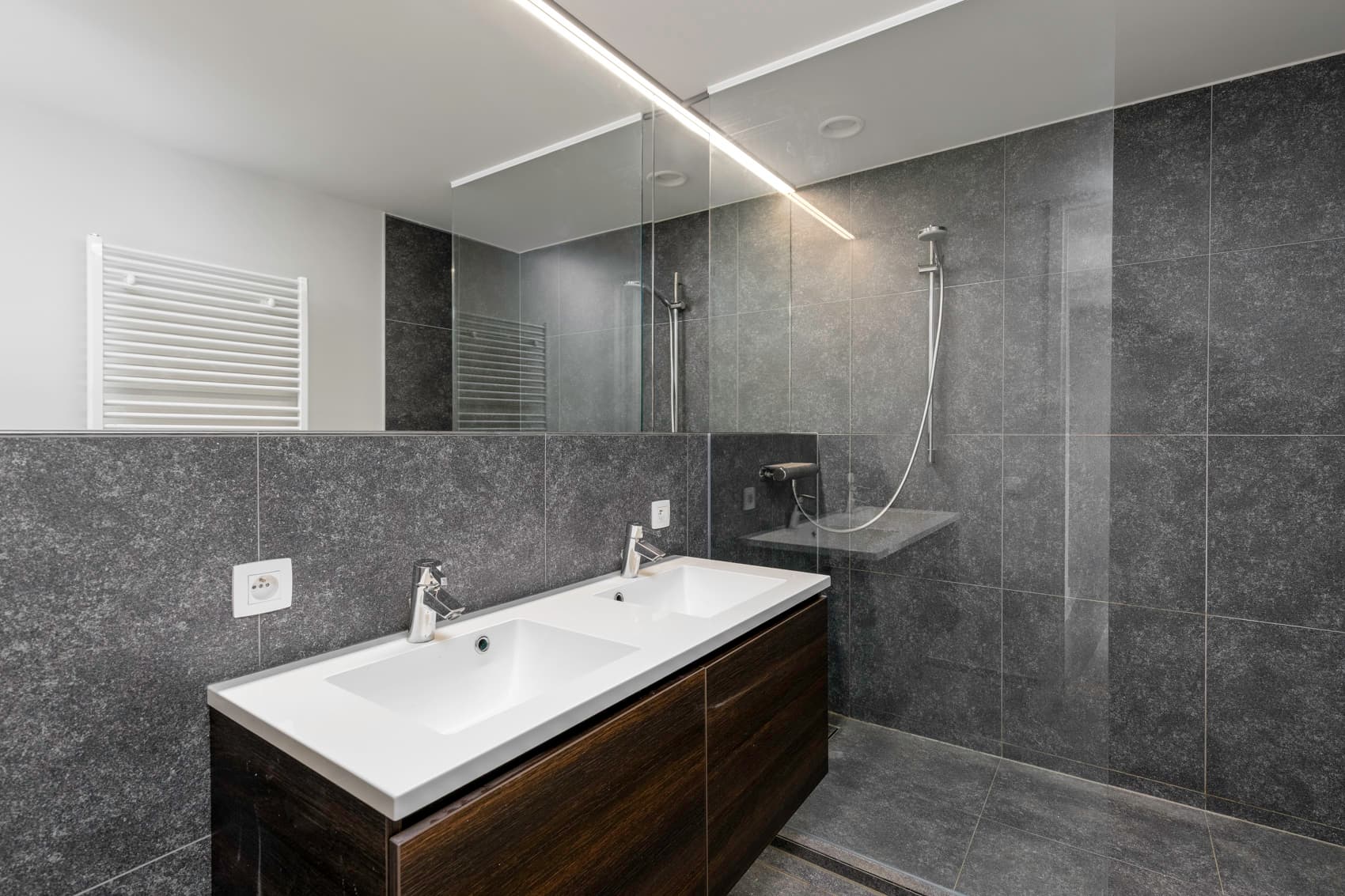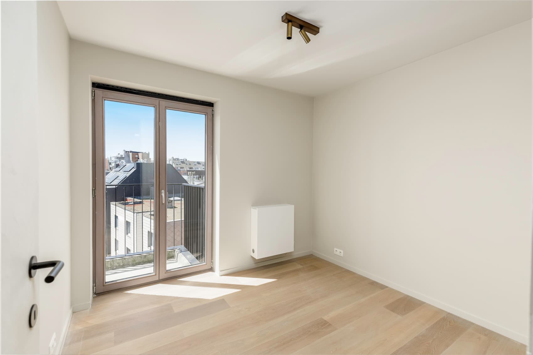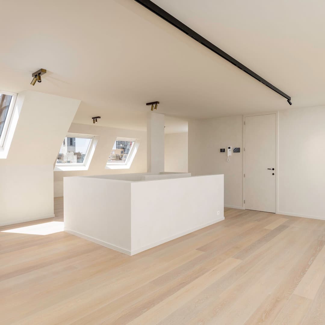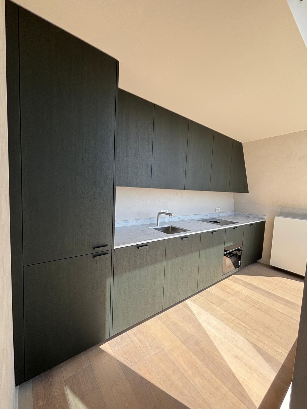 De nieuwe sistem keuken met miele toestellen – nog te plaatsen – wordt het centrale pronkstuk van het appartement. Voorzien van een marmeren werkblad en massieve kasten, combineert ze elegantie met functionaliteit.
