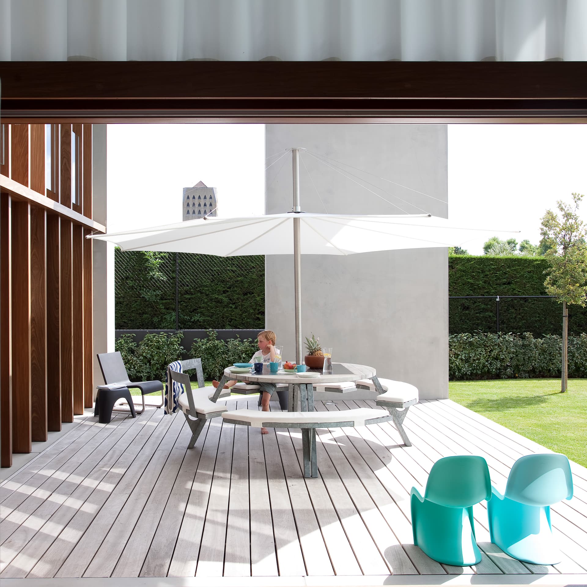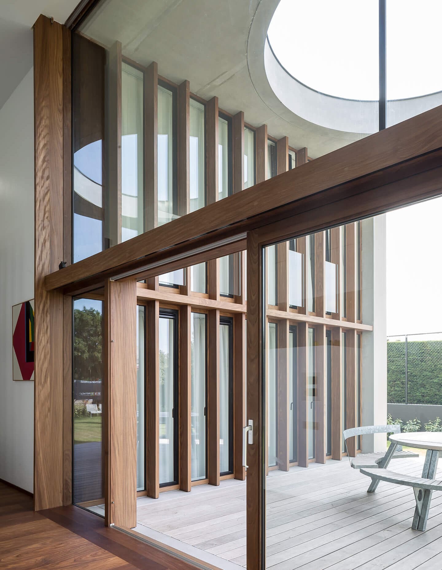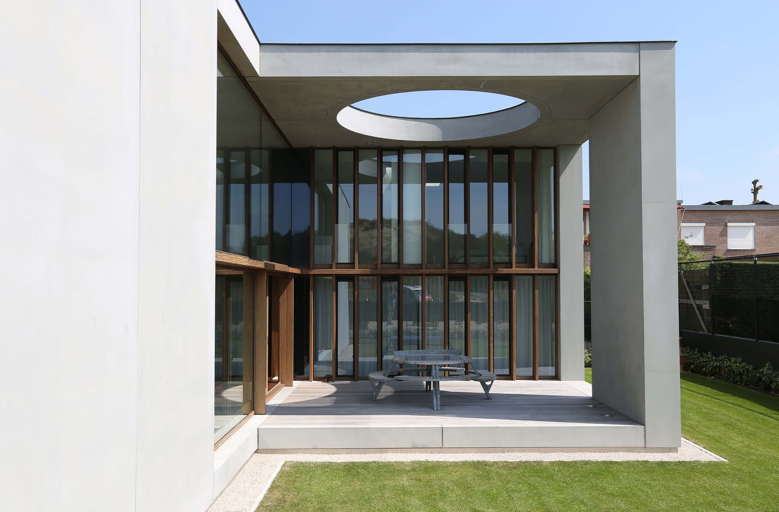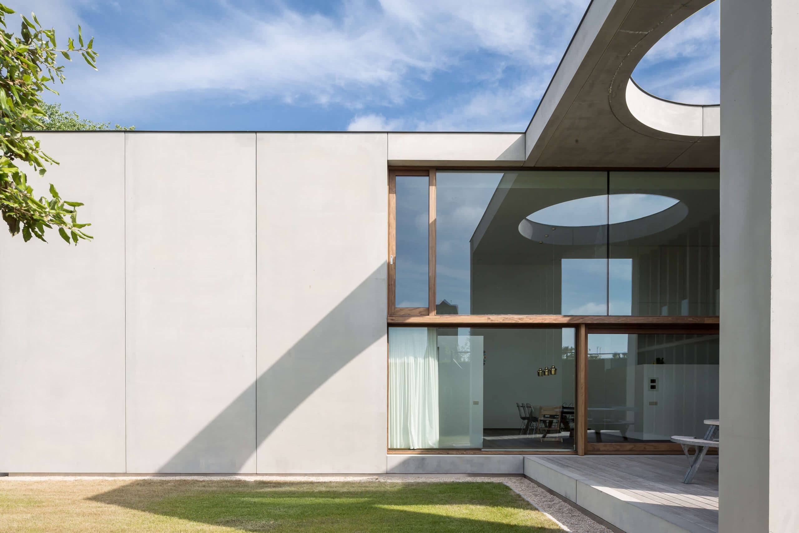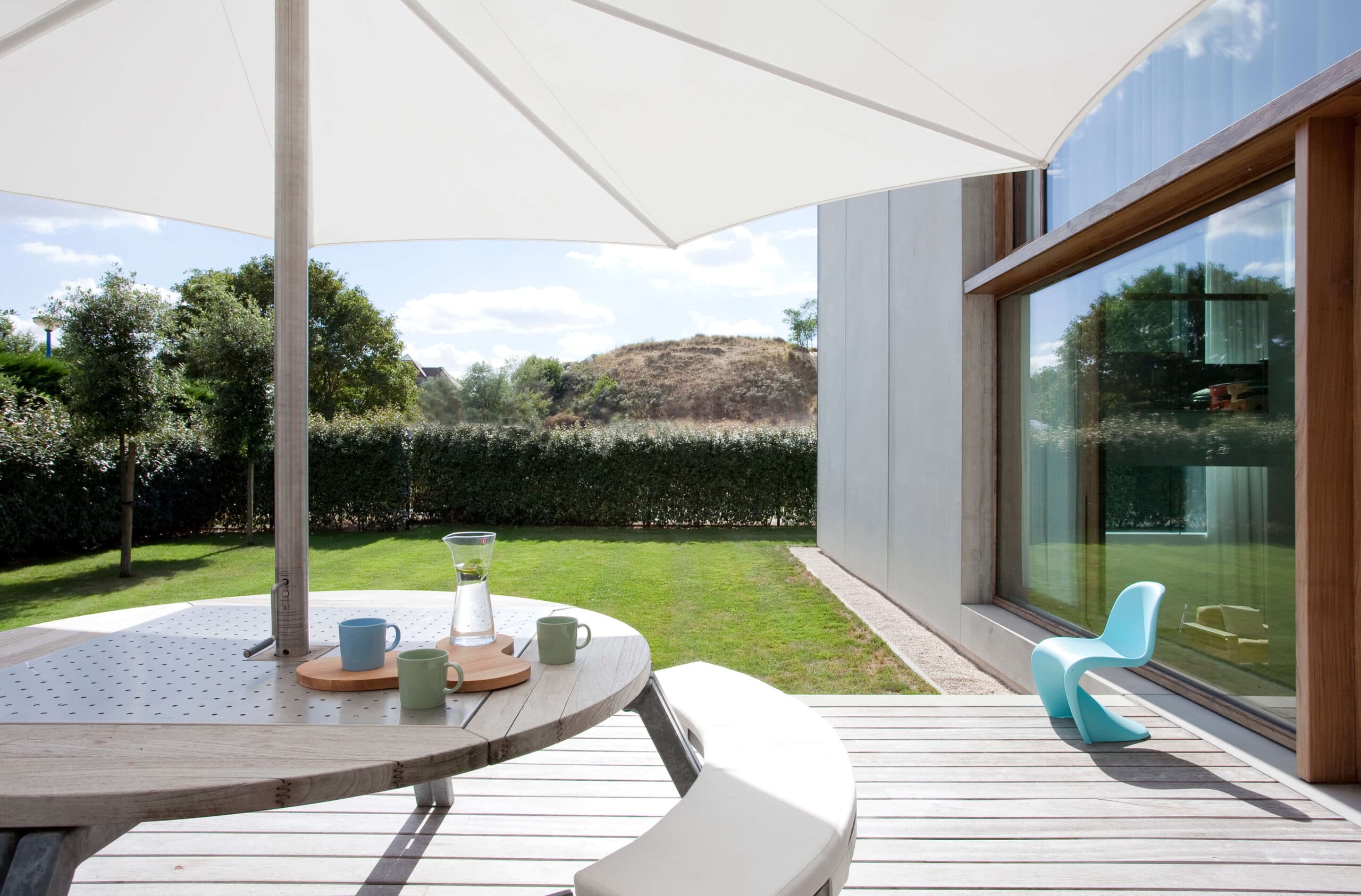 Privacy en geborgenheid botsen meestal met termen als transparantie en openheid. Maar alleen al het terras nodigt de buitenwereld en vooral de zon van harte uit. Dankzij een grote, ronde opening erboven waardoor de zon van opkomst tot ondergang te zien is. De grote en alom aanwezige raampartijen in de woning brengen ook binnen een zee aan licht.