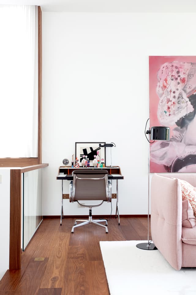 Over de gehele woning werd het afrormosia parket met zijn warm bruine tint doorlopend geplaatst. De muren bleven wit en de talrijke eigenzinnige kunstwerken (www.emergent.be) en design meubels (www.designcollectors.be) zorgen voor een elegante en kunstzinnige atmosfeer.