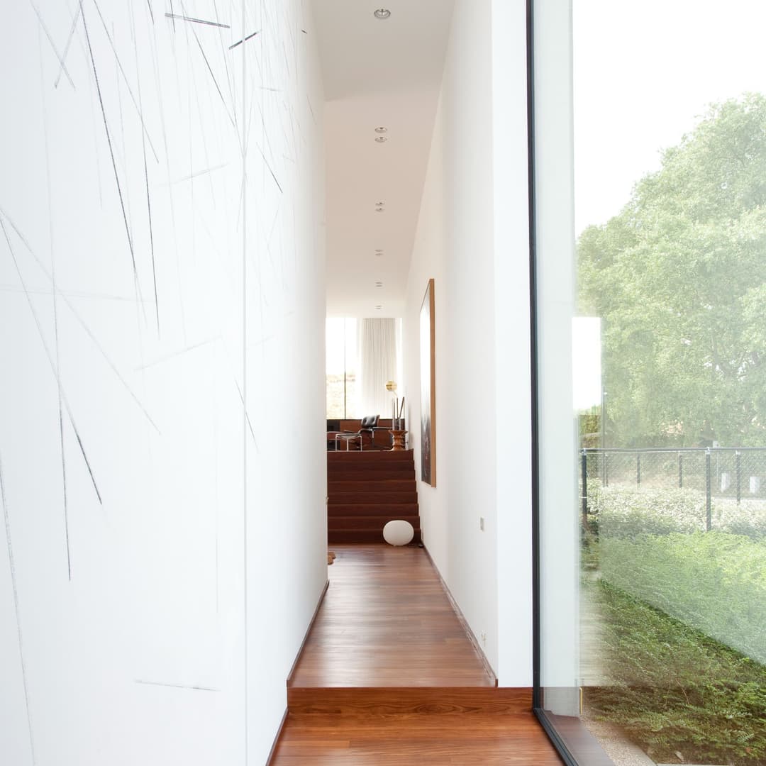 Bij het betreden van de woning val je van de ene verbazing in de andere. Langs de straatkant is er slechts 1 venster naar de buitenwereld. En wat een venster. Maar liefst 5 meter hoog en een extra canvas op het achterliggende echte canvas. Een kustwerk rechtstreeks aangebracht op de gehele muur.