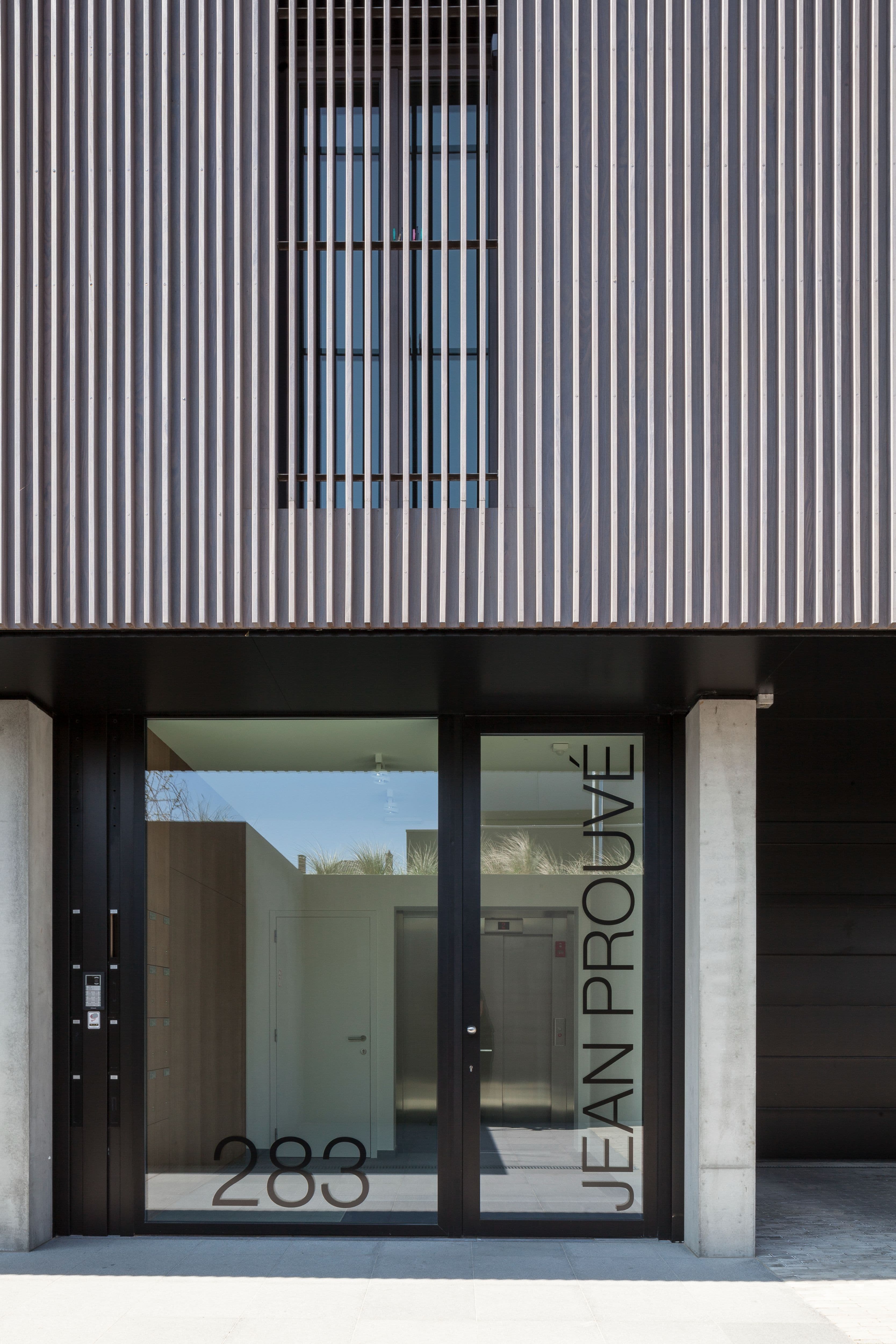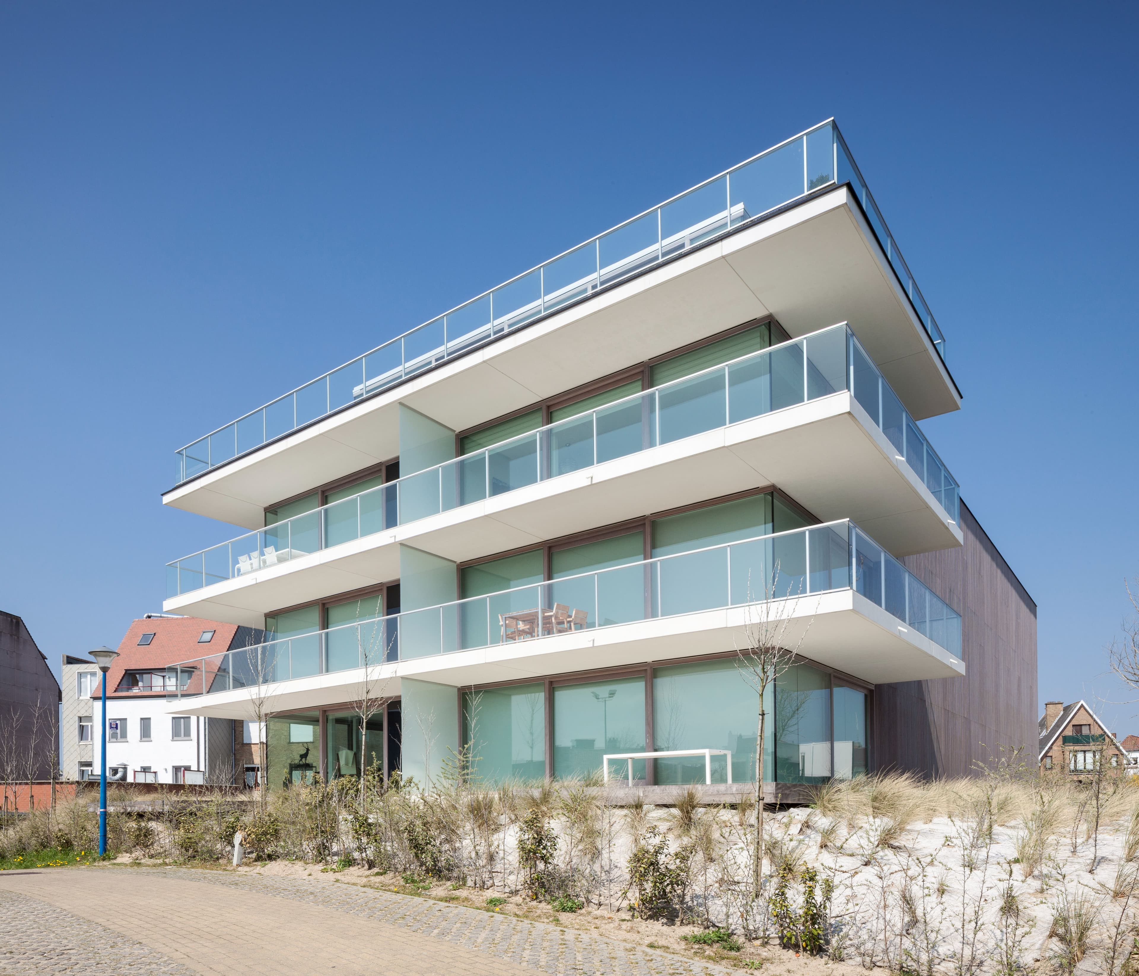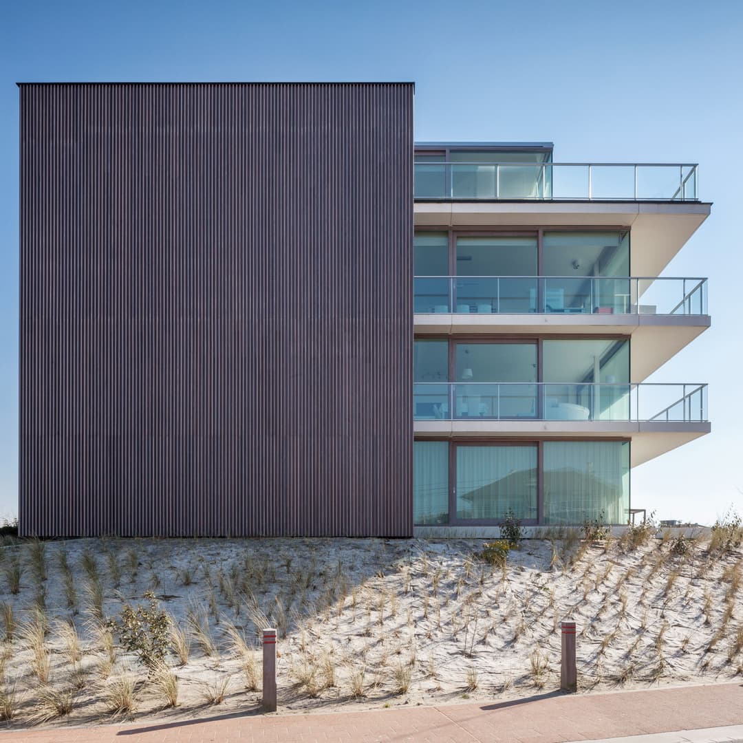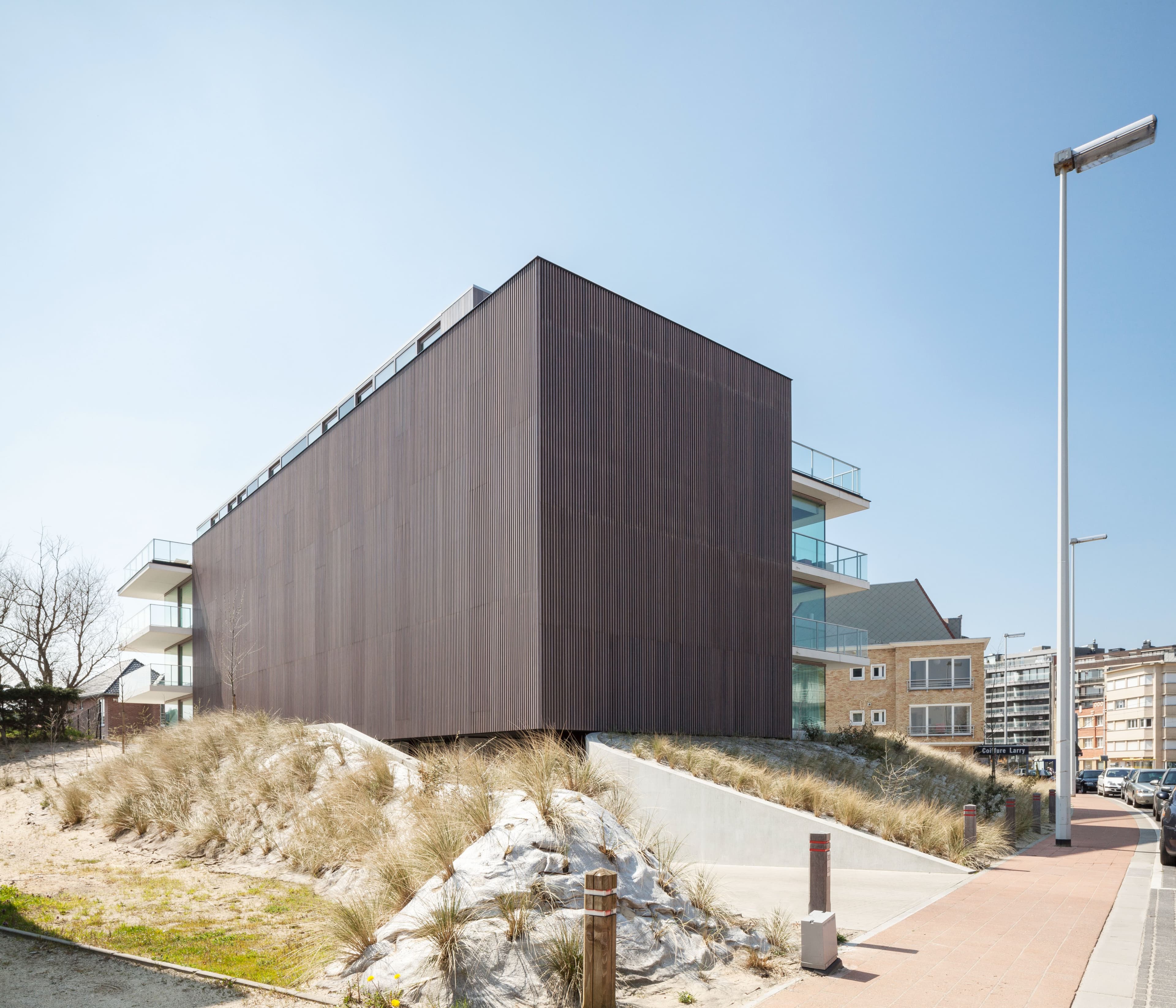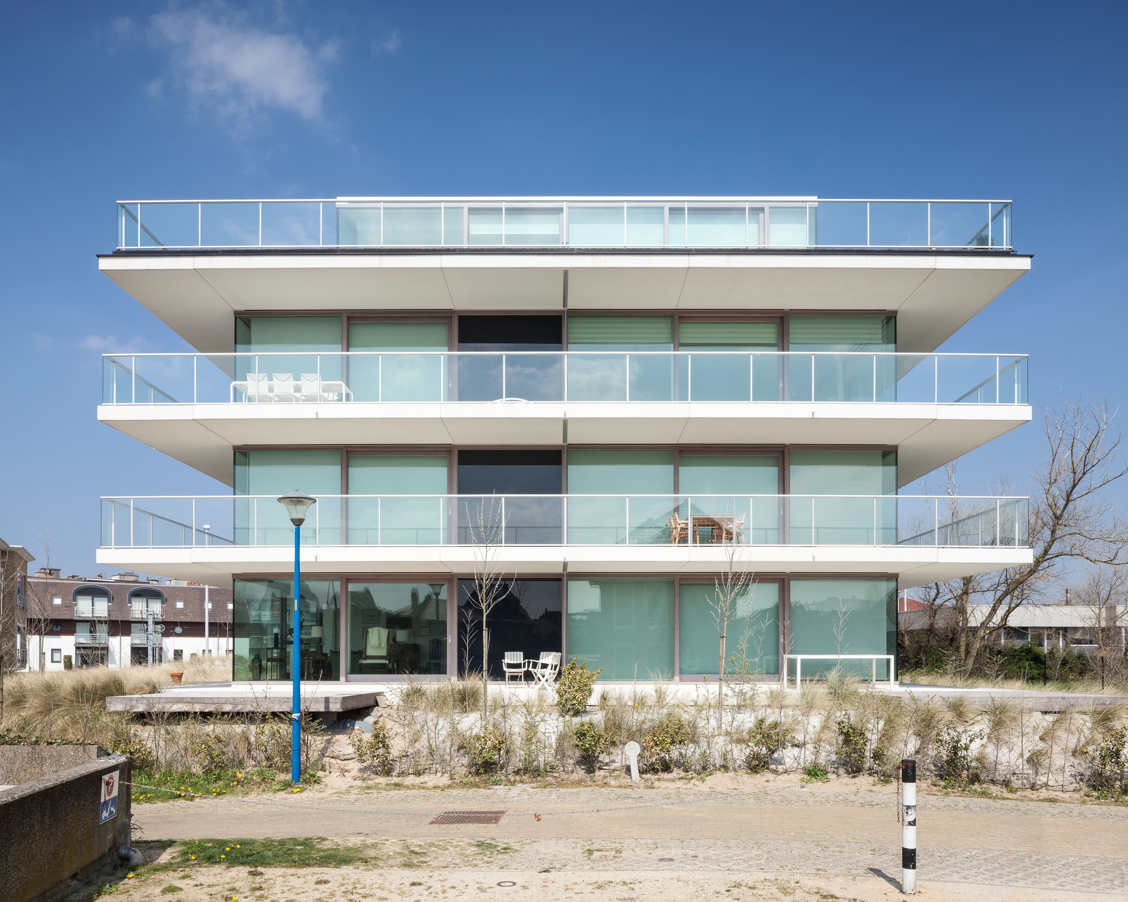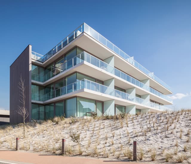 Residentie J. Prouvé past zich in de duinprofilering en staat a.h.w. ingeschoven in de helling.
