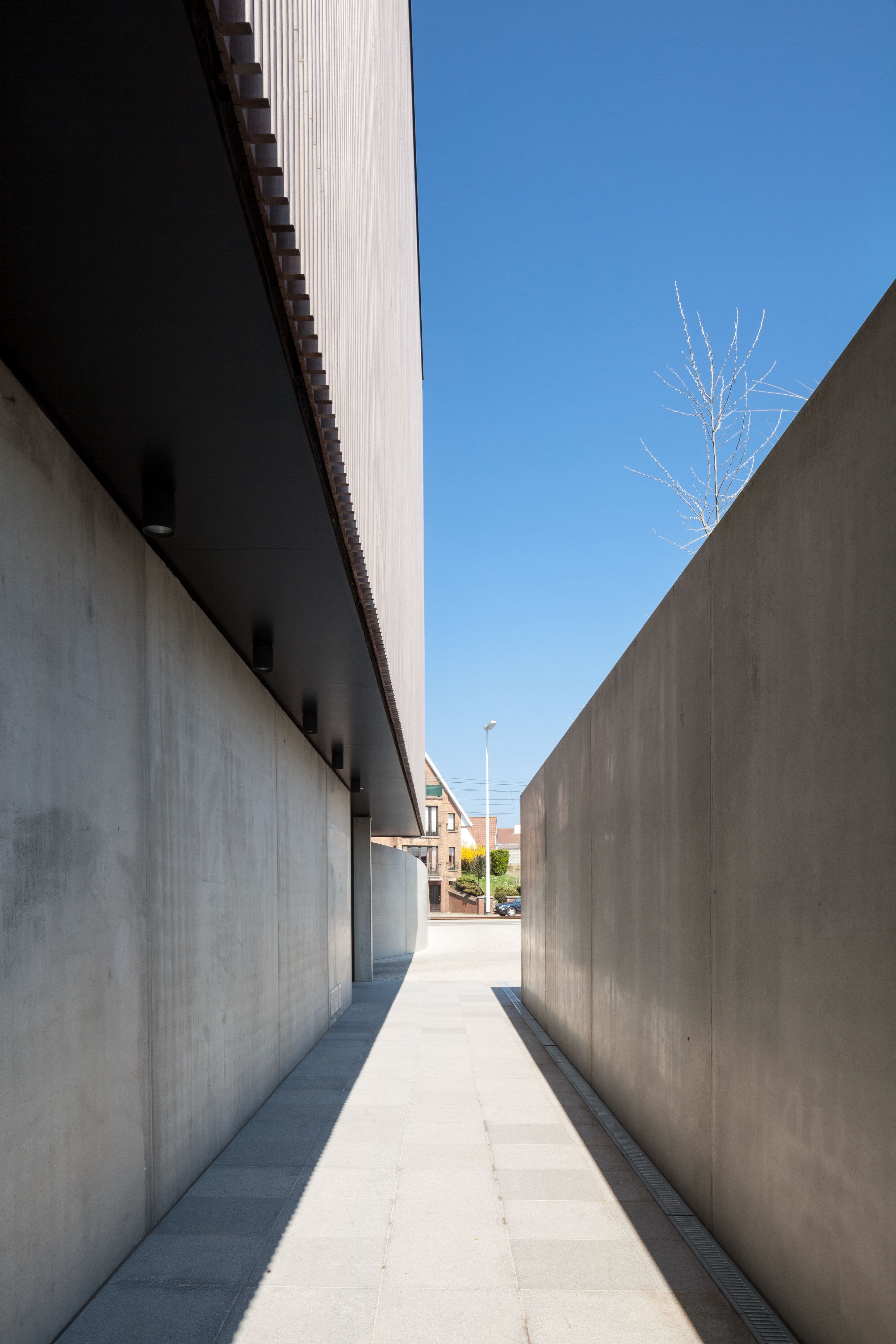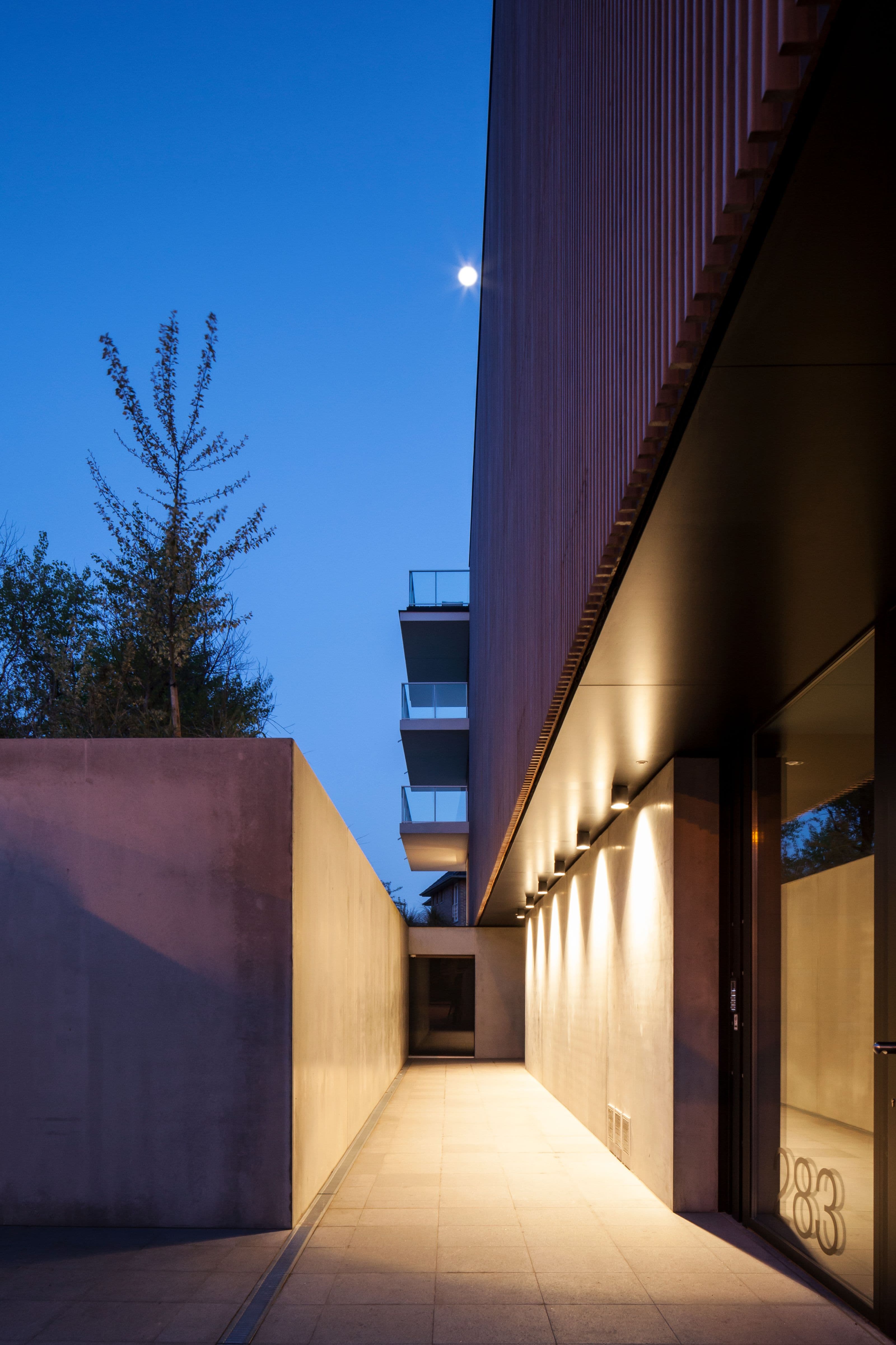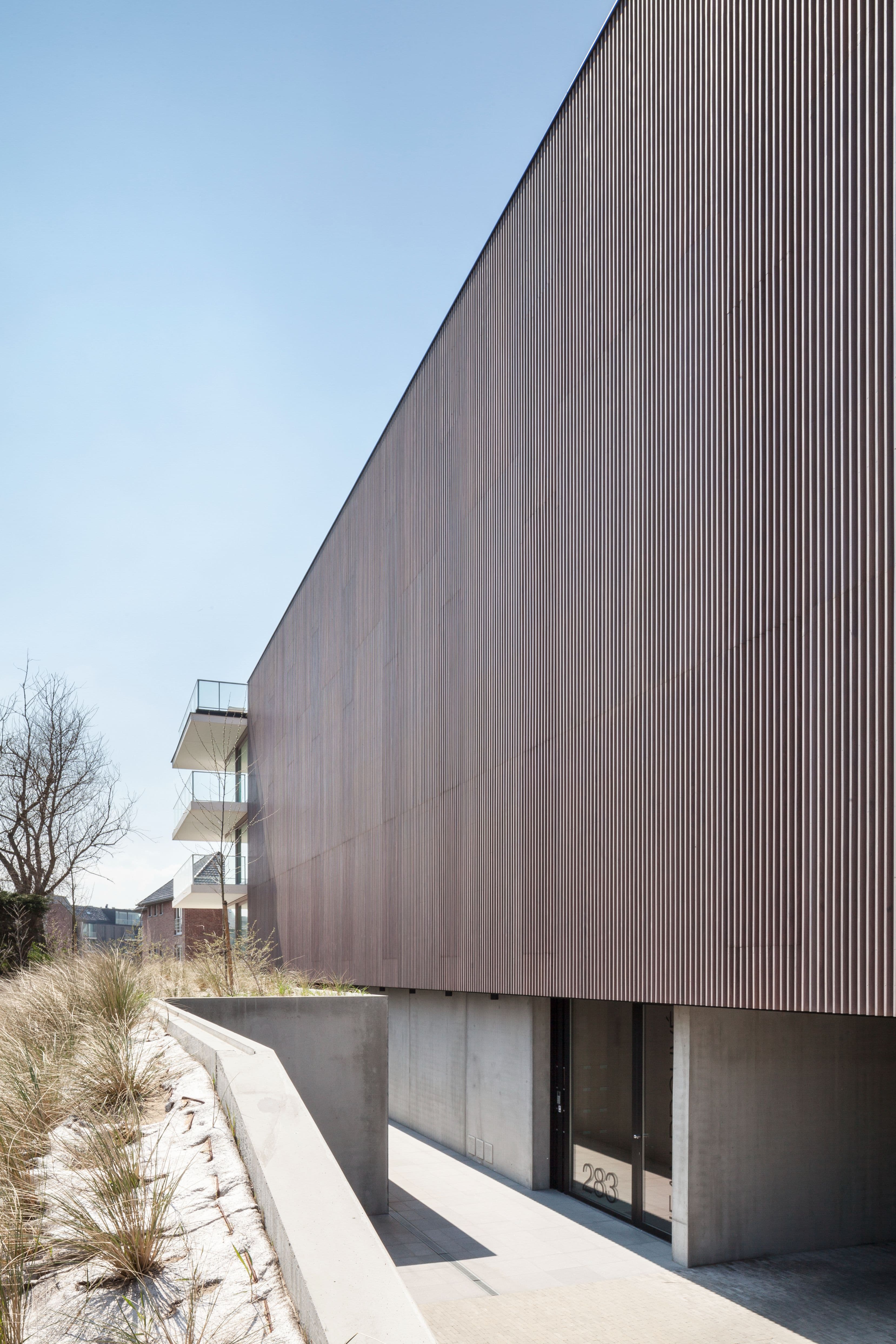 De meergezinswoning wordt in hoofdzaak afgewerkt met een houten gevelbekleding, in combinatie met houten buitenschrijnwerk. De terrassen worden uitgevoerd in geprefabriceerde sierbeton in helder wit.