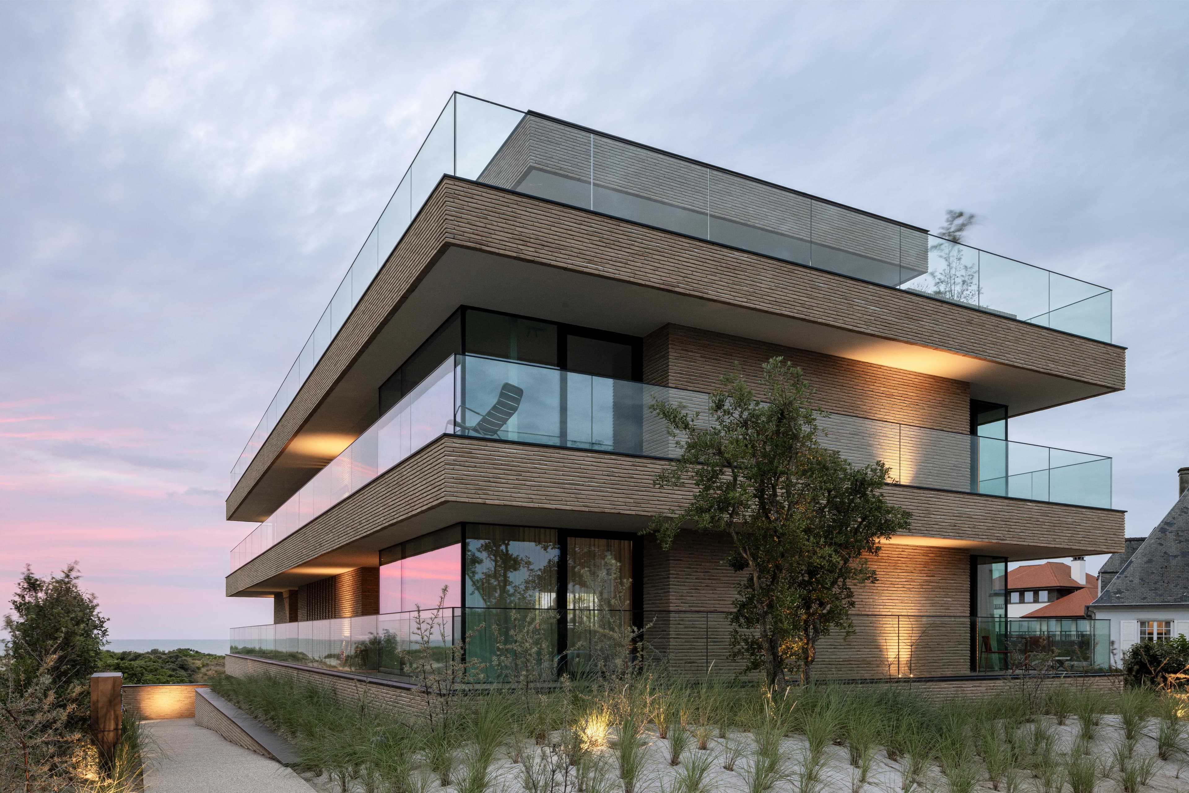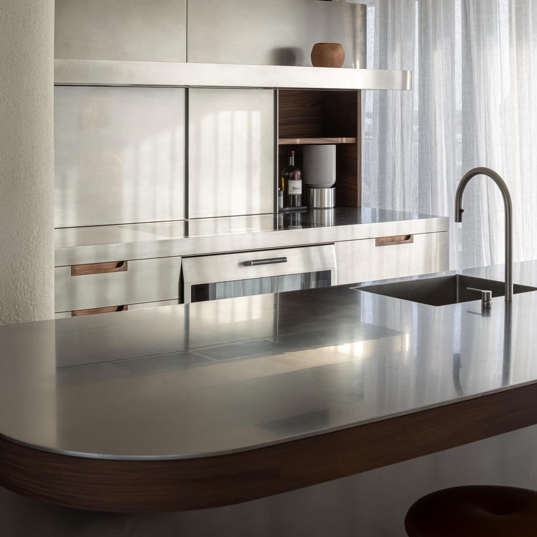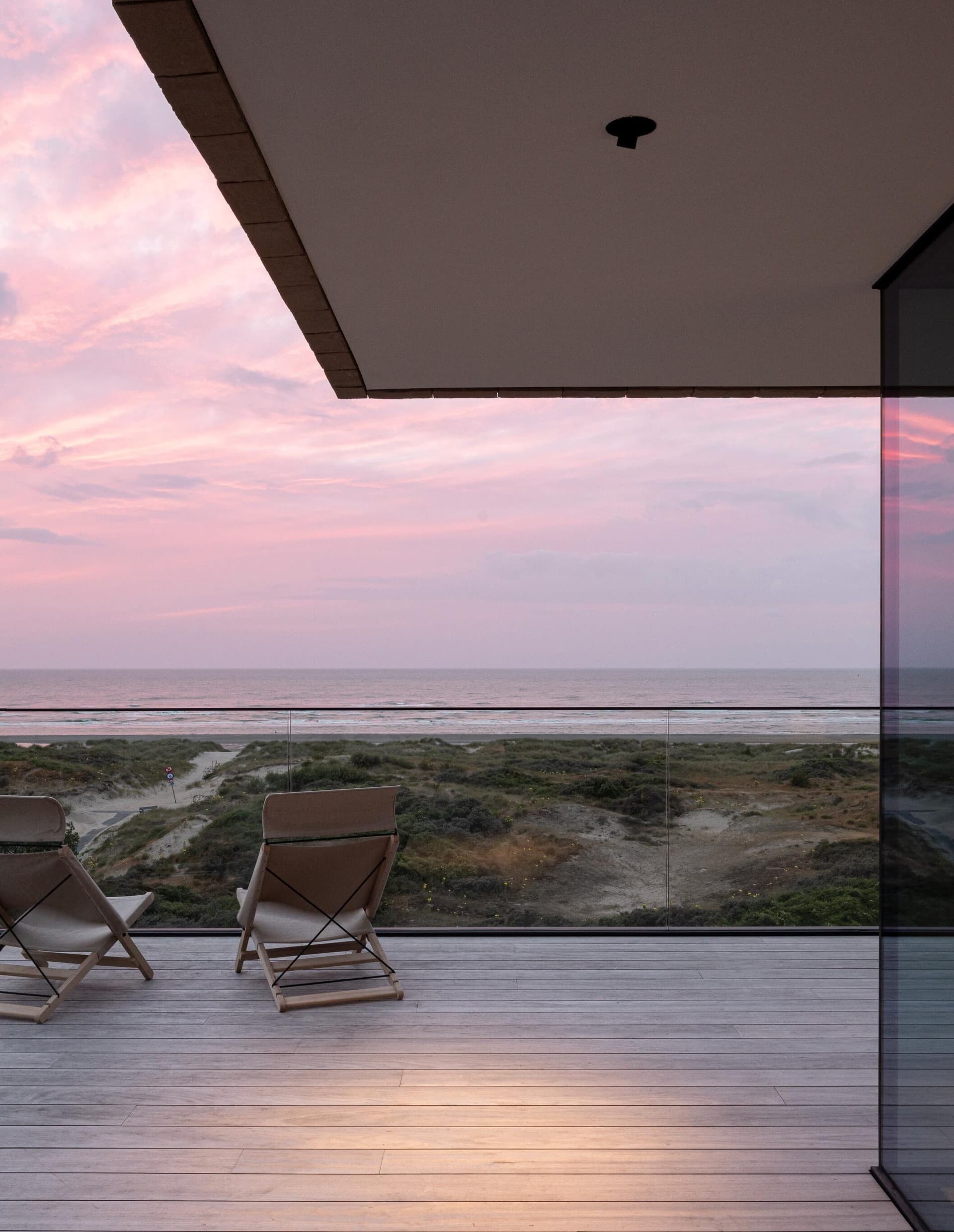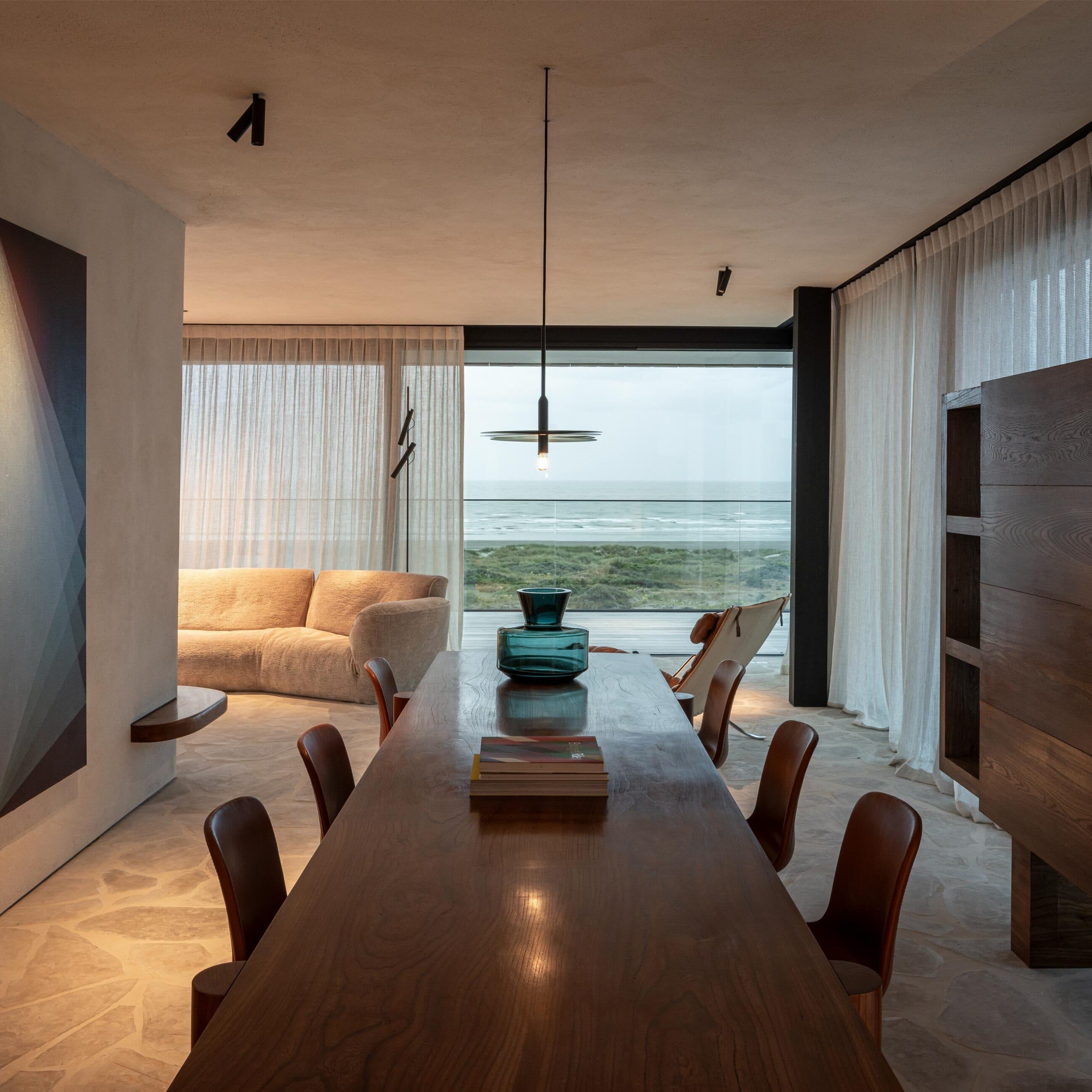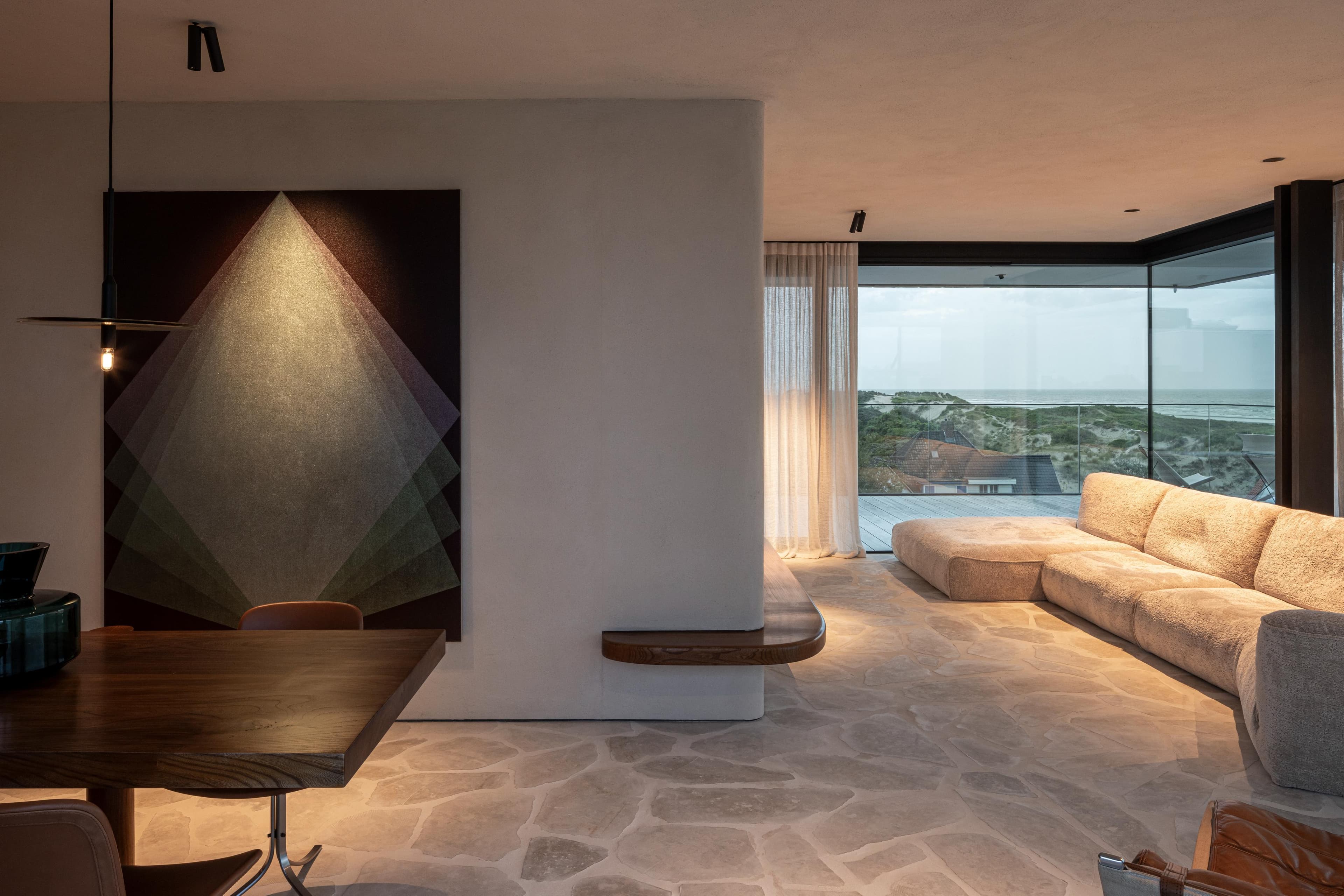 A project in a dreamy location like this doesn’t come by often: on the beach, looking out to the sea and dunes. The penthouse rises up like a beacon of light from these natural elements, with large glass windows all around establishing a connection with the dunes and the sea behind them. The floorplan was retought and the kitchen moved to the southwest to make the most of the afternoon sun. The connection to the sea is palpable throughout, including in the bedrooms of the rear, because of the floor plan’s central axis. The transition between inside, outside feels organic thanks to the materials used , including the rubble masonry from the Gobertange quarry, in a colour that is very similar to that of the dunes and sand. The design, meanwhile, was inspired by element that stand the test of time: the custom interiors were made from palisander, stainless steel and natural stone and combined with upholstered walls and solid elm furniture crafted by artisans.