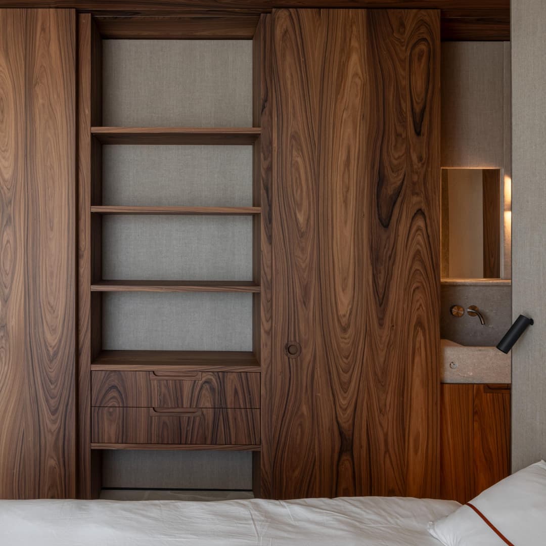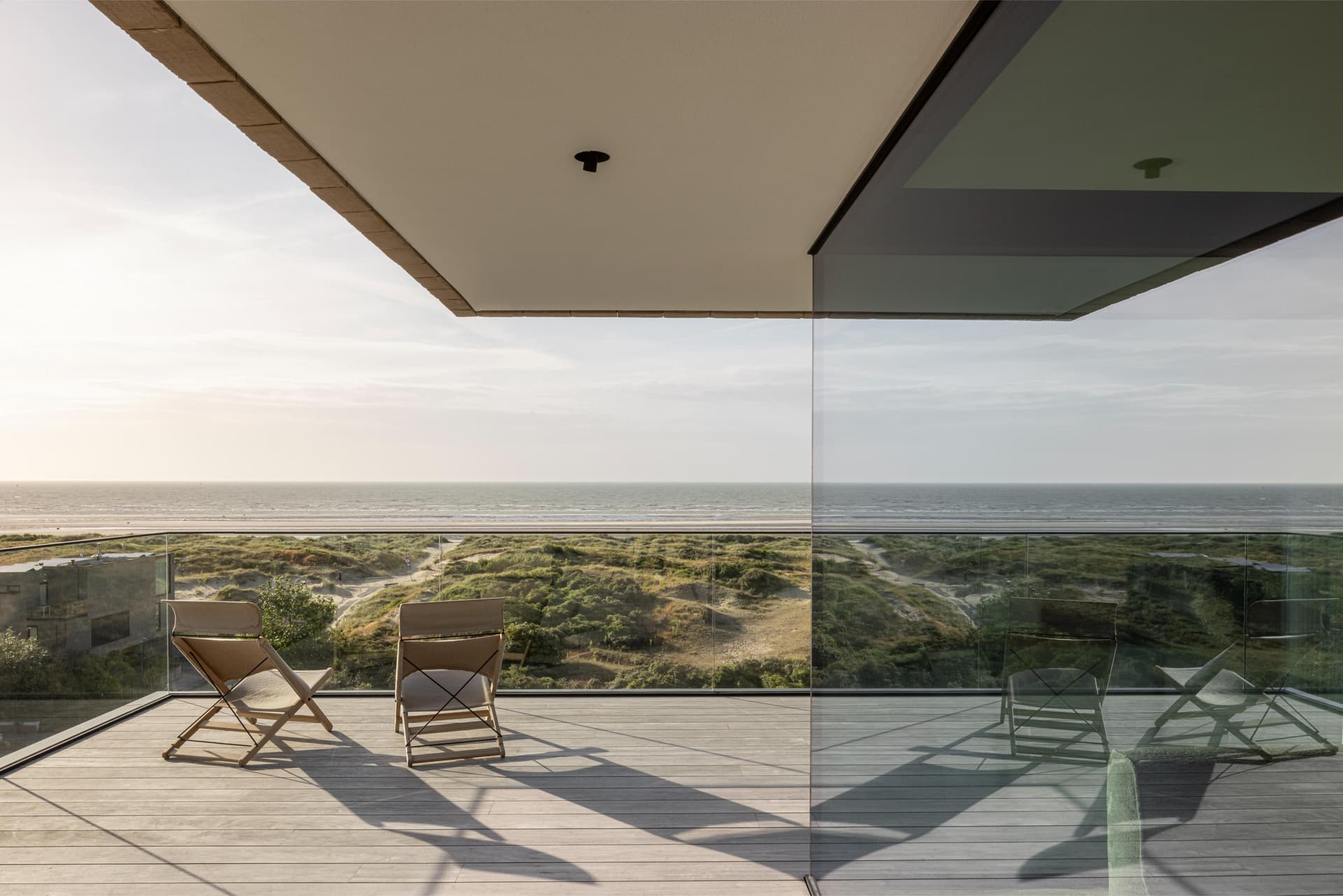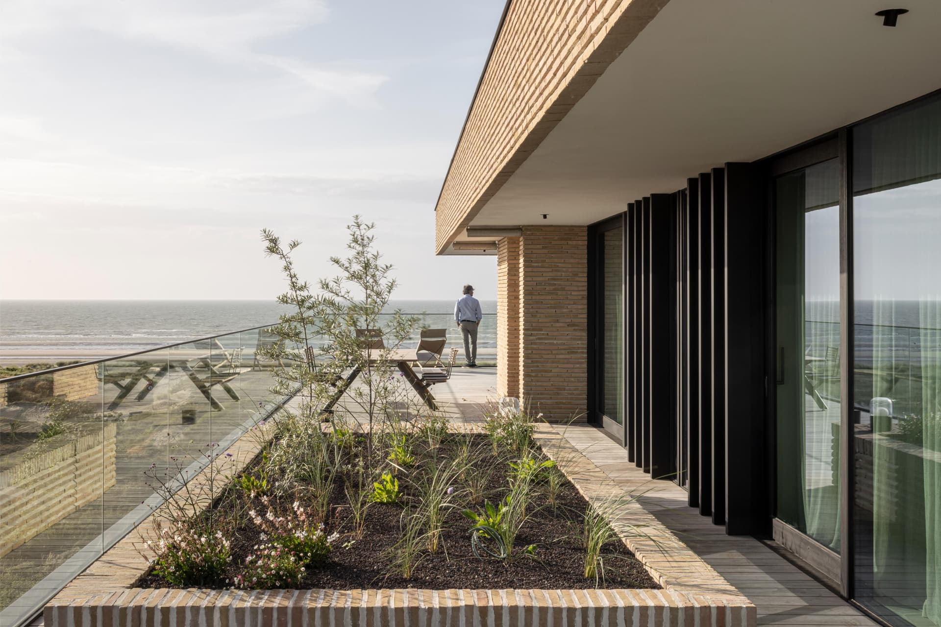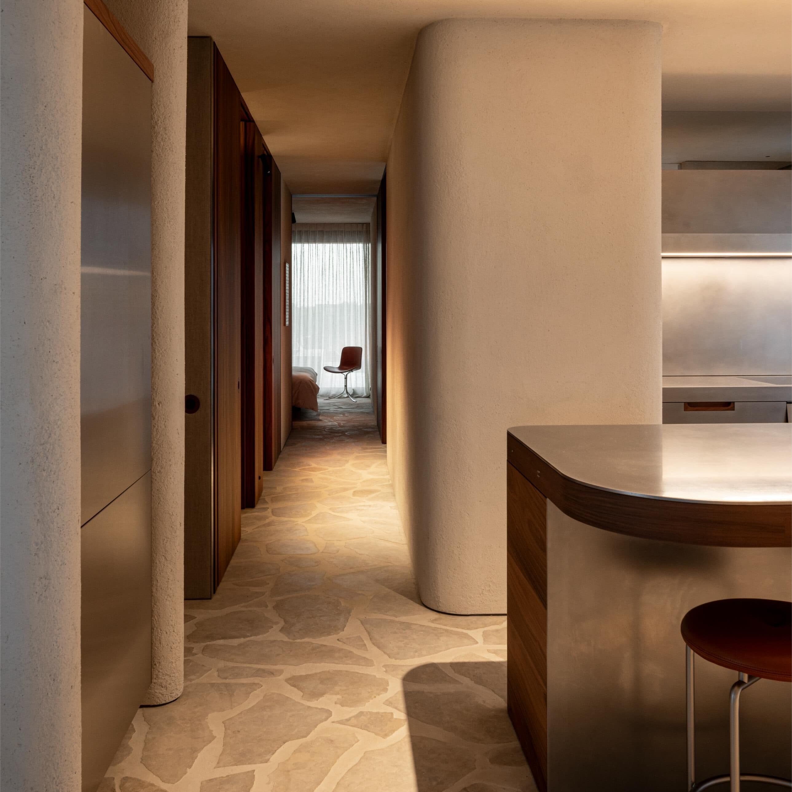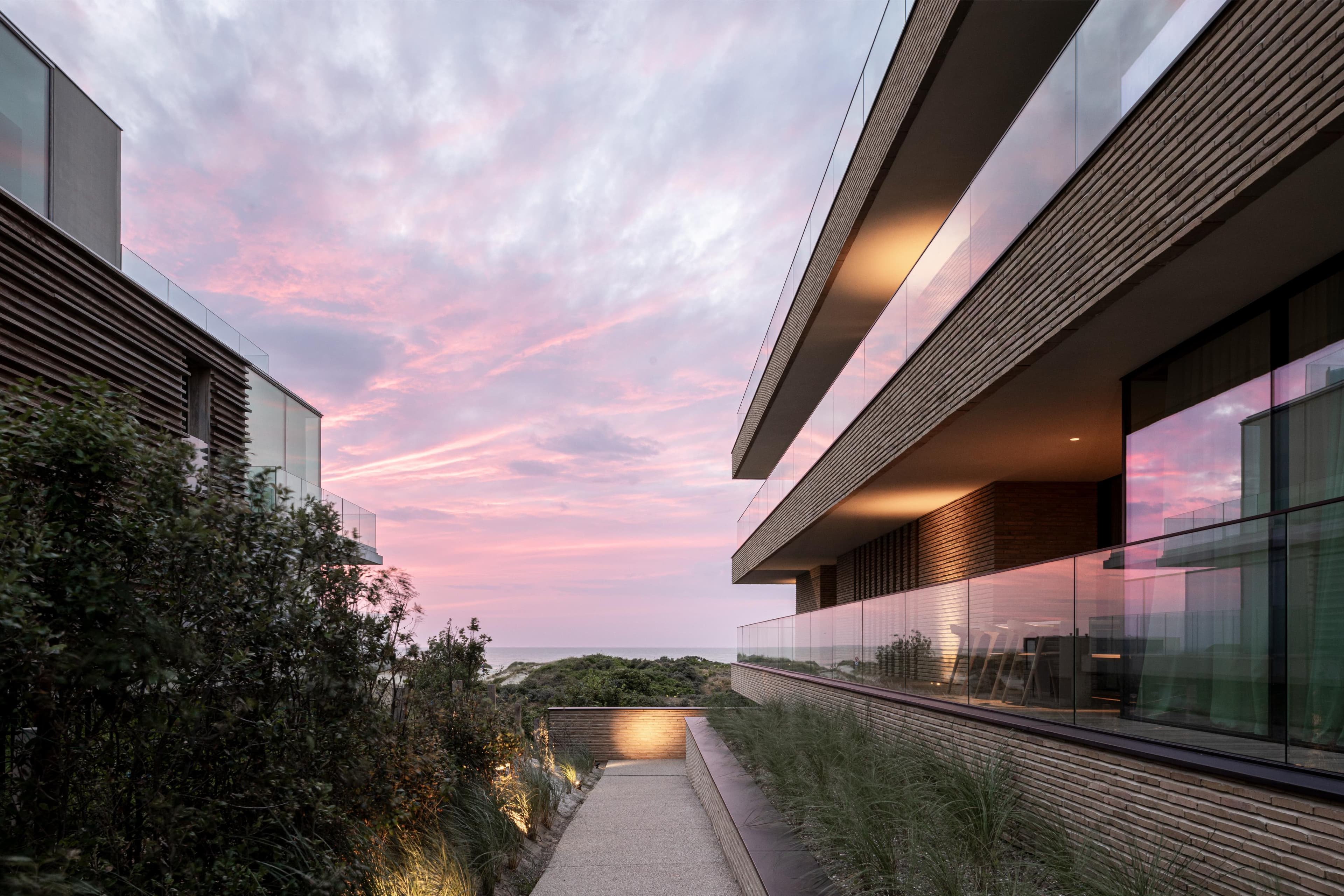 A project in a dreamy location like this doesn’t come by often: on the beach, looking out to the sea and dunes. The penthouse rises up like a beacon of light from these natural elements, with large glass windows all around establishing a connection with the dunes and the sea behind them. The floorplan was retought and the kitchen moved to the southwest to make the most of the afternoon sun. The connection to the sea is palpable throughout, including in the bedrooms of the rear, because of the floor plan’s central axis. The transition between inside, outside feels organic thanks to the materials used , including the rubble masonry from the Gobertange quarry, in a colour that is very similar to that of the dunes and sand. The design, meanwhile, was inspired by element that stand the test of time: the custom interiors were made from palisander, stainless steel and natural stone and combined with upholstered walls and solid elm furniture crafted by artisans.