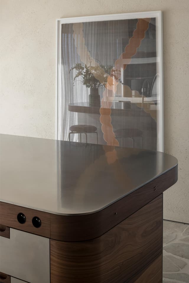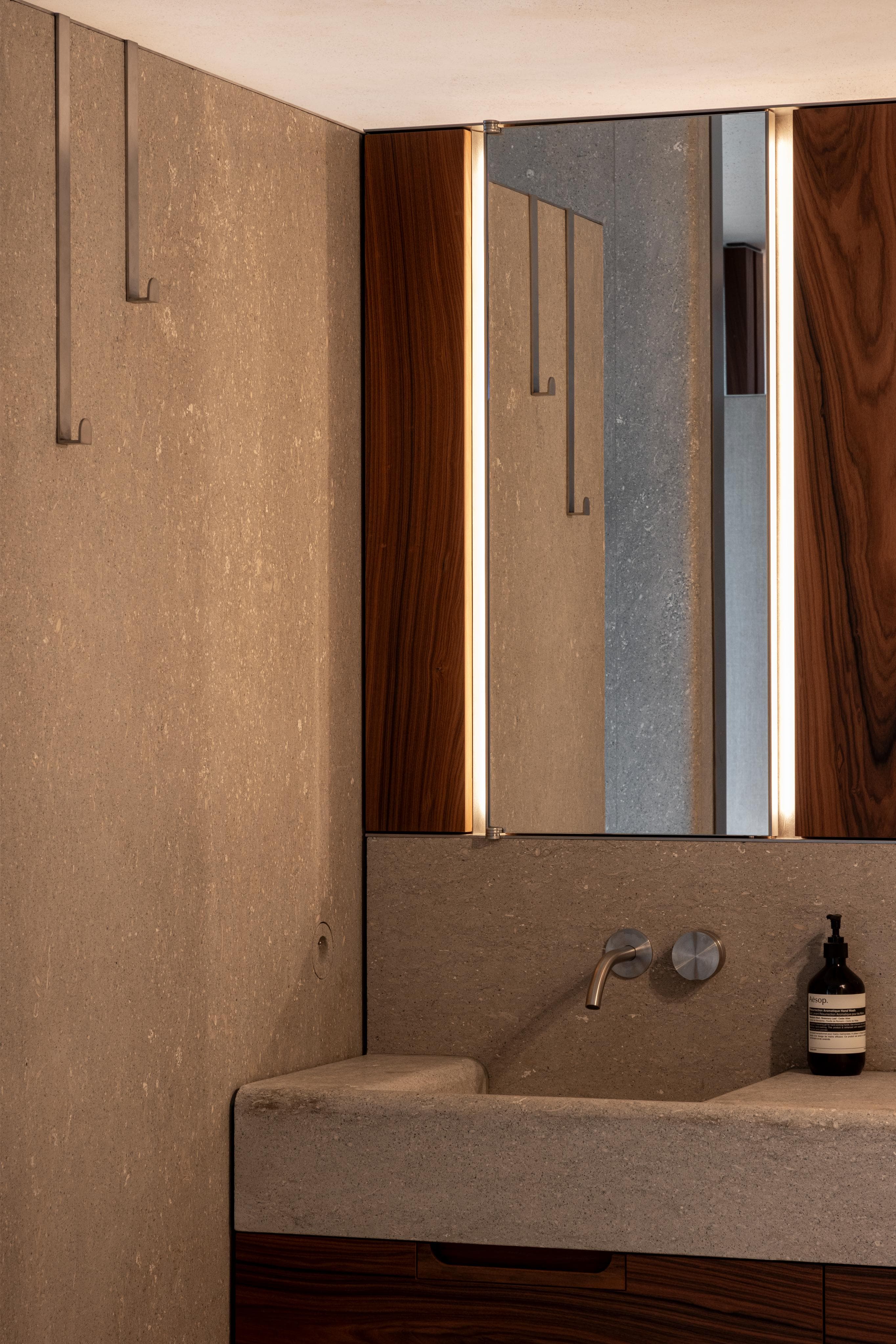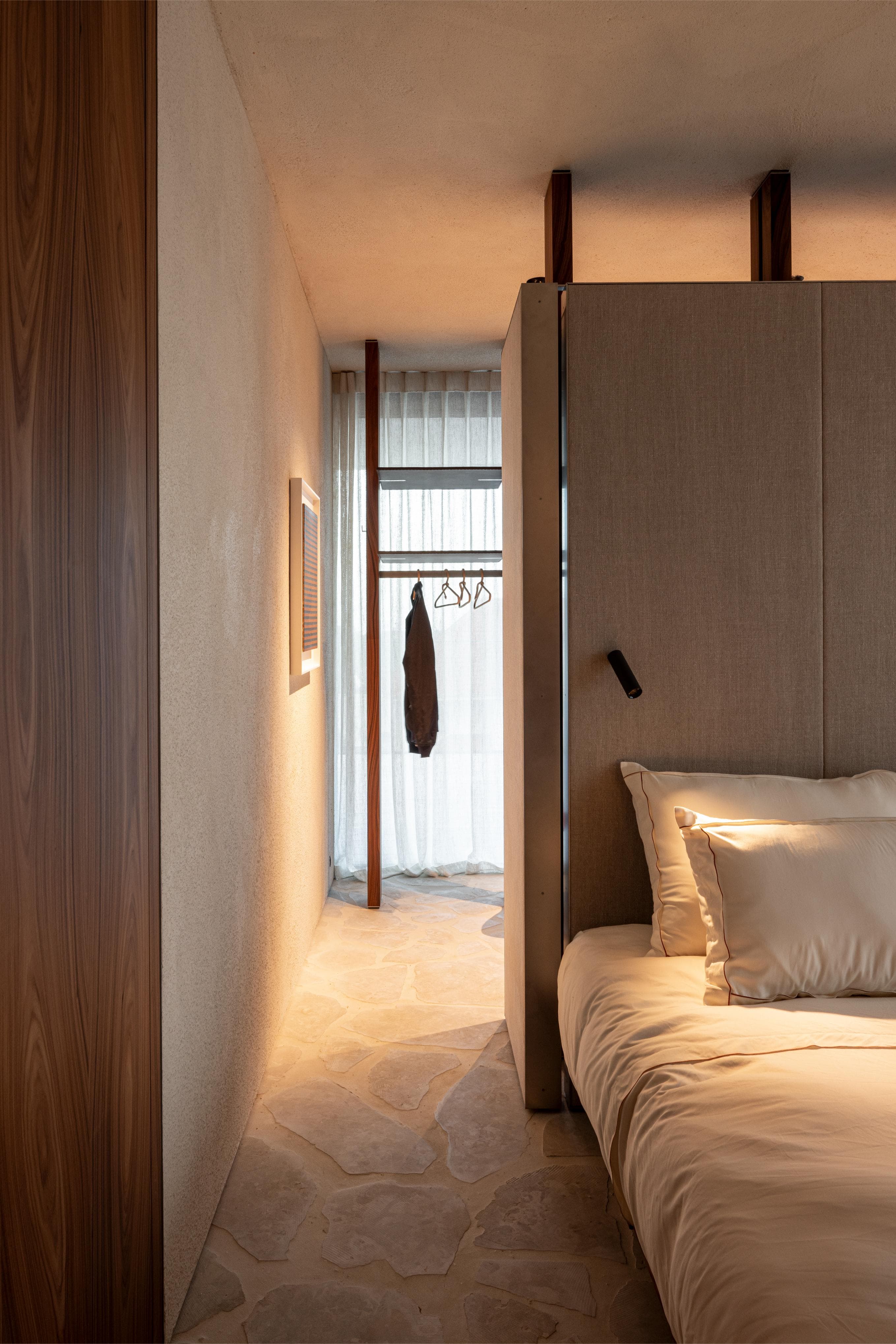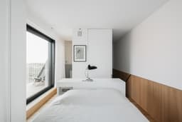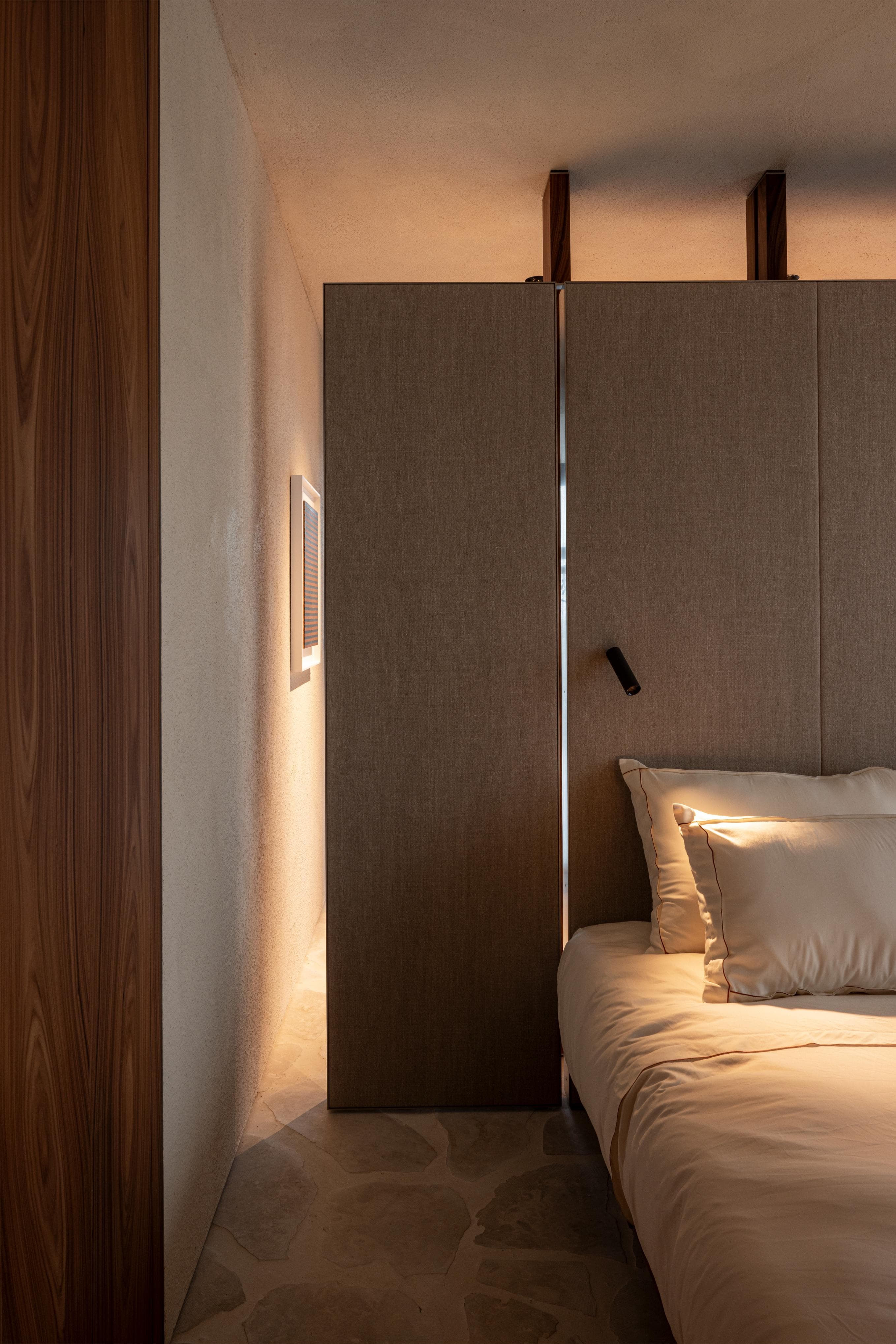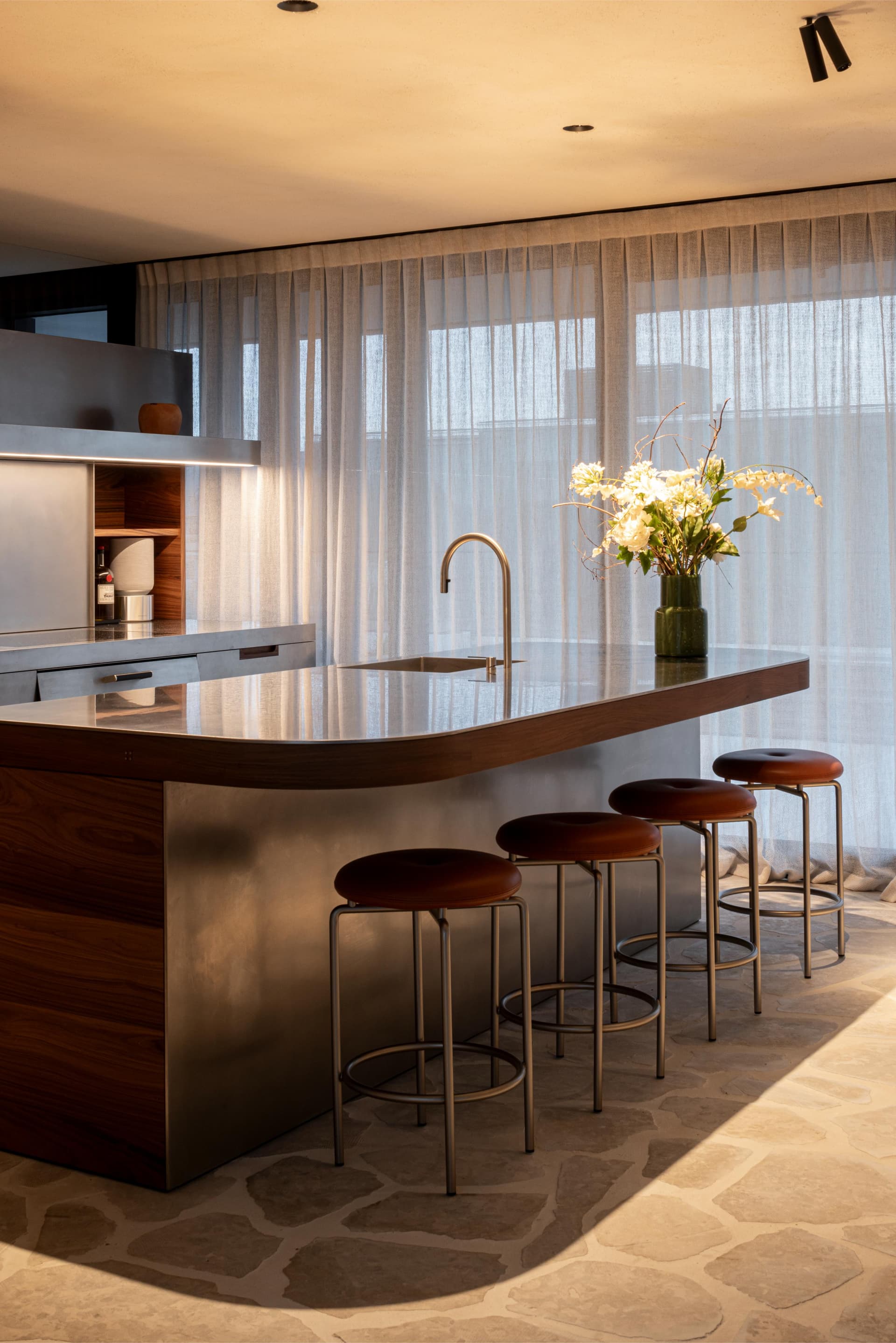 A project in a dreamy location like this doesn’t come by often: on the beach, looking out to the sea and dunes. The penthouse rises up like a beacon of light from these natural elements, with large glass windows all around establishing a connection with the dunes and the sea behind them. The floorplan was retought and the kitchen moved to the southwest to make the most of the afternoon sun. The connection to the sea is palpable throughout, including in the bedrooms of the rear, because of the floor plan’s central axis. The transition between inside, outside feels organic thanks to the materials used , including the rubble masonry from the Gobertange quarry, in a colour that is very similar to that of the dunes and sand. The design, meanwhile, was inspired by element that stand the test of time: the custom interiors were made from palisander, stainless steel and natural stone and combined with upholstered walls and solid elm furniture crafted by artisans.