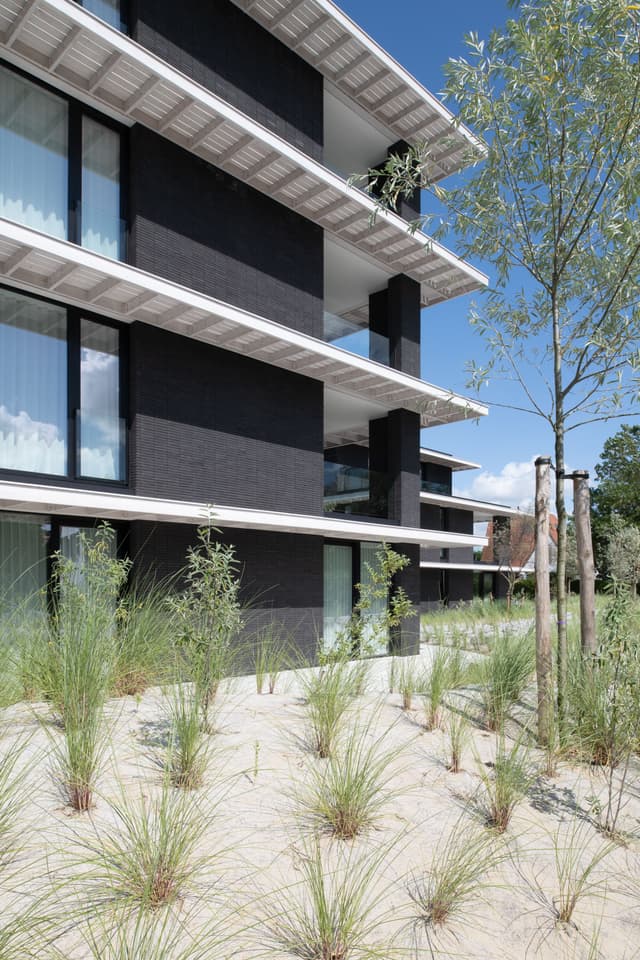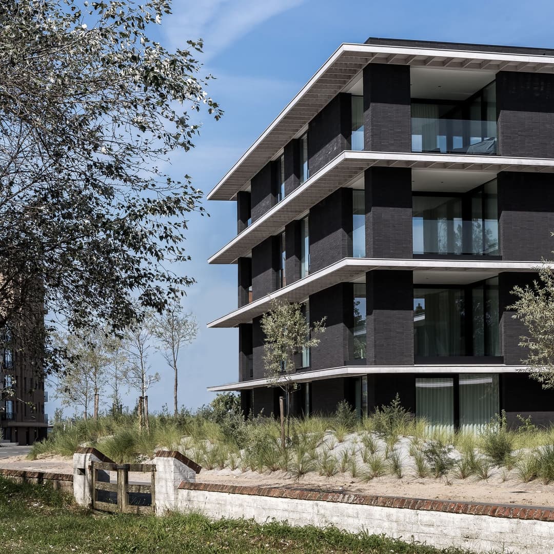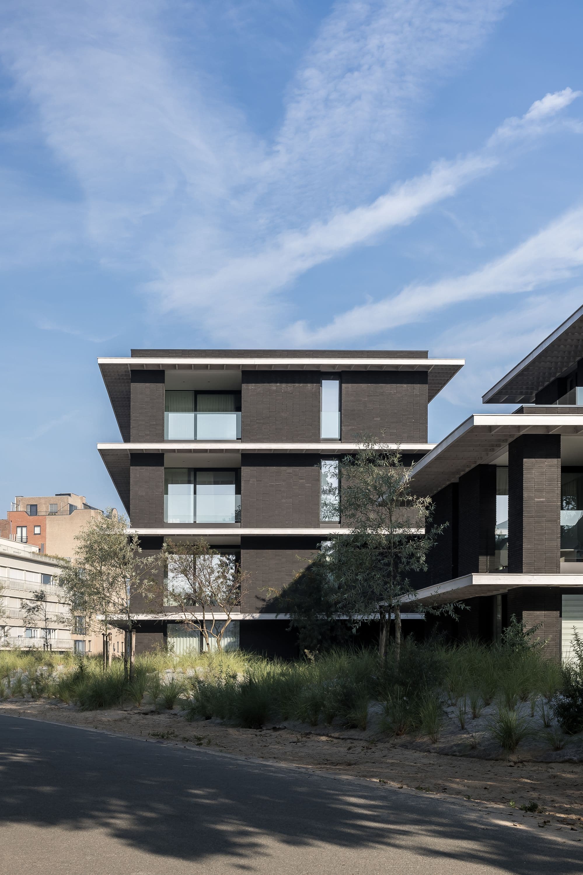 De gedachte achter deze opbouw en de gekozen materialen was: rust. De 2 volumes staan tegen de achterste bouwgrens aan. Zo ontstaat meer openheid aan de zuidkant. Daar bevinden zich de inpandige terrassen.