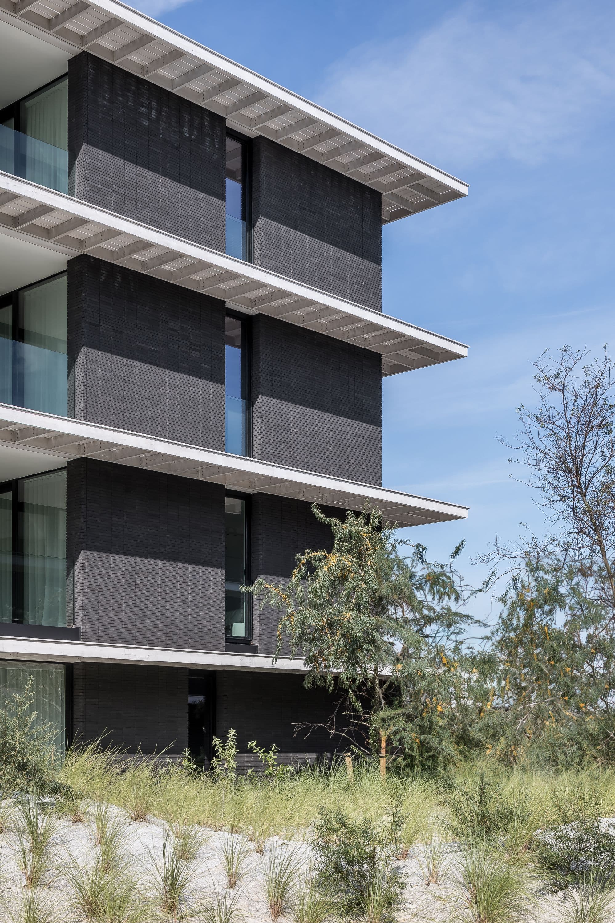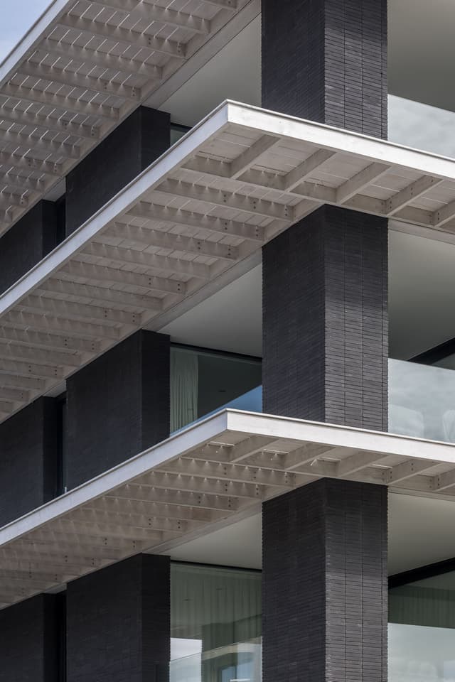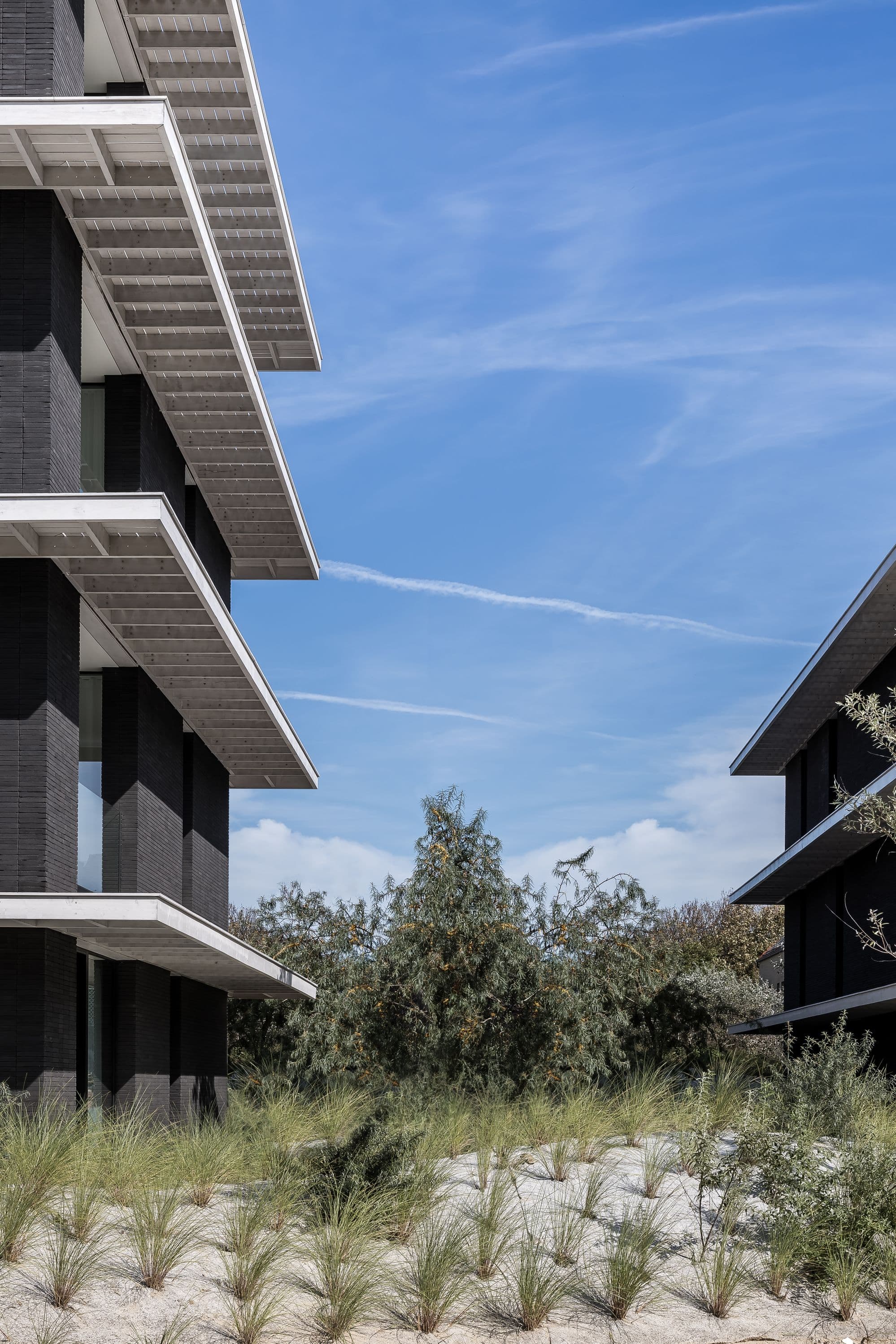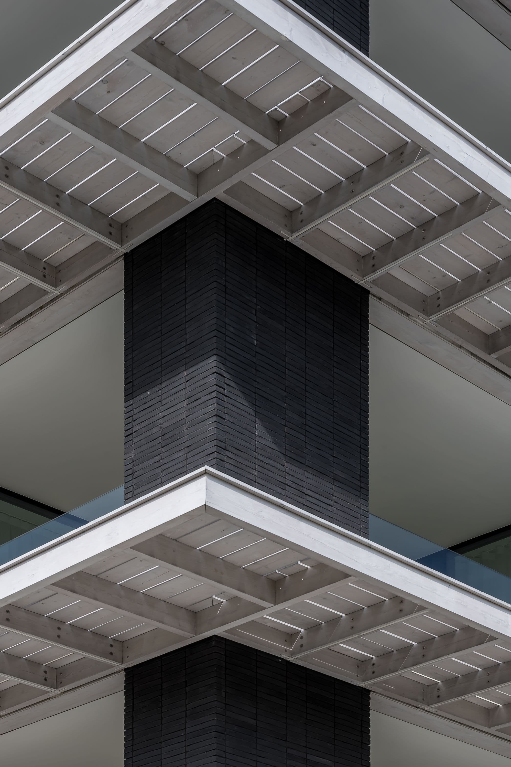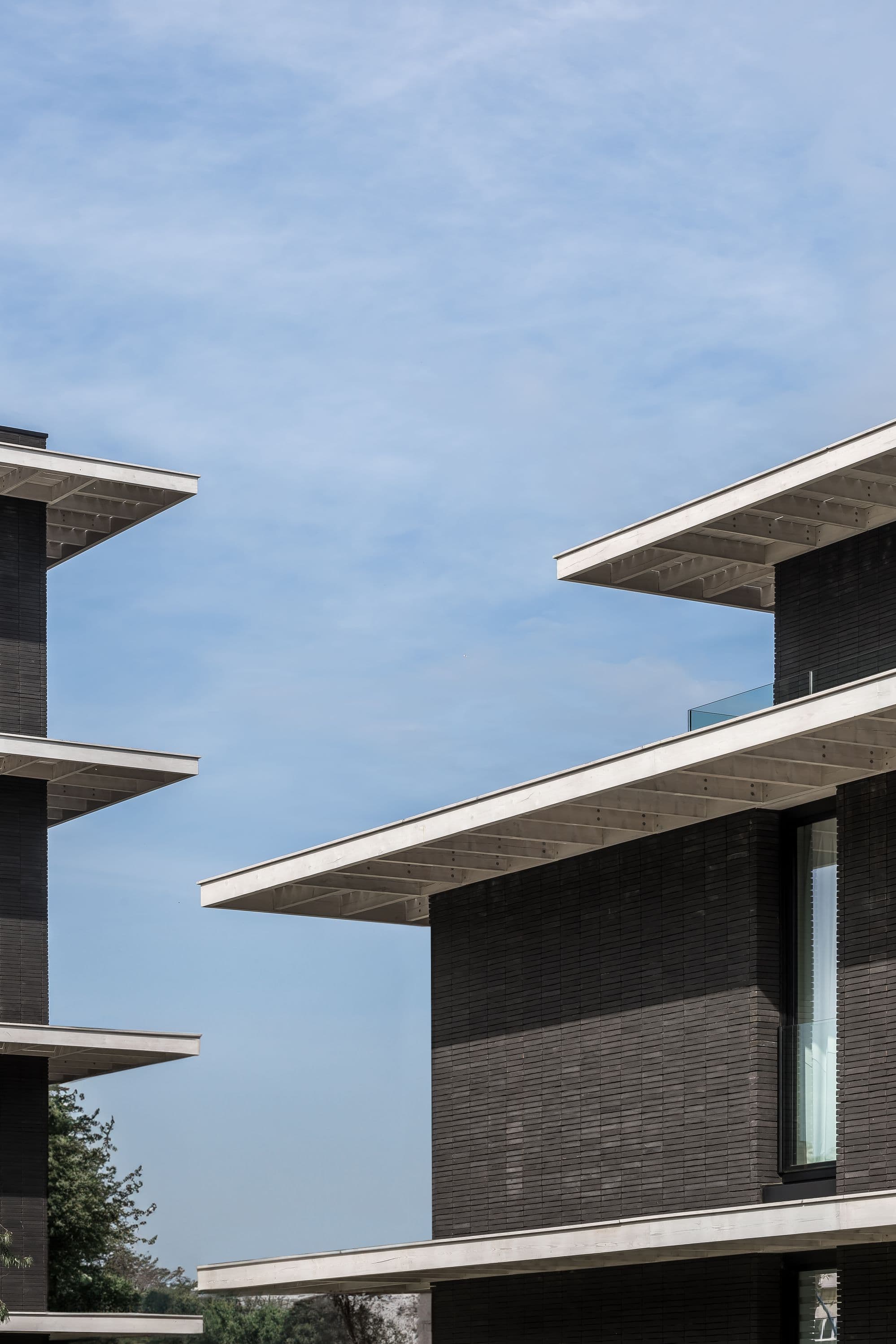 De luifels zijn opgebouwd uit houten roostering. De zijdelingse beplanking aan de bovenkant geven veel detail en een korrel die contrasteren met de in elkaar opgaande betonvlakken. De witte kleur van het gebeitste hout in contrast met het donkere antraciet en zwart beton in het zicht, versterken dat effect. Ingeklemde, glazen borstweringen en een doorlopende vloerbeplanking over de luifels maken het geheel voor het oog veel groter.