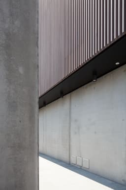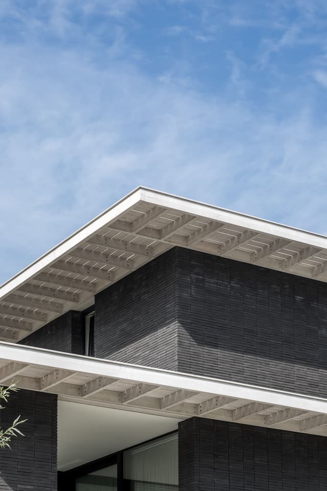 De luifels zijn opgebouwd uit houten roostering. De zijdelingse beplanking aan de bovenkant geven veel detail en een korrel die contrasteren met de in elkaar opgaande betonvlakken. De witte kleur van het gebeitste hout in contrast met het donkere antraciet en zwart beton in het zicht, versterken dat effect. Ingeklemde, glazen borstweringen en een doorlopende vloerbeplanking over de luifels maken het geheel voor het oog veel groter.