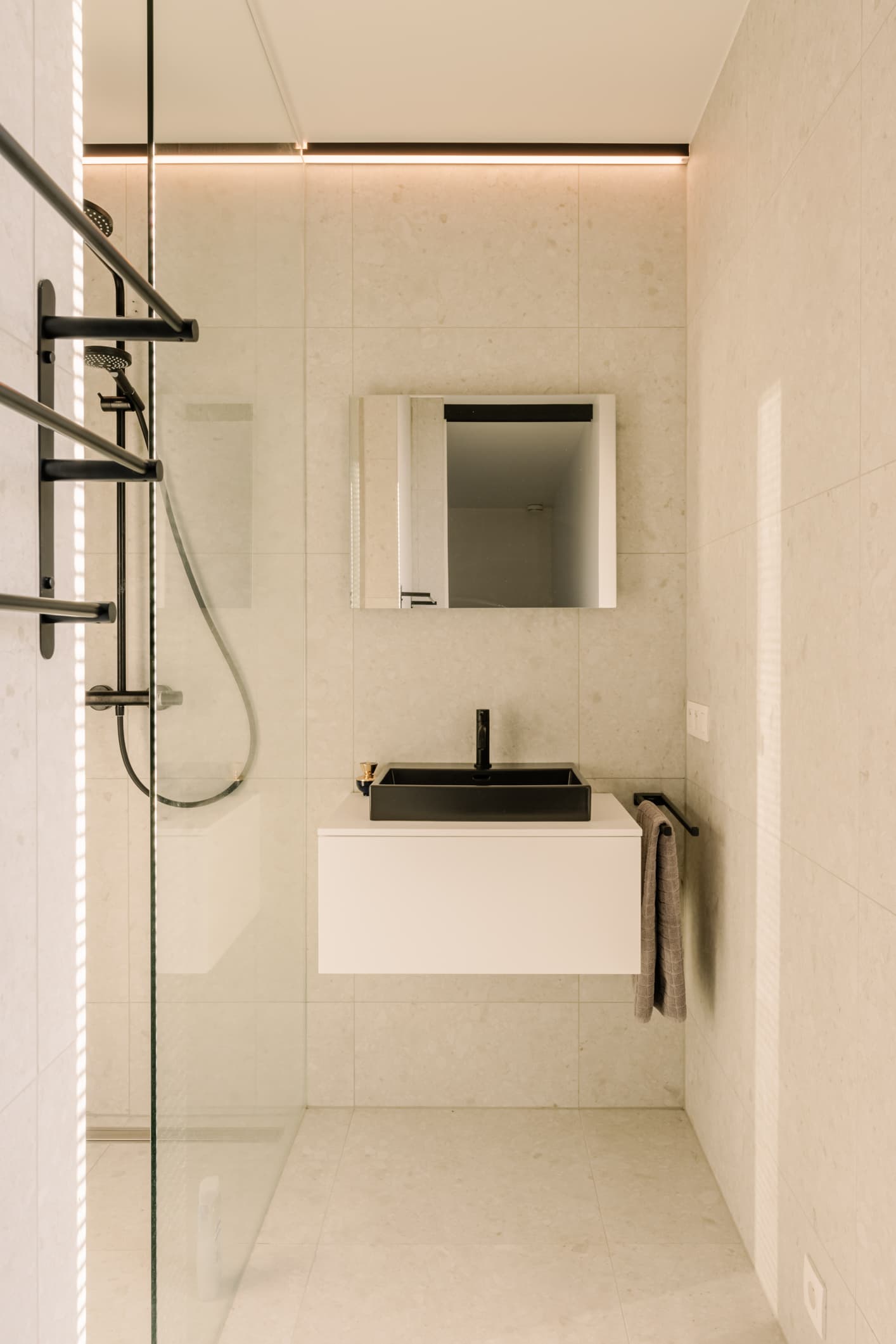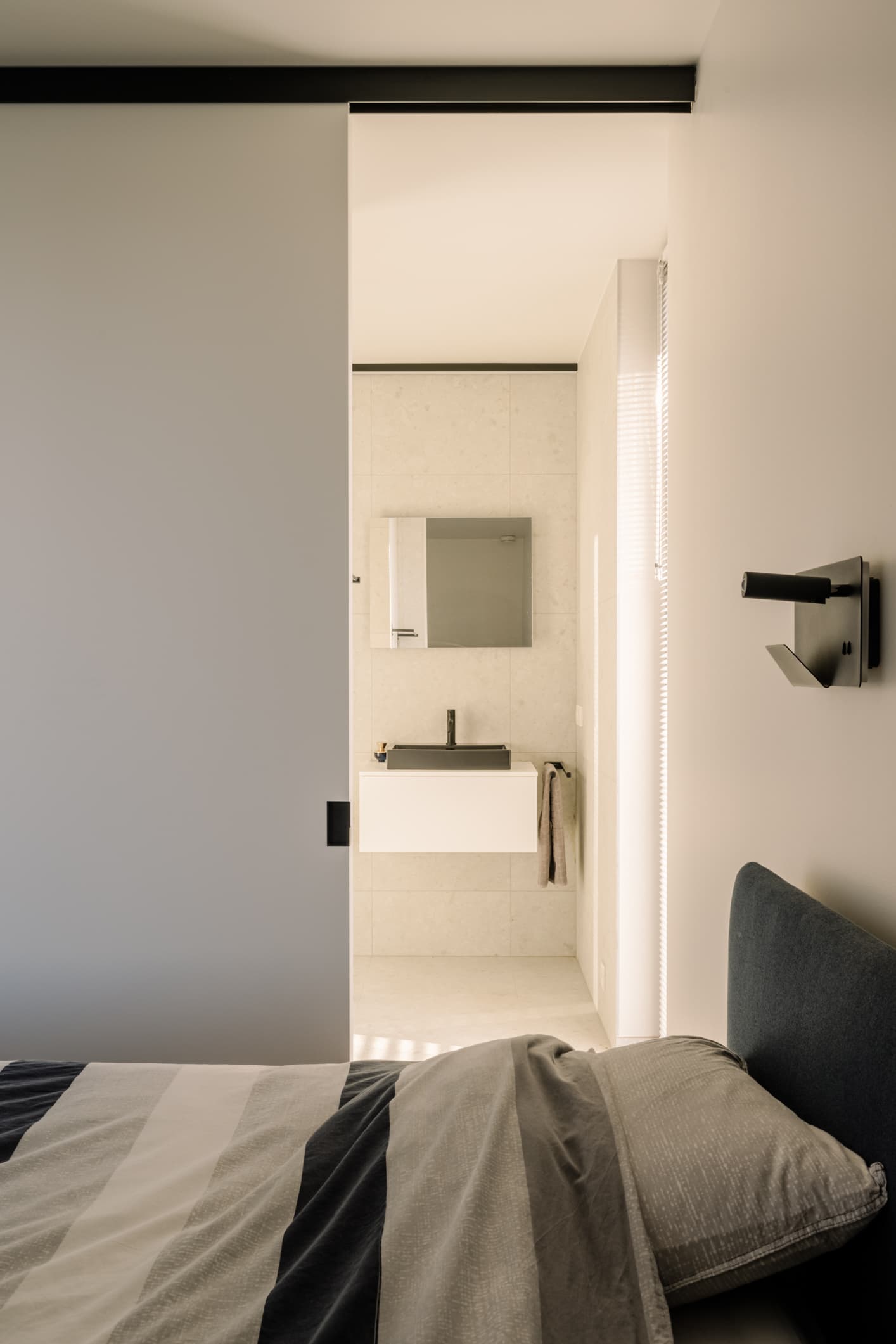 De gedachte achter deze opbouw en de gekozen materialen was: rust. De 2 volumes staan tegen de achterste bouwgrens aan. Zo ontstaat meer openheid aan de zuidkant. Daar bevinden zich de inpandige terrassen.