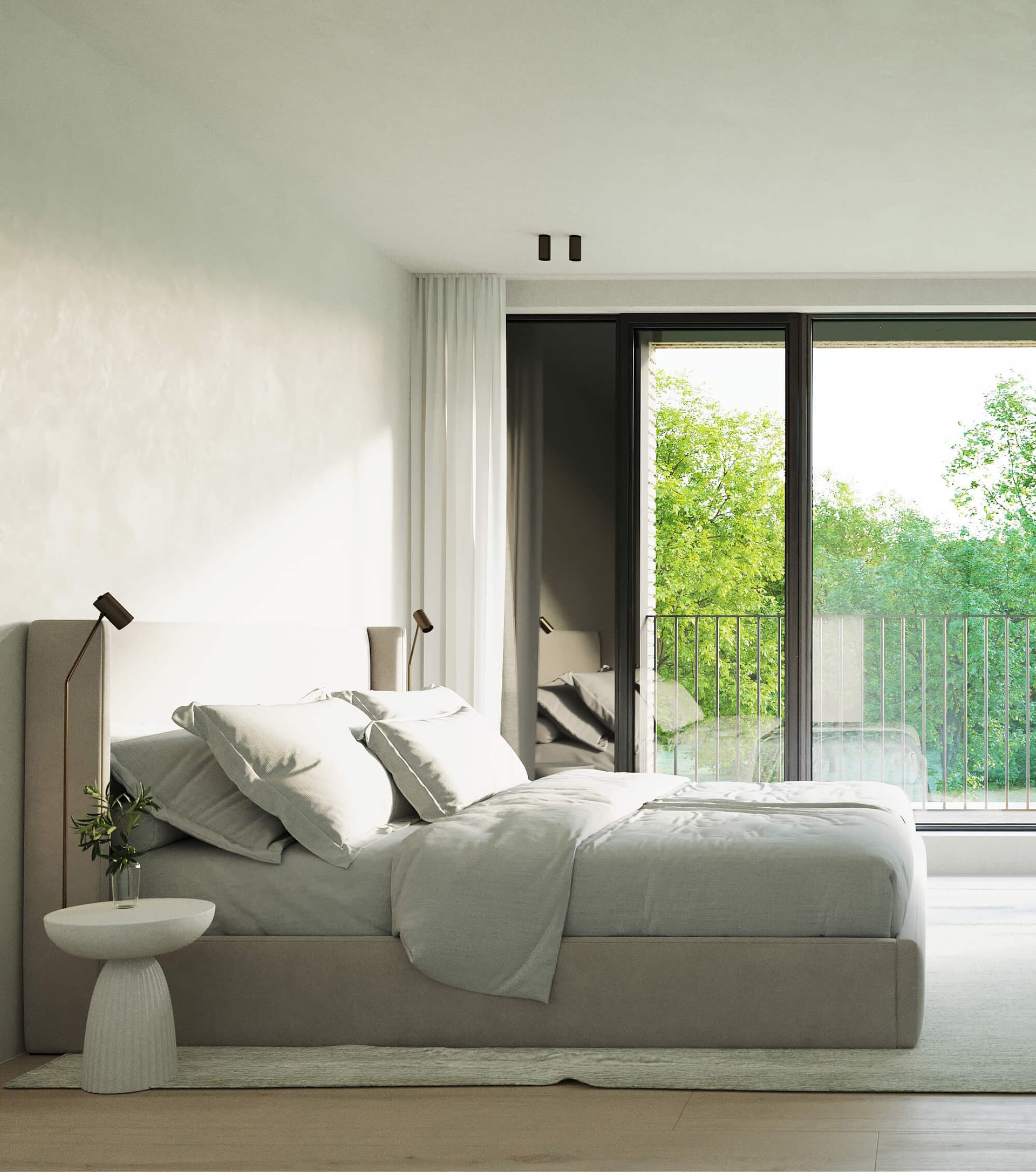Studiebureau De Fonseca maakt een akoestische studie op voor de appartementen. Op basis van dit onderzoek komen er de nodige akoestische barrières volgens de norm NBN S01-400-1. Daarmee bent u verzekerd van ‘akoestisch comfort’. De verdiepingen worden gescheiden door akoestisch materiaal van de klasse 1 en een zwevende cementlaag. De extreme aandacht voor het akoestisch comfort in de individuele units ziet u ook terug in het gebruik van ontdubbelde muren.