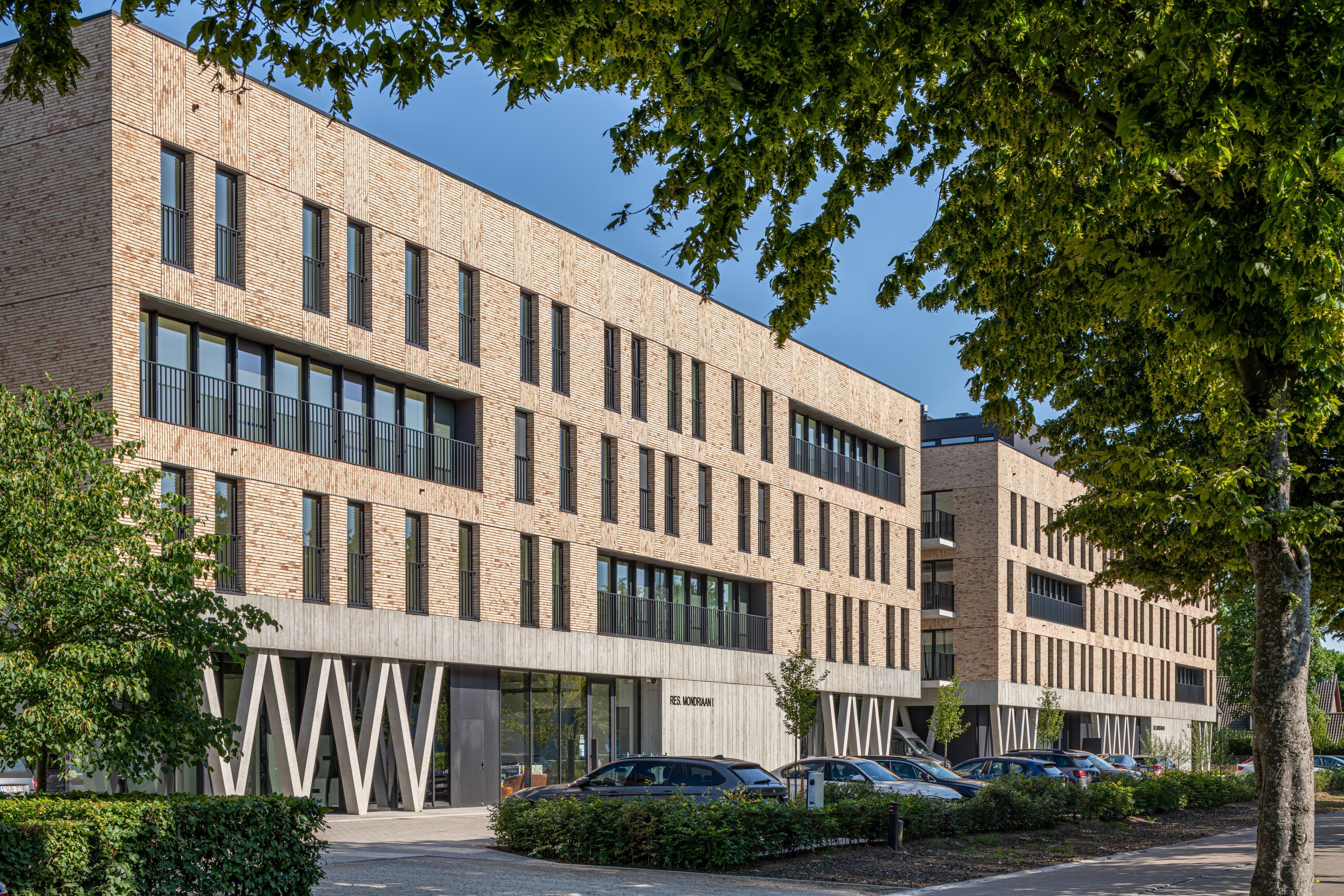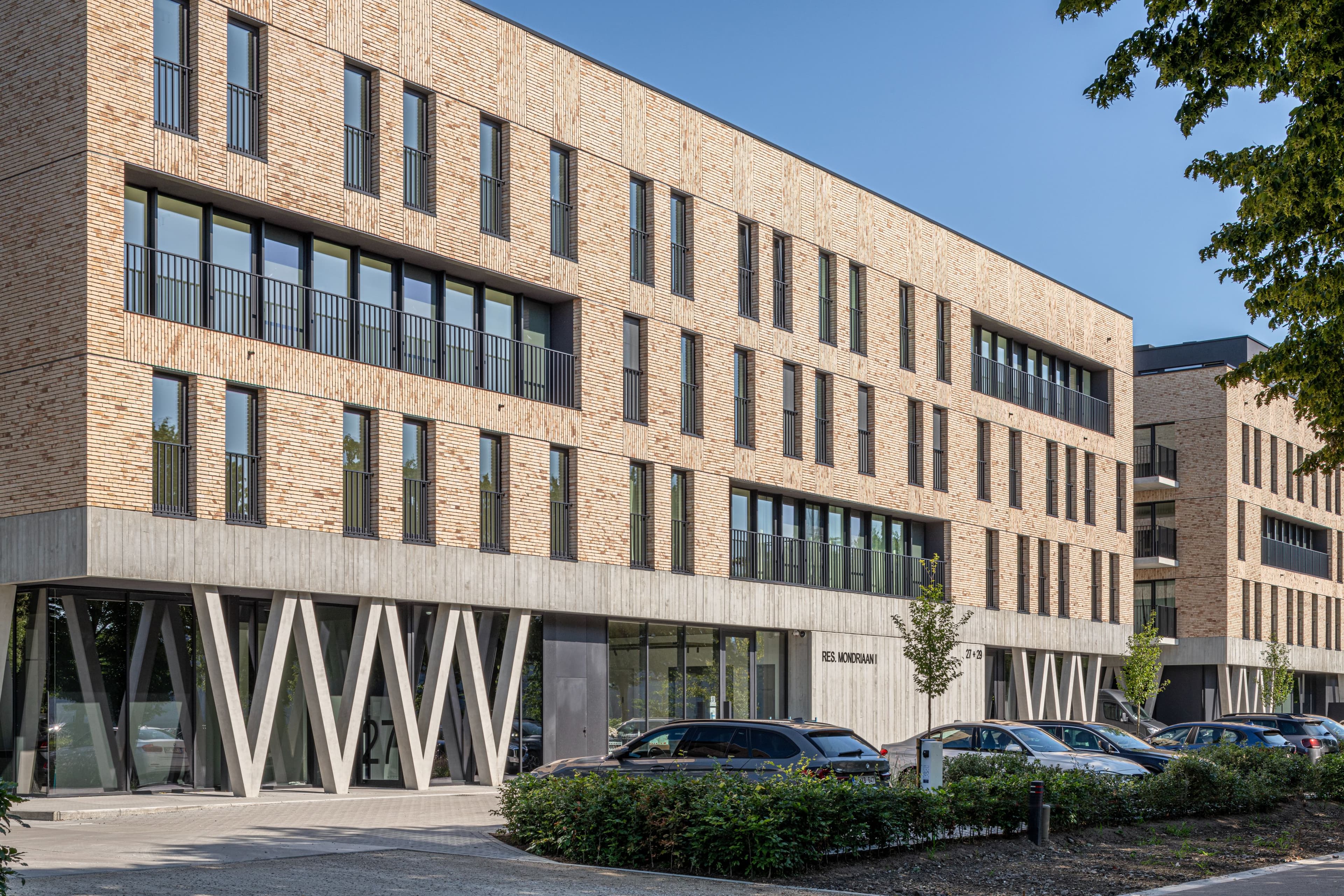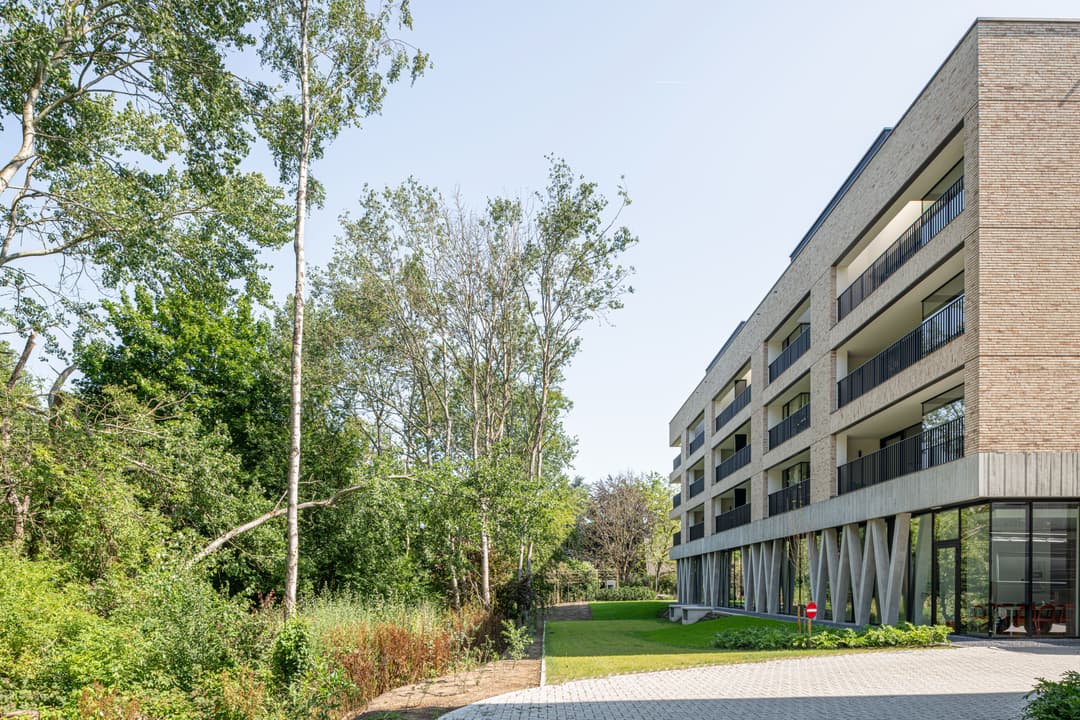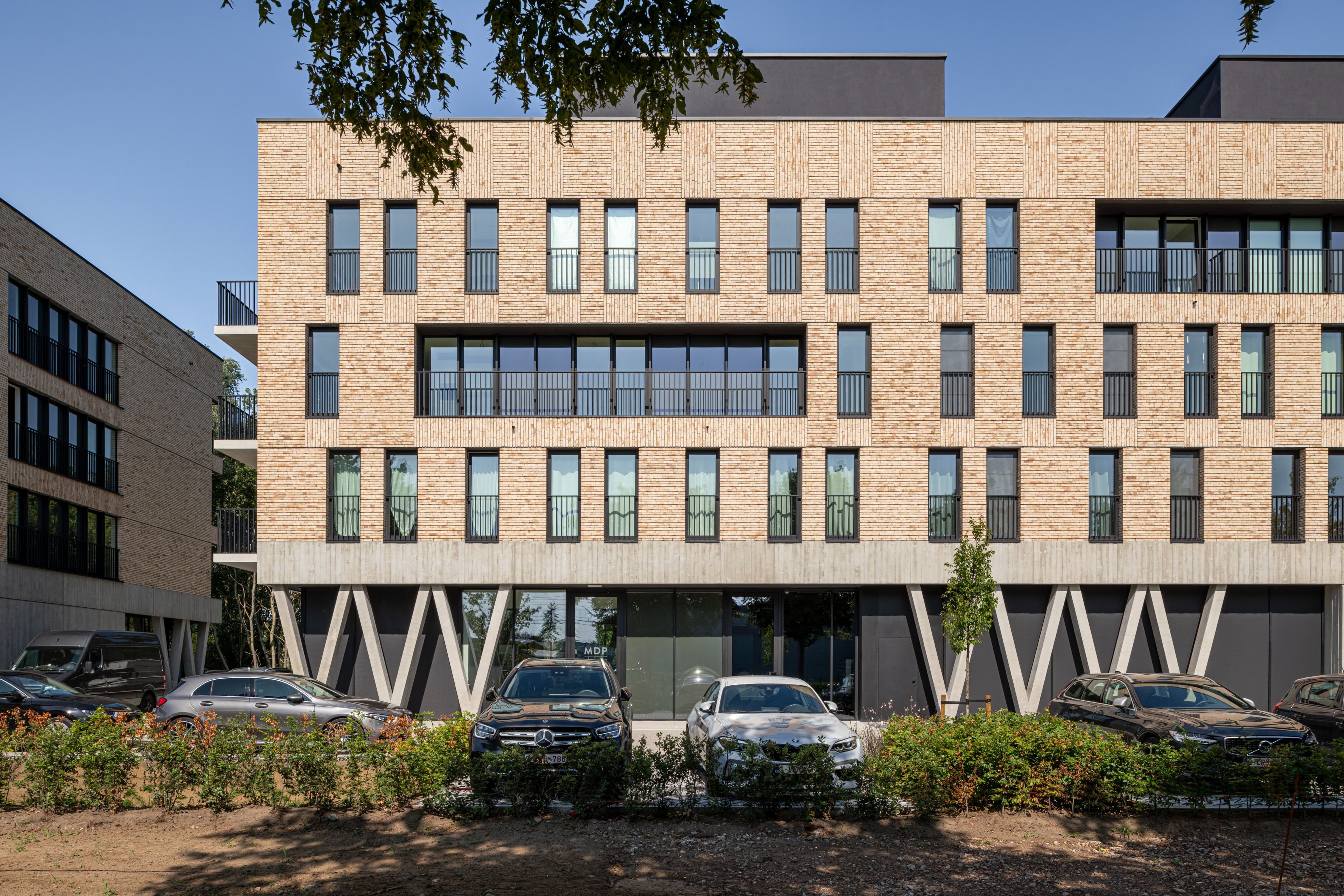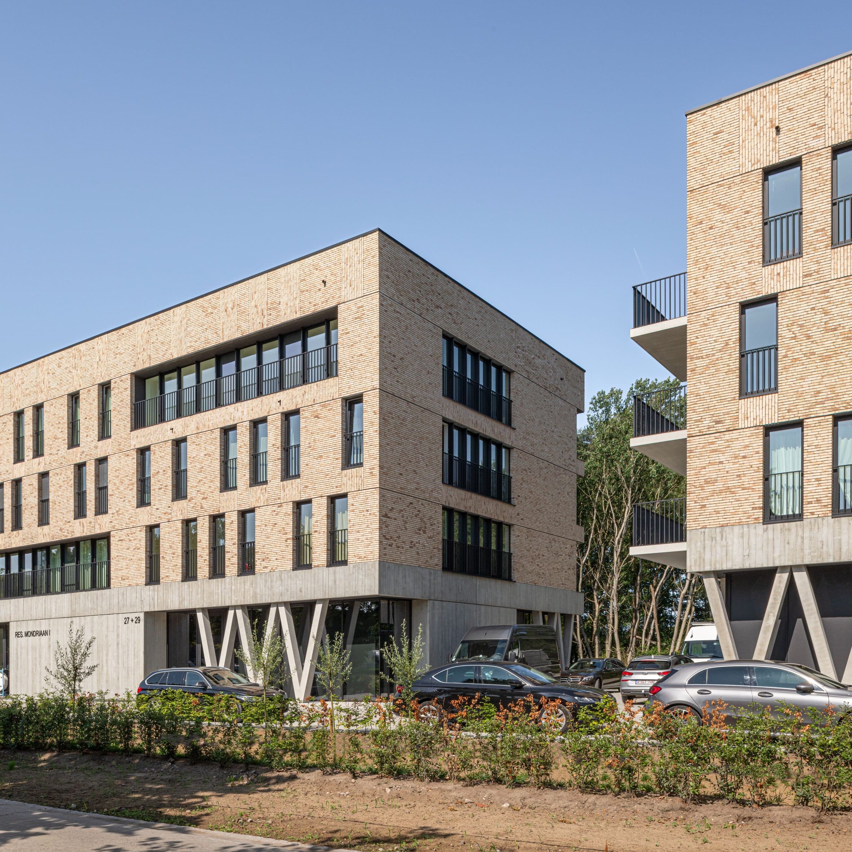 Michiel Vergauwe PhotographyResidentie ‘Mondriaan’ vindt u aan de Jean-Baptiste de Gellincklaan, aan de rand van het centrum van St-Denijs-Westrem. Het project staat tussen een bestaand woonproject en enkele eengezinswoningen, achteraan kijkt het project uit op een beschermde groenzone.