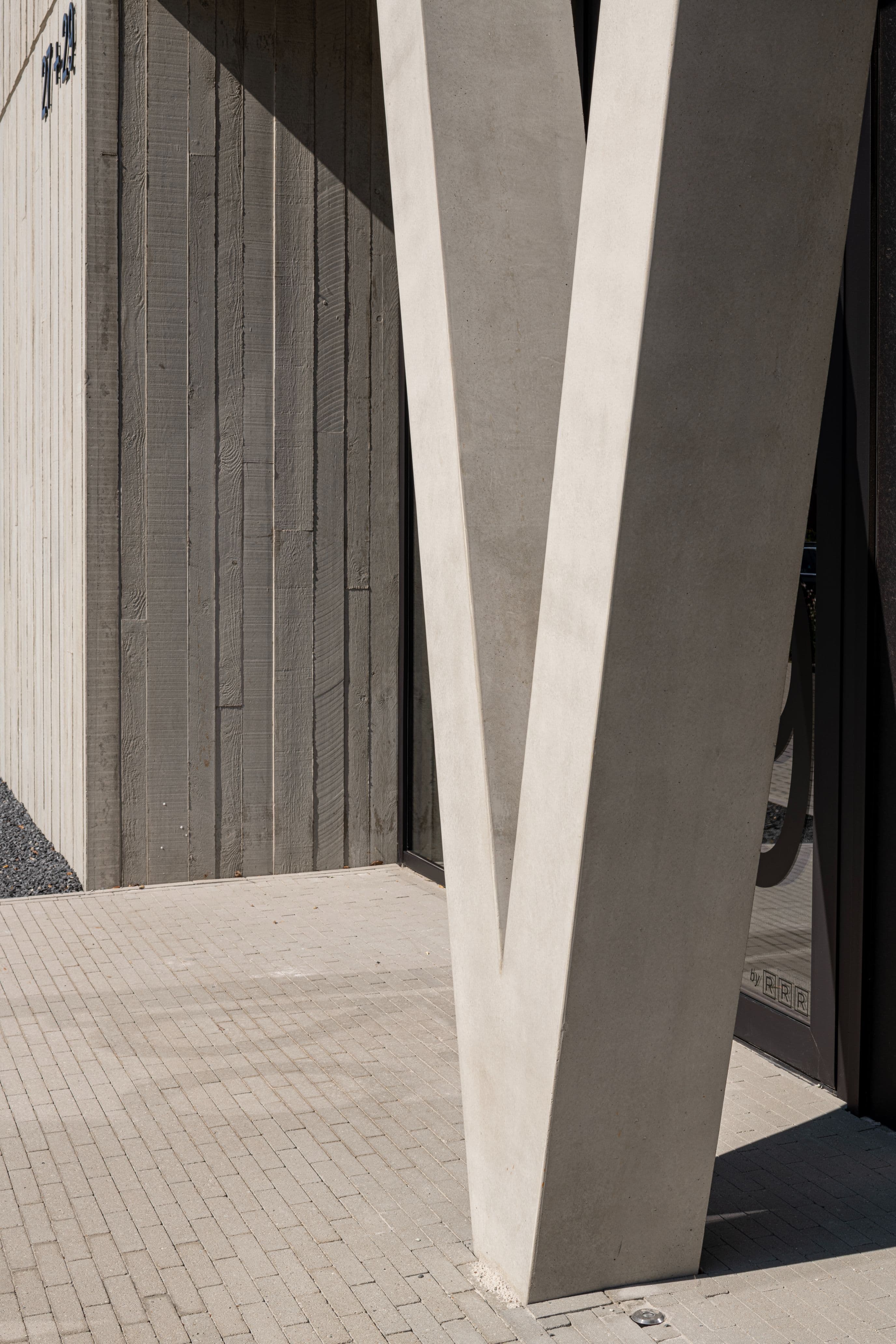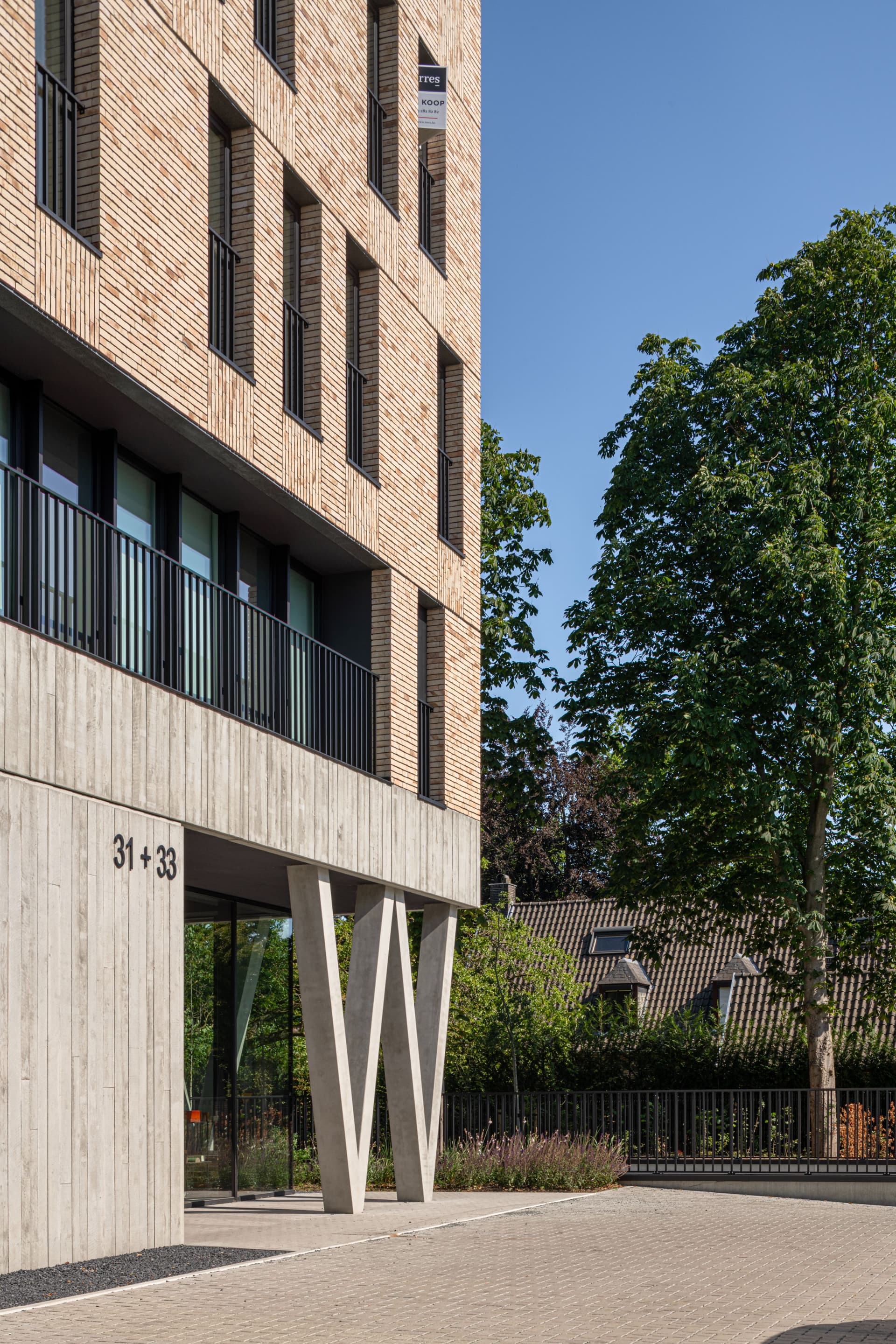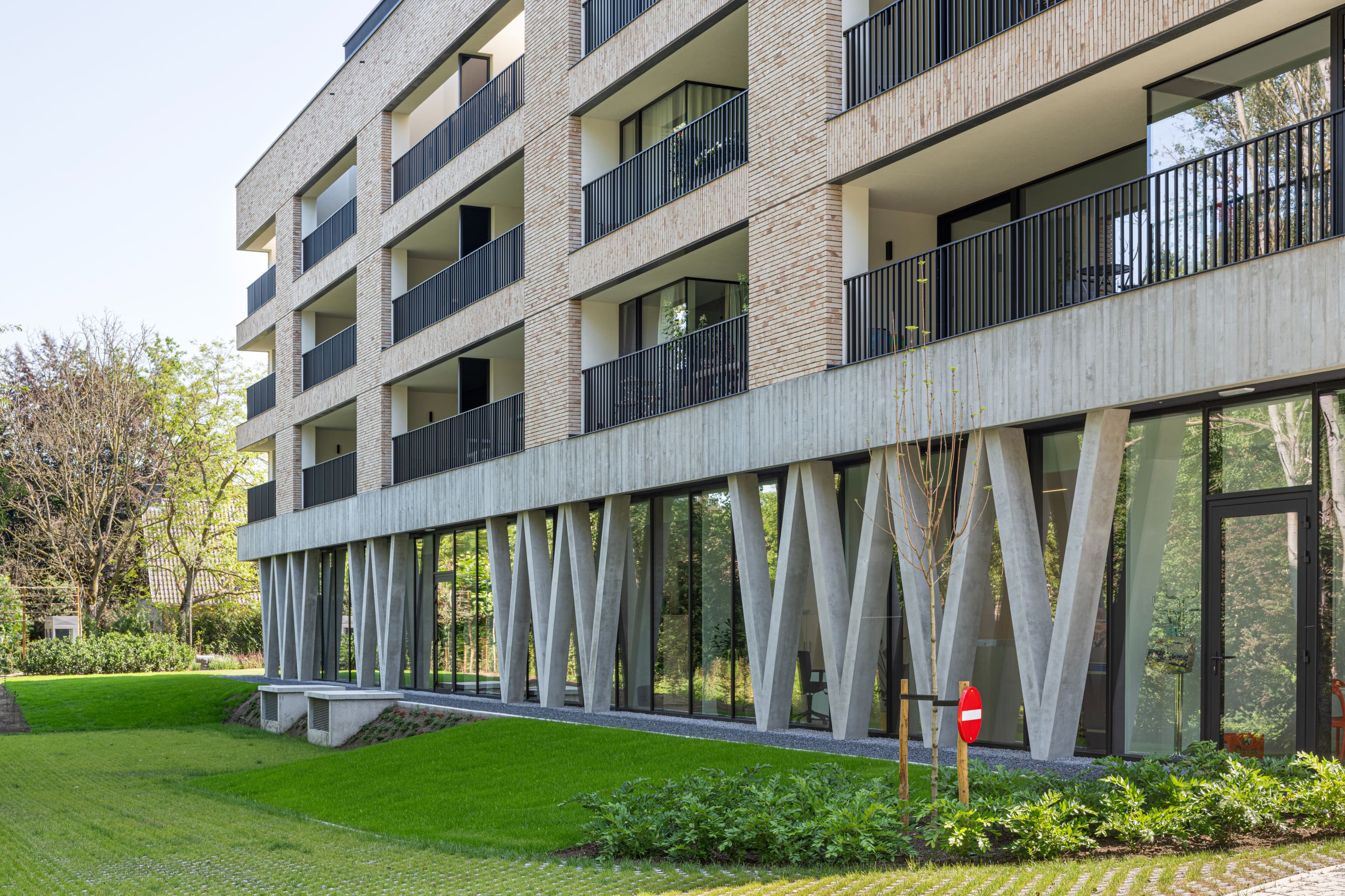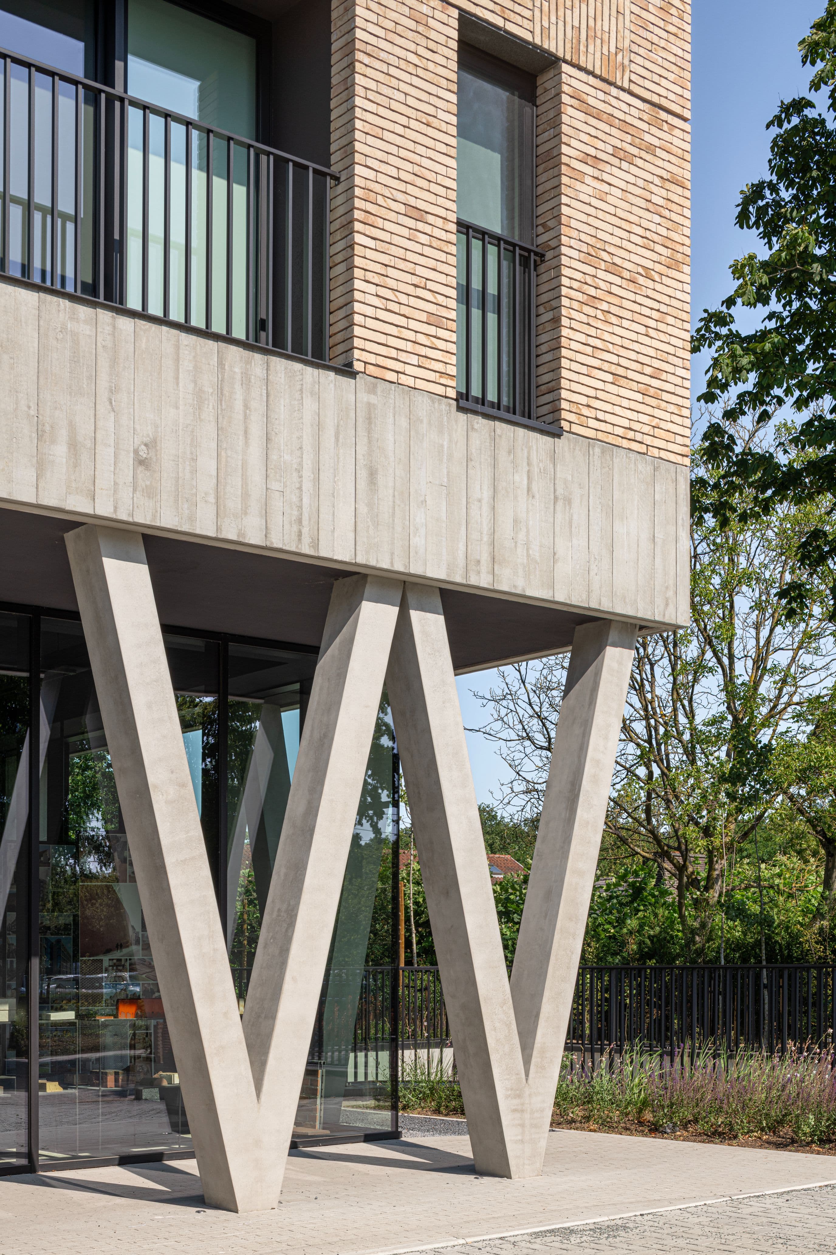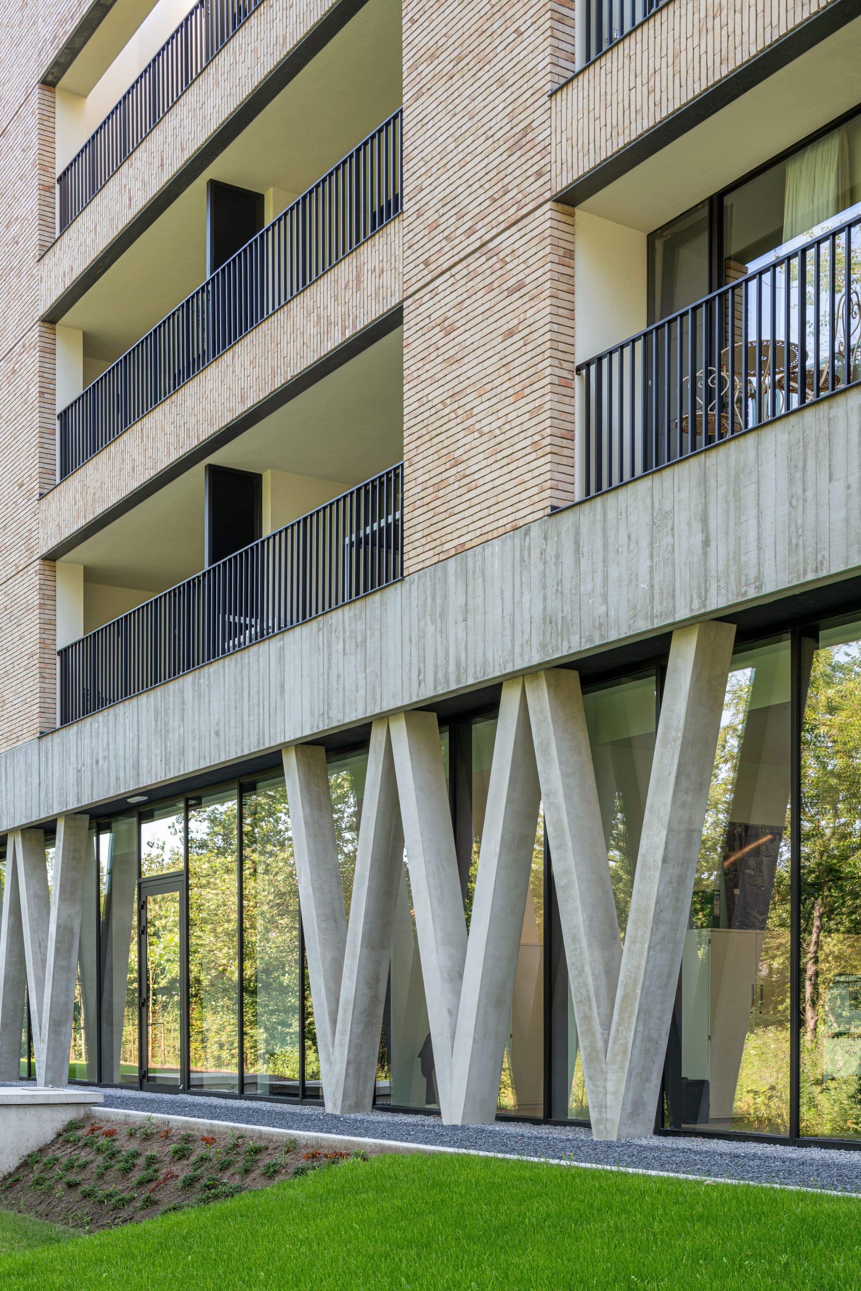 Zo ontstaat een gebouw met een sierlijke elegantie die van het zorgvuldig aangelegde terrein via ‘V’ tot niveau drie reikt. Het herbergt vele dienstverlenende functies op de begane grond en op de volgende verdiepingen 18, respectievelijk 23 appartementen. Geparkeerde auto’s en gestalde fietsen hebben een plek ondergronds om zo de visuele eenheid en rust van het residentiële complex niet te verstoren. Zo ontstaat een hoogwaardige kwaliteit van wonen, van kelder tot gang van keuken tot woonkamer. Een kwaliteit met eenvoud als een van de belangrijkste componenten.