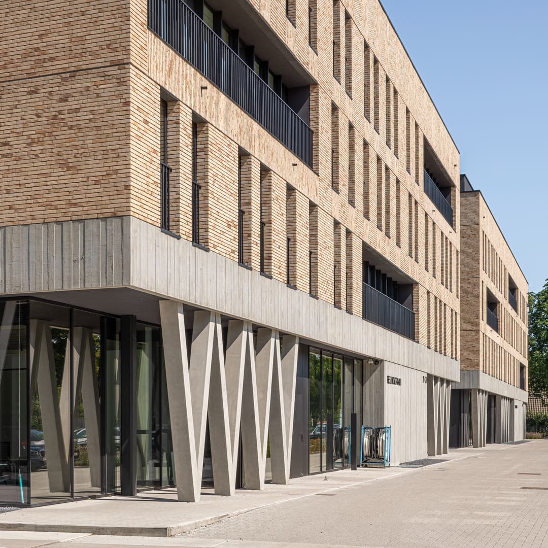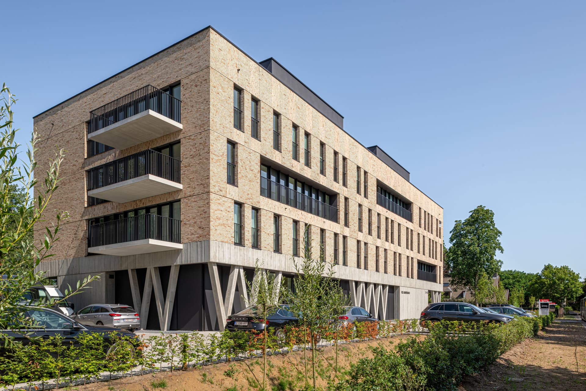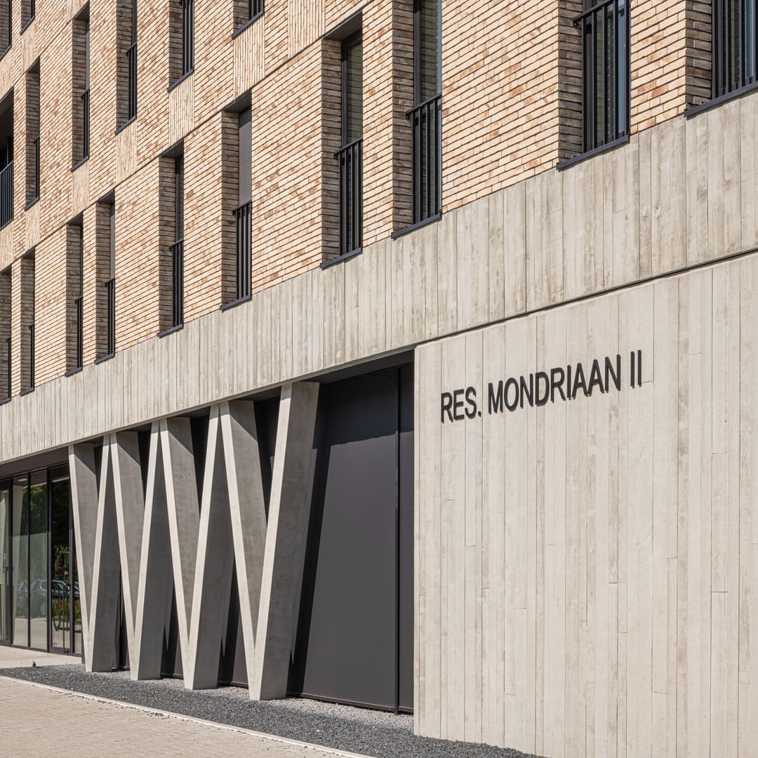 Kunstenaar Piet Mondriaan componeerde jarenlang vlakken op basis van zwarte lijnen. Op dezelfde manier werken de architecten van CAAN hier om tot abstracties van gevelsteen met beige nuances te komen. De locaties van balkons en nissen zijn weloverwogen gekozen om het framework te versterken met zwart aluminium schrijnwerk.