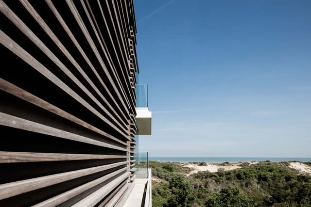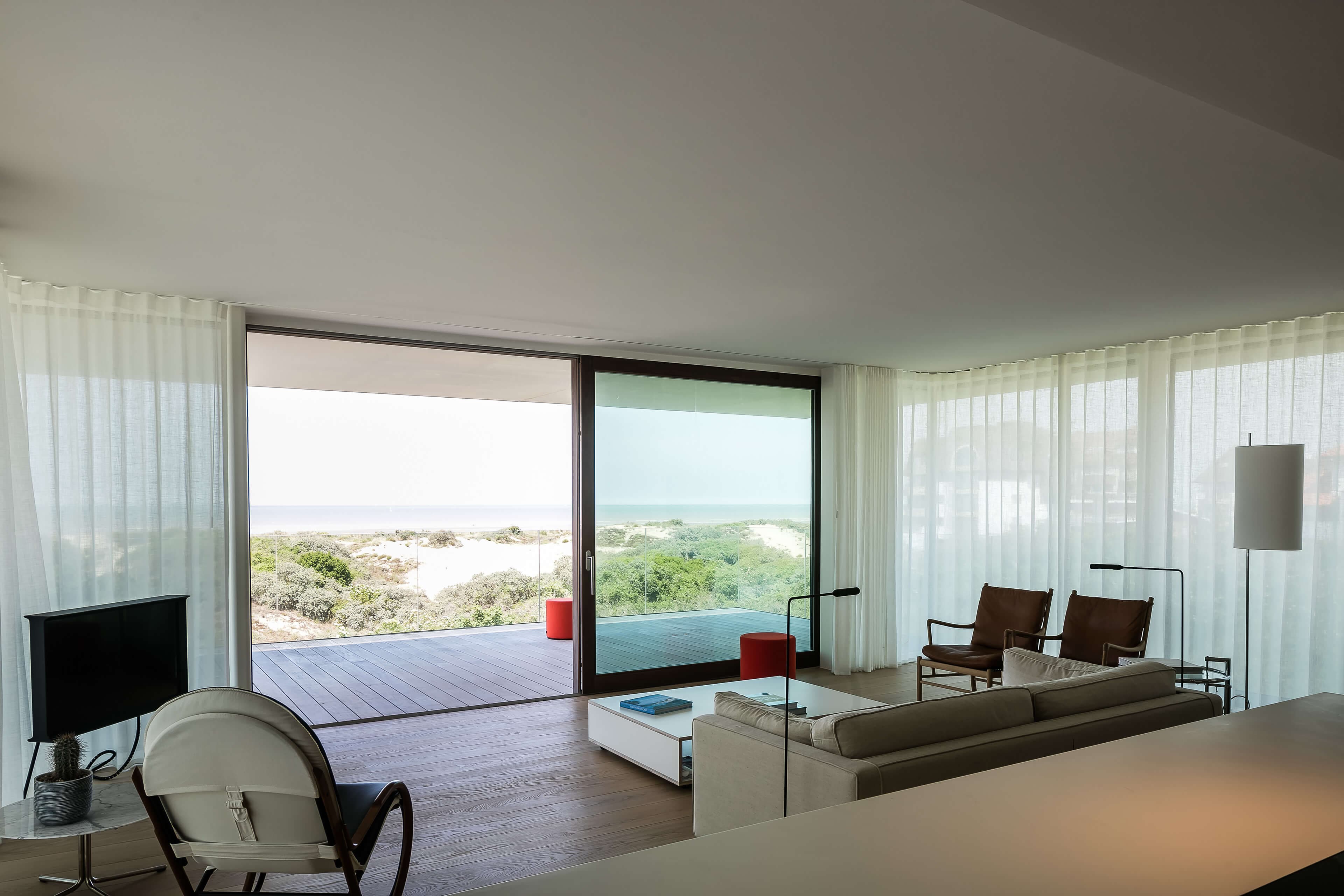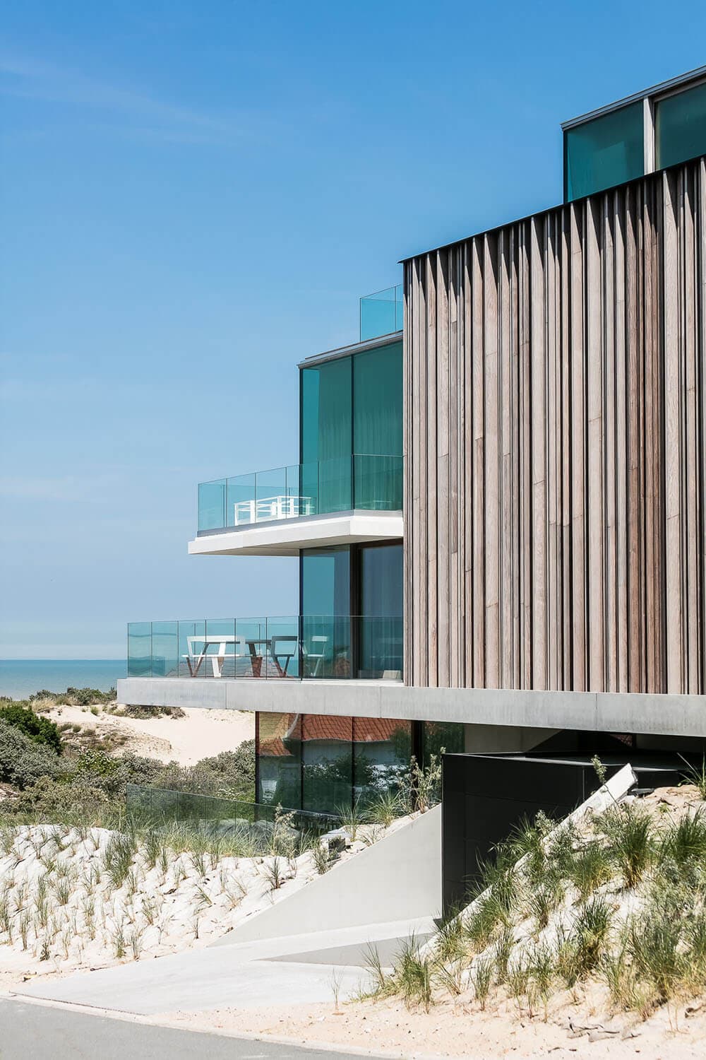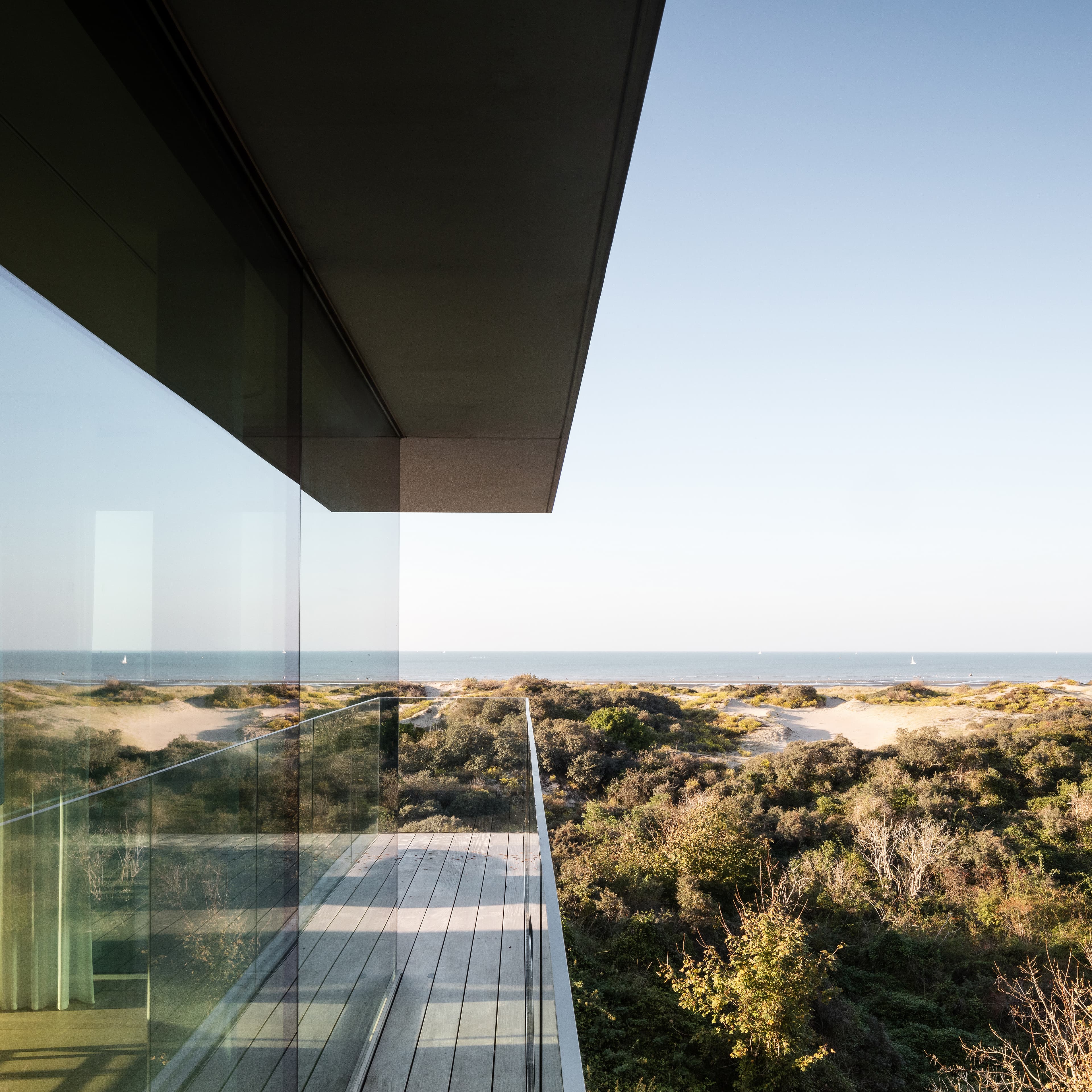 De getrapte opbouw zorgt voor een intrigerend spel van zwevende terrassen. De open gevels versterken het breedbeeld op de Noordzee, haar duinen en natuurgebied. Om het in architecturaal jargon te omschrijven: strakke gereduceerde profielontwikkeling in frontale confrontatie met zee, duin en natuur.