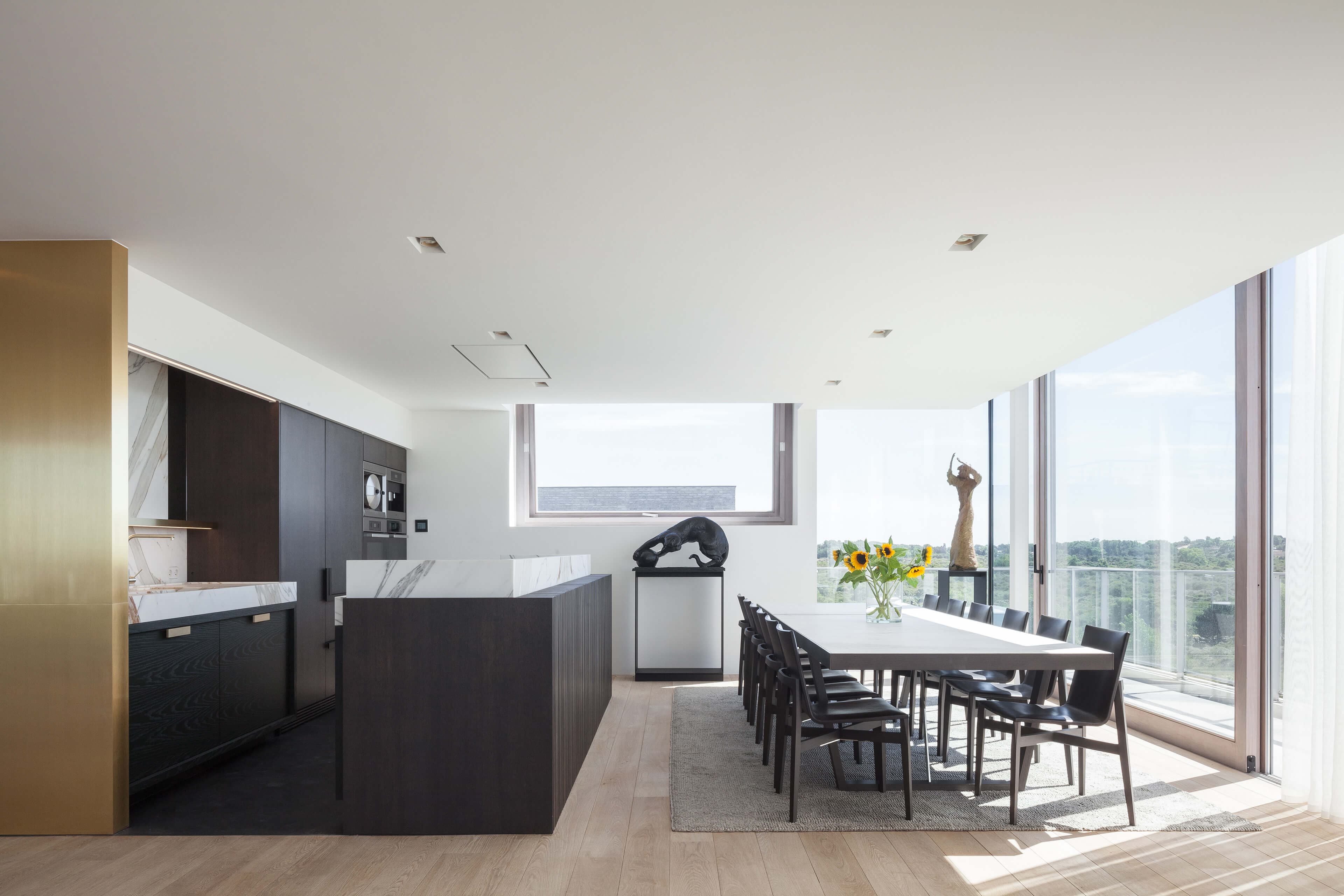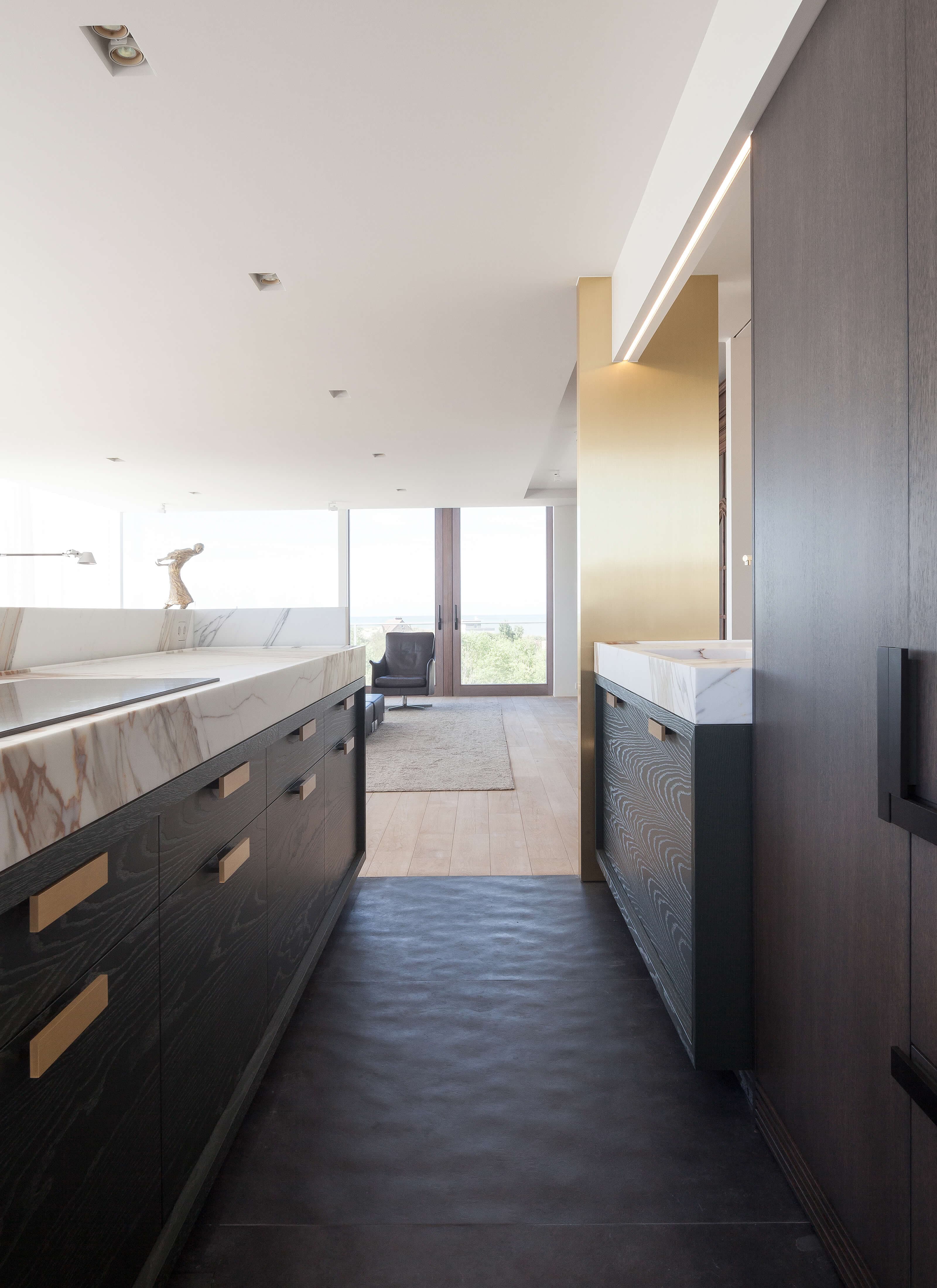 Binnen is het credo “Less is more”. De gebruikte materialen bepalen de sfeer. Op de vloer zien we licht getint eiken, de kastfronten zijn van donker getint eiken. In de goed uitgeruste keuken contrasteert het witte Calacatta marmer van de werkbladen en de spoeltafels met de donkere kastfronten en inox handgrepen.