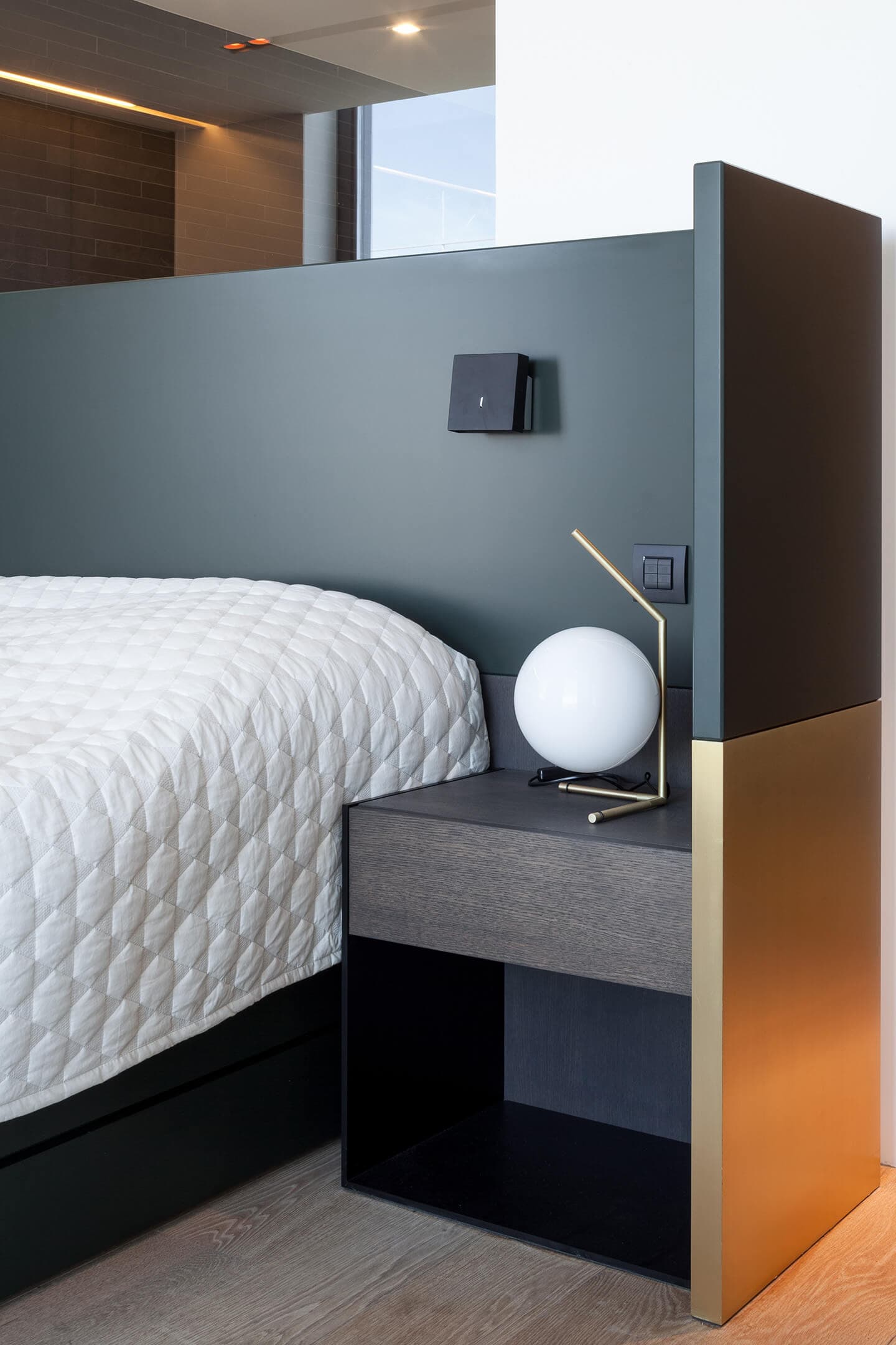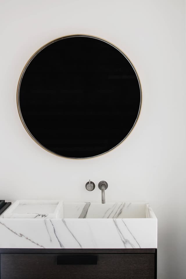 In de badkamer creëren de met zwarte leisteen afgewerkte vloeren, badwanden, inloopdouche en wastafel een intimistische sfeer. De vloer bestaat uit grote leisteentegels, de bad- en douchebekleding uit smalle leisteenrepen met een onregelmatige reliëfstructuur. Ook hier zorgt wit Calacatta marmer voor een fraai accent.