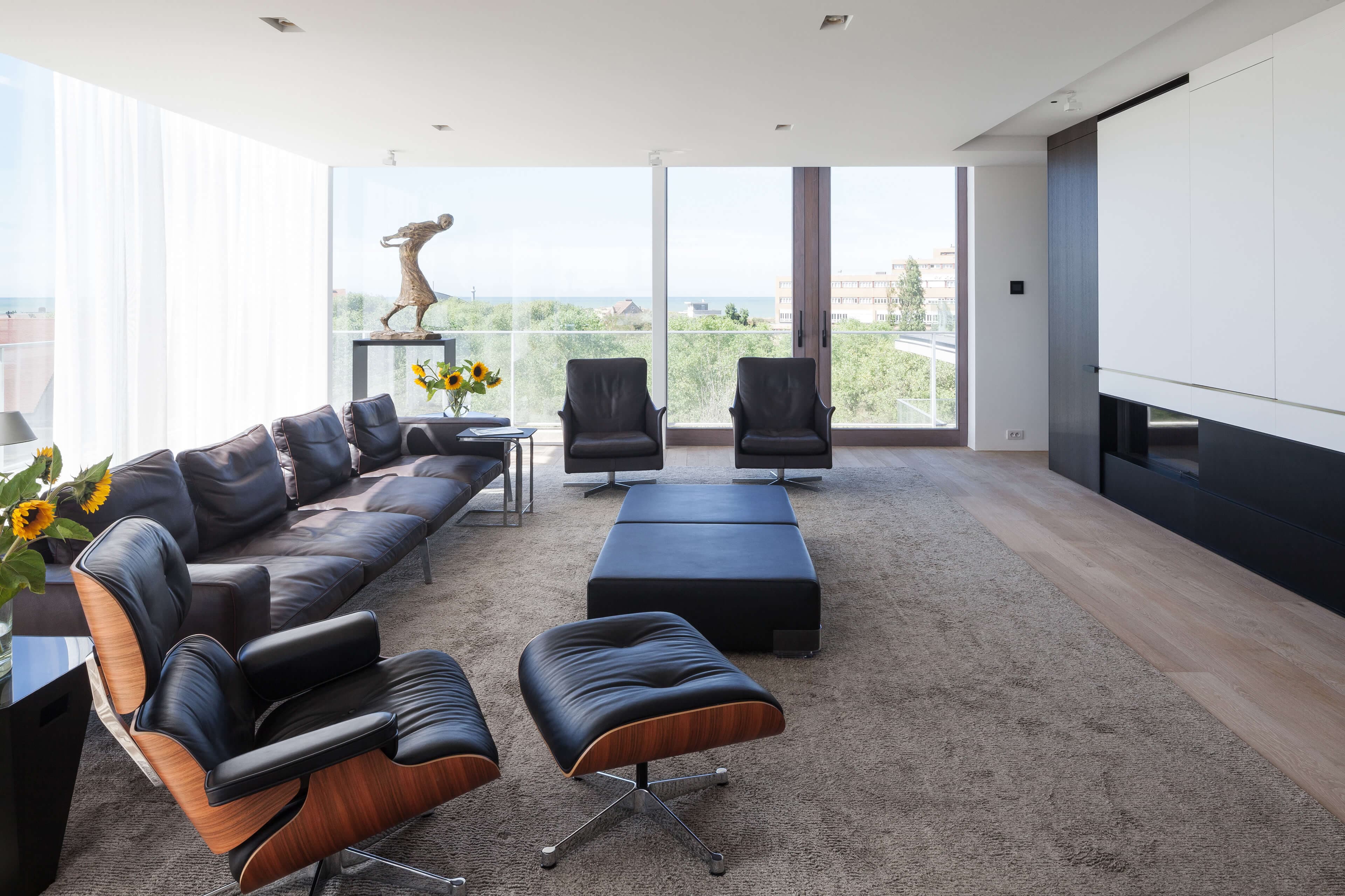 Het dakappartement, goed voor 240 m² woonruimte en 350 m² terrassen, bevindt zich op de derde verdieping. Het architectenbureau Govaert & Vanhoutte tekende voor de krachtige hedendaagse architectuur in hout, glas en beton.