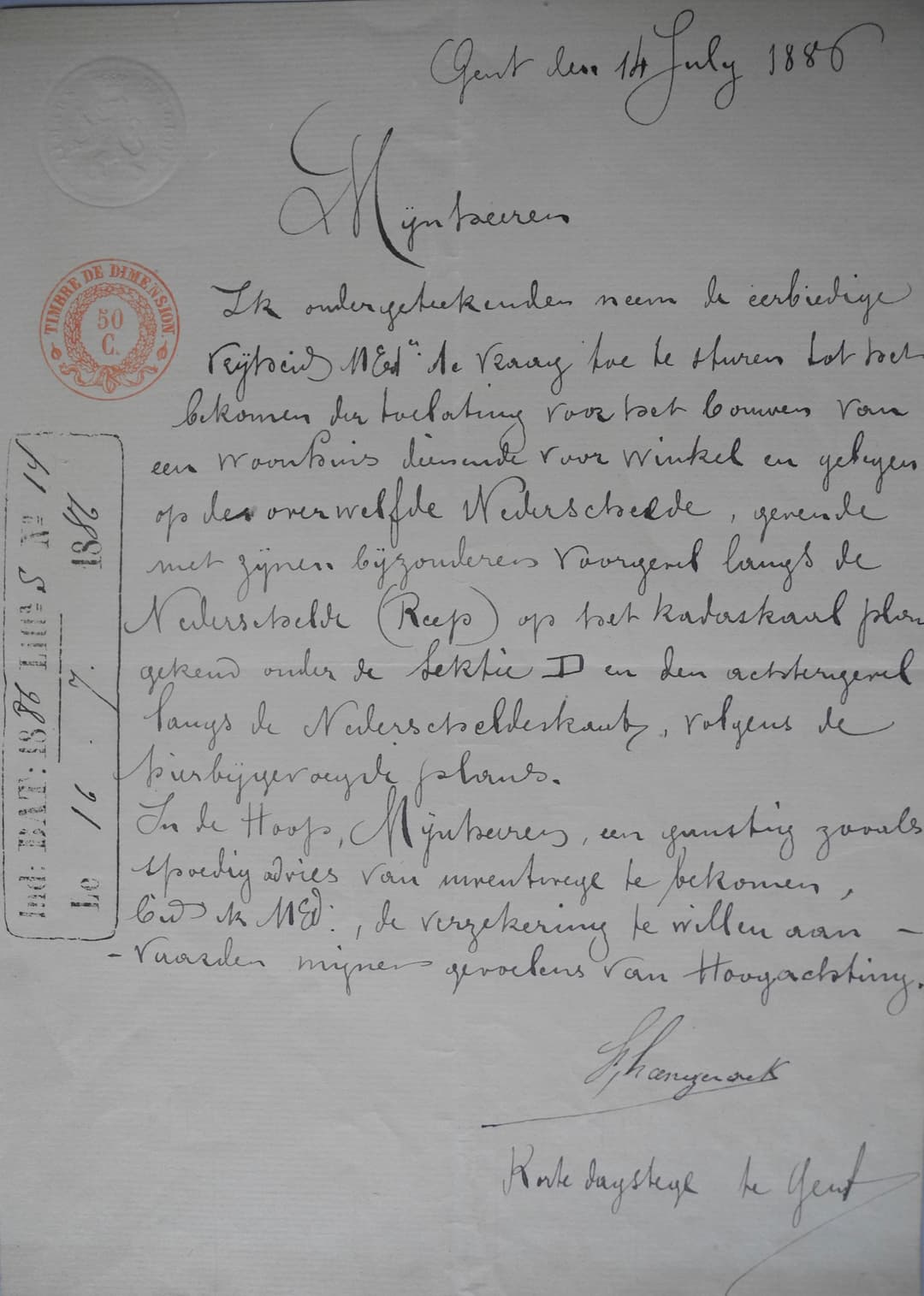 Ik ondergetekenden neem de eerbiedige vrijheid … de vraag toe te sturen tot het bekomen der toelating voor het bouwen van een woonhuis dienende voor winkel en gekregen op den overwelfde Nederschelde, gevende met zijnen bijzonderen voorgevel langs de … (Reep) op het kadastraal plan gekend onder de sectie D en den achtergevel langs de Nederscheldekant, volgens de bijgevoegde plans. In de hoop Mijnheren, een gunstig zoals spoedig advies van uwentwege te bekomen, (….), de verzekering te willen aanvaarden mijnen gevoelens van Hoogachting.