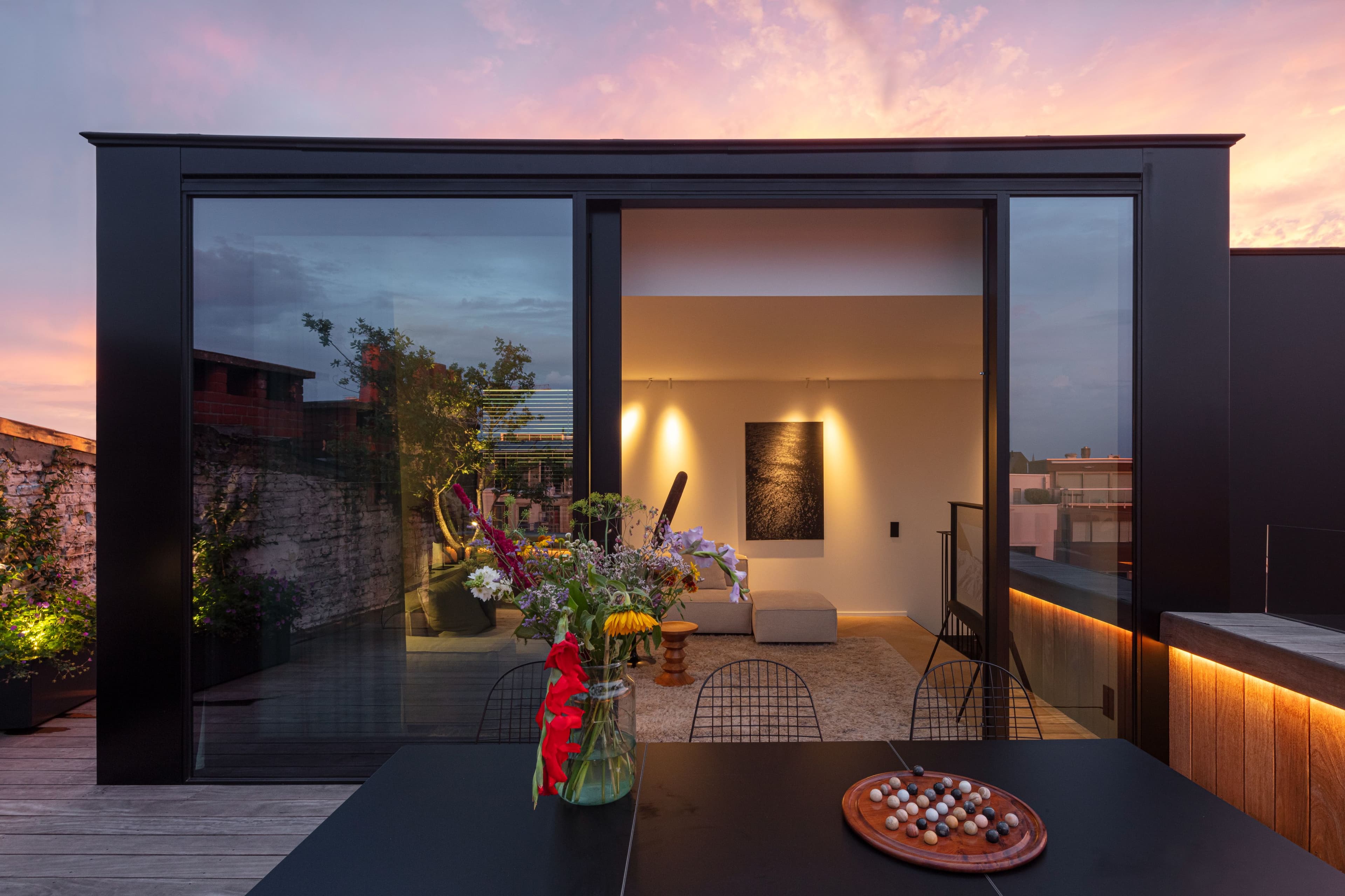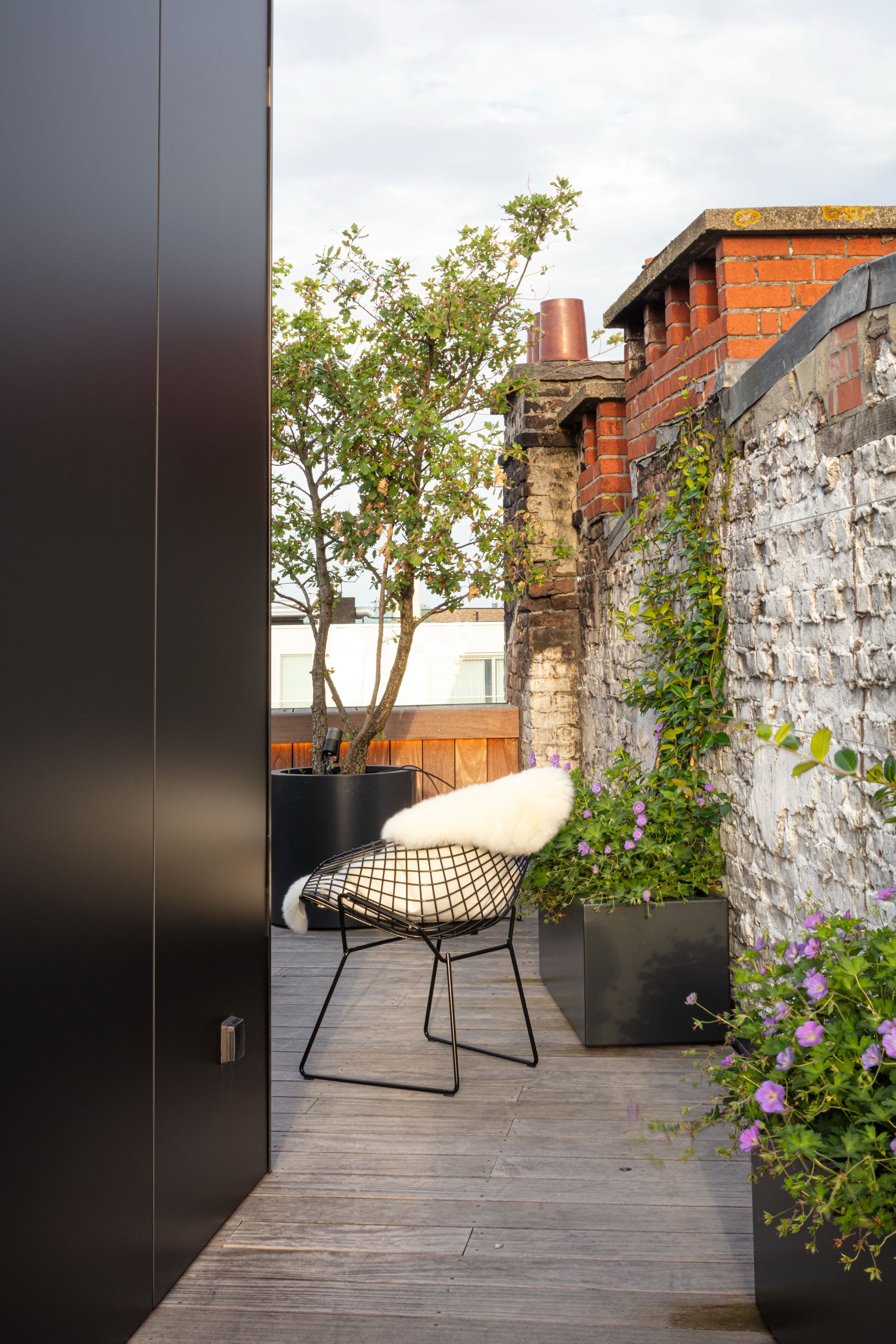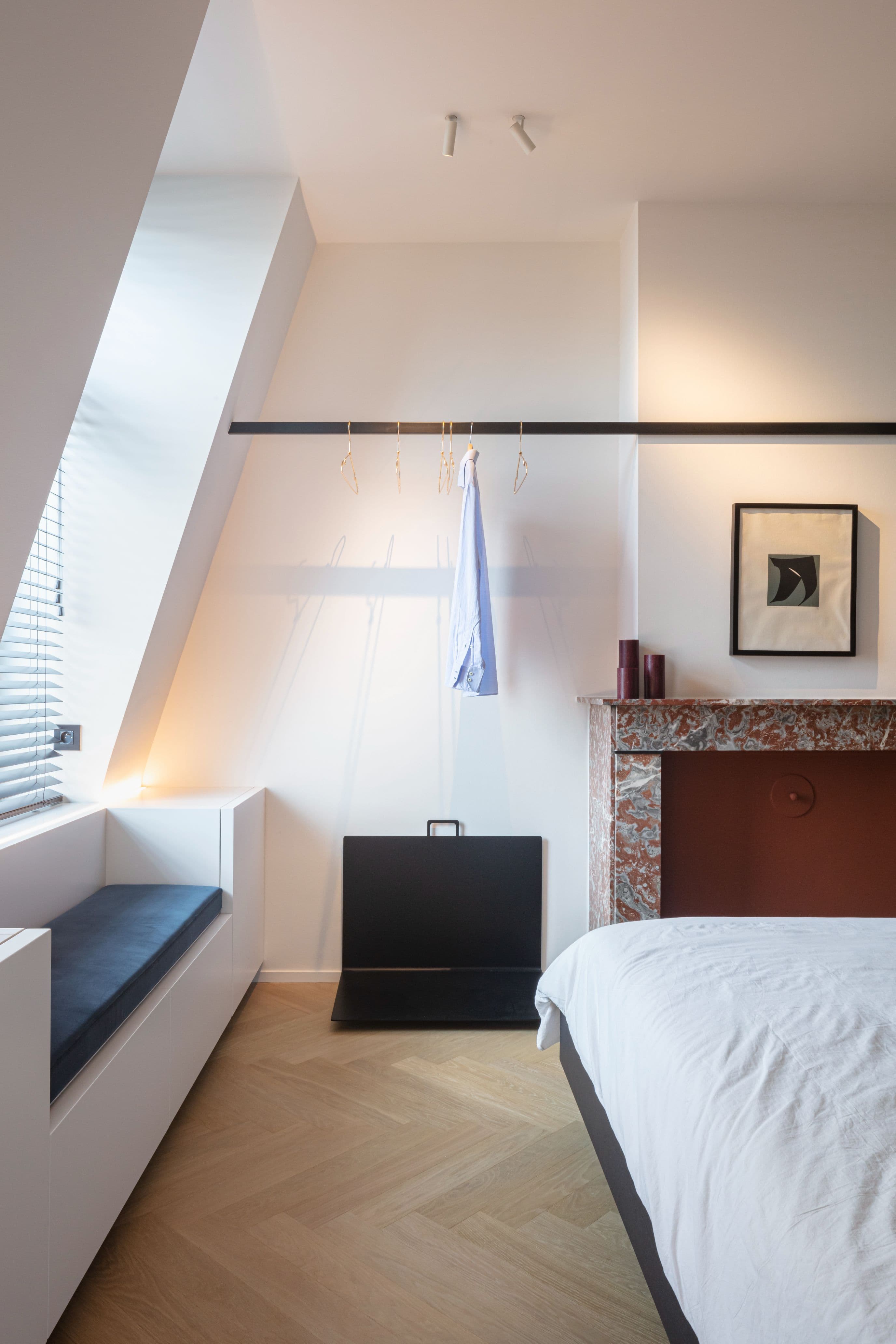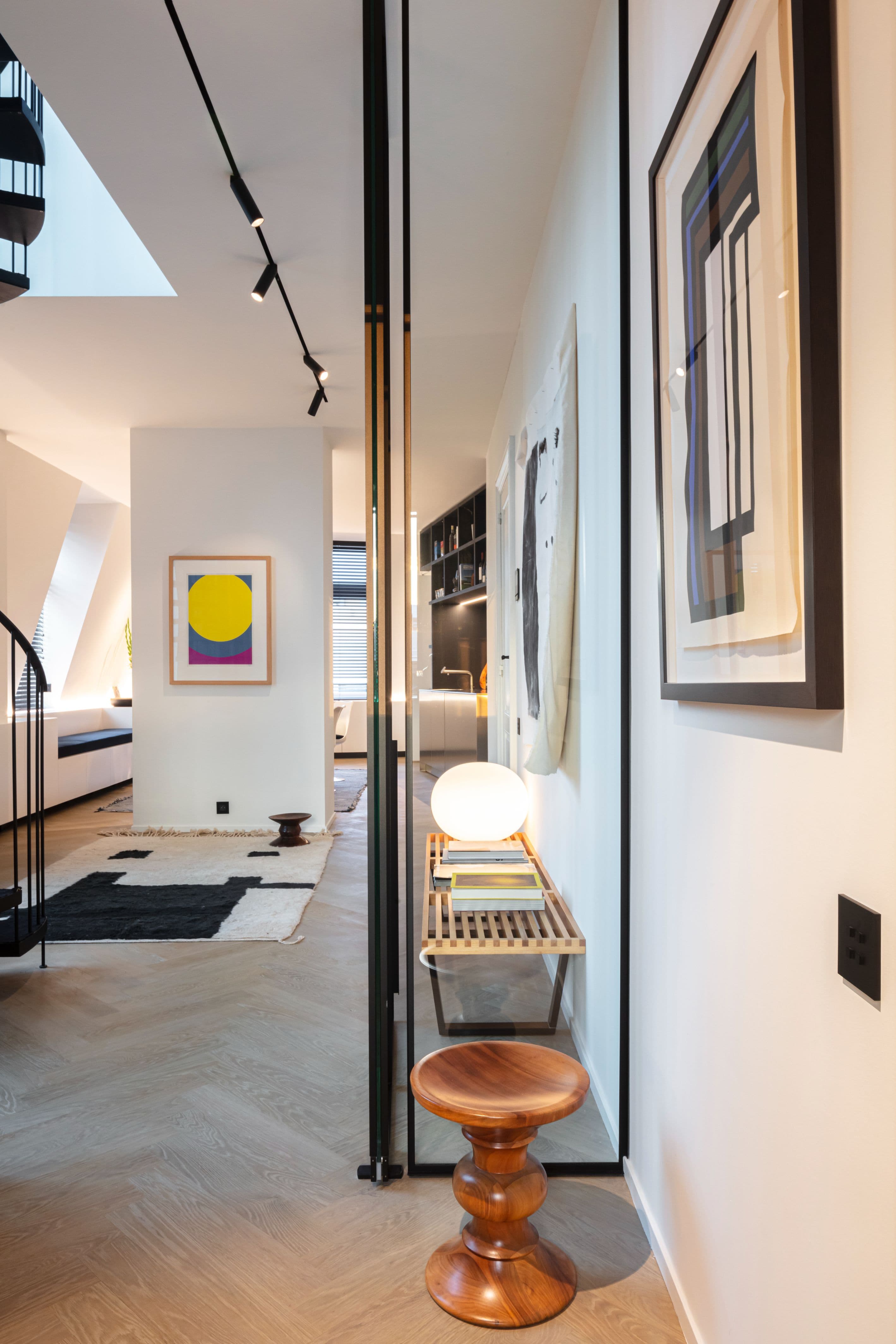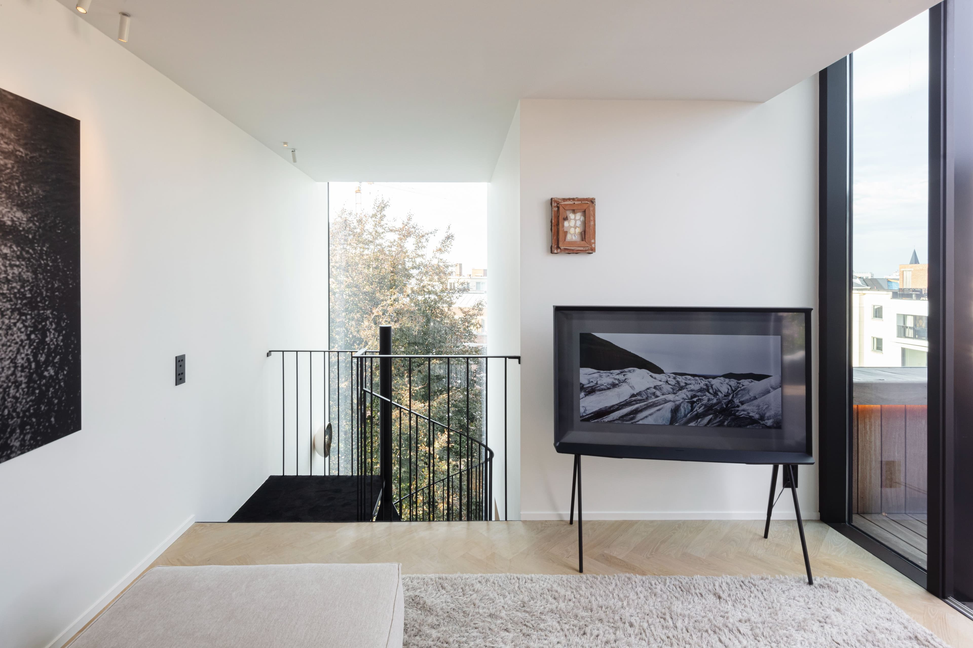 Niettegenstaande het appartement een beperkte oppervlakte onder het dak heeft, hebben we er iets zeer fijns van kunnen maken. Er zijn verschillende doorzichten en de zon valt overvloedig binnen dankzij de ingeving van CAAN architecten die een ‘Black Box’ op het dak hebben geplaatst. Via een draaitrap langs een 6 meter hoog raam (een waar huzaren stukje) kom je boven in de living. In de zomer staat de schuifdeur wagenwijd open en heb je een direct toegang tot het terras. Als je goed luistert hoor je in de verte het geroezemoes van de passanten en water toeristen die net onder het Francois Laurentplein kunnen doorvaren.