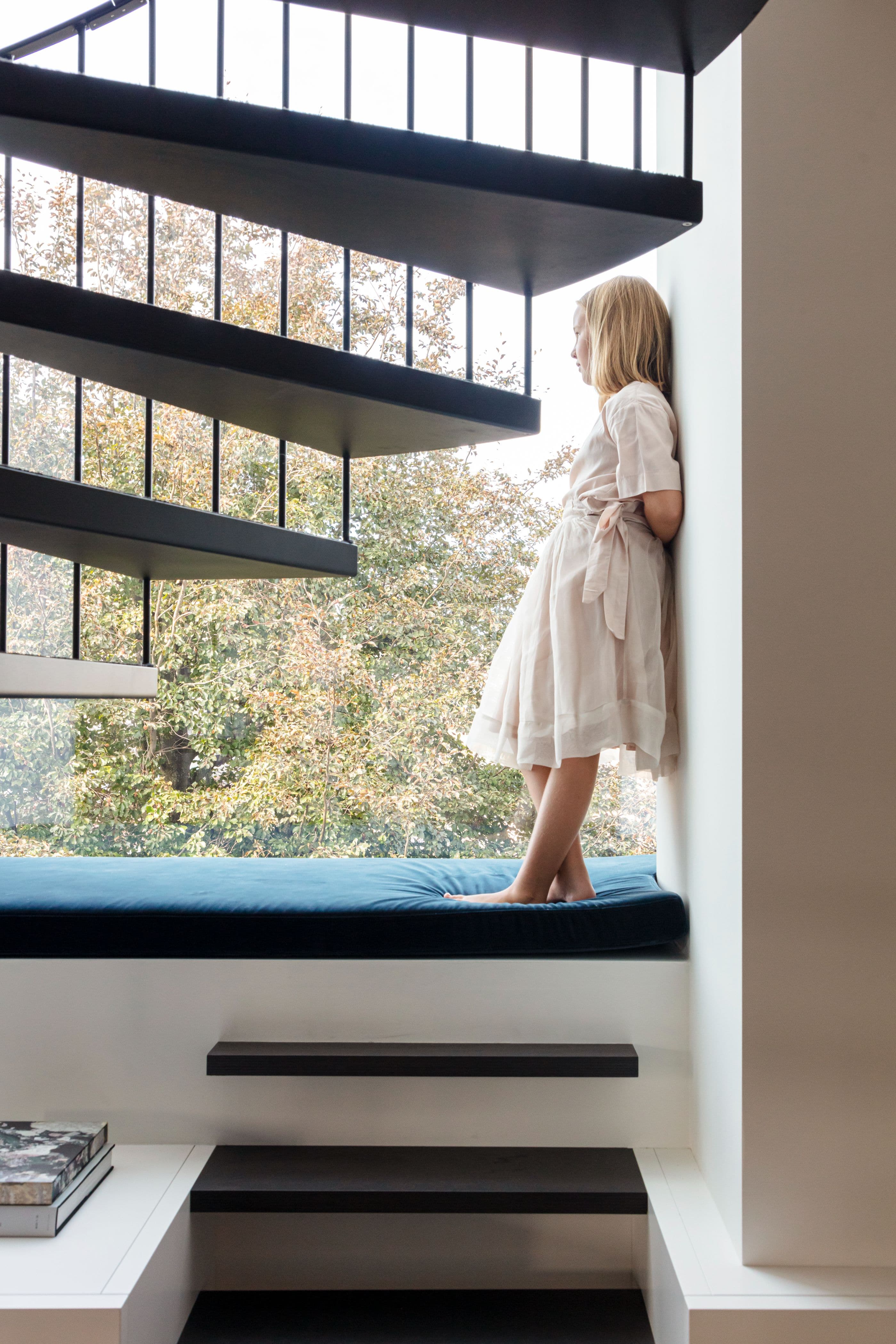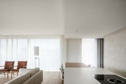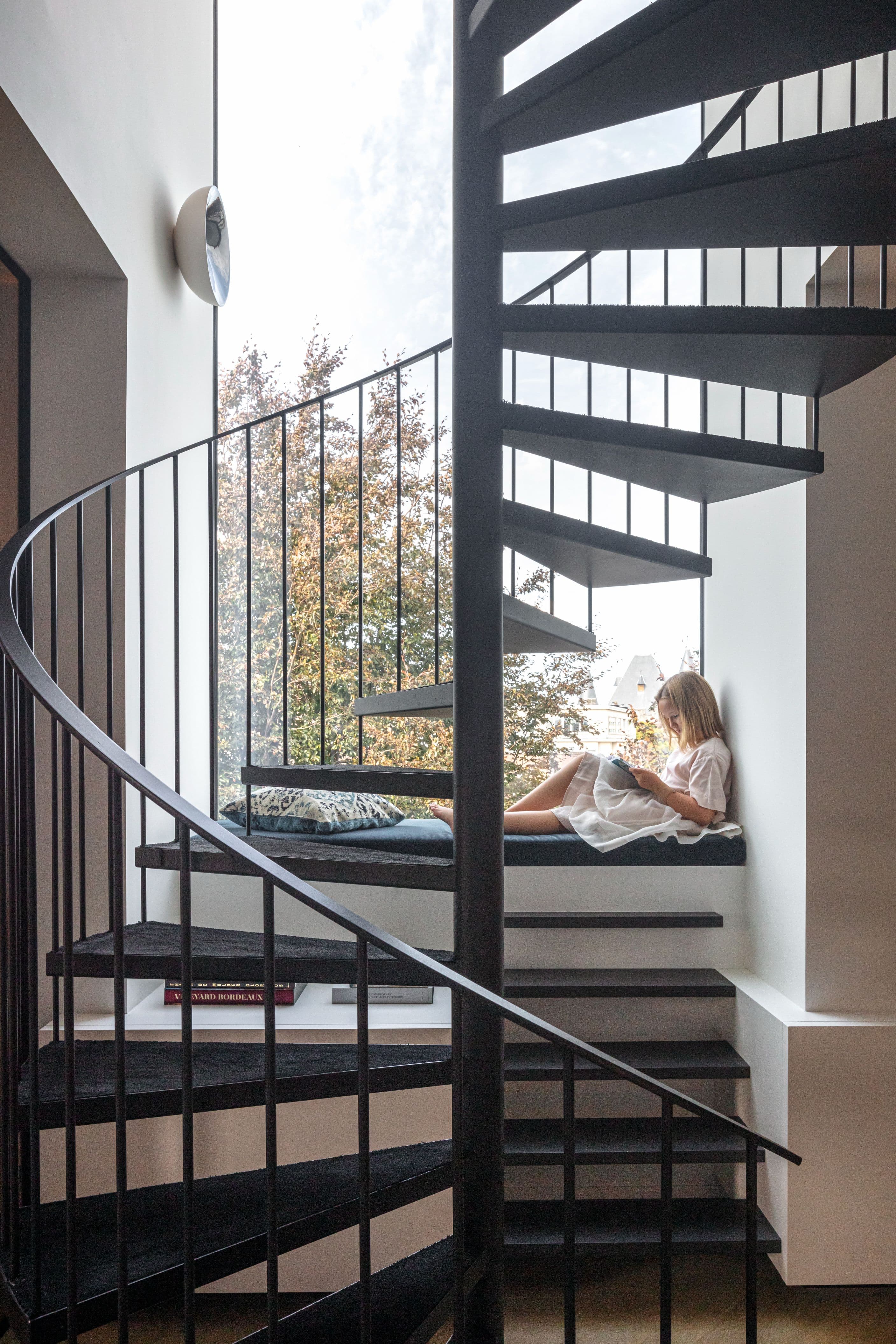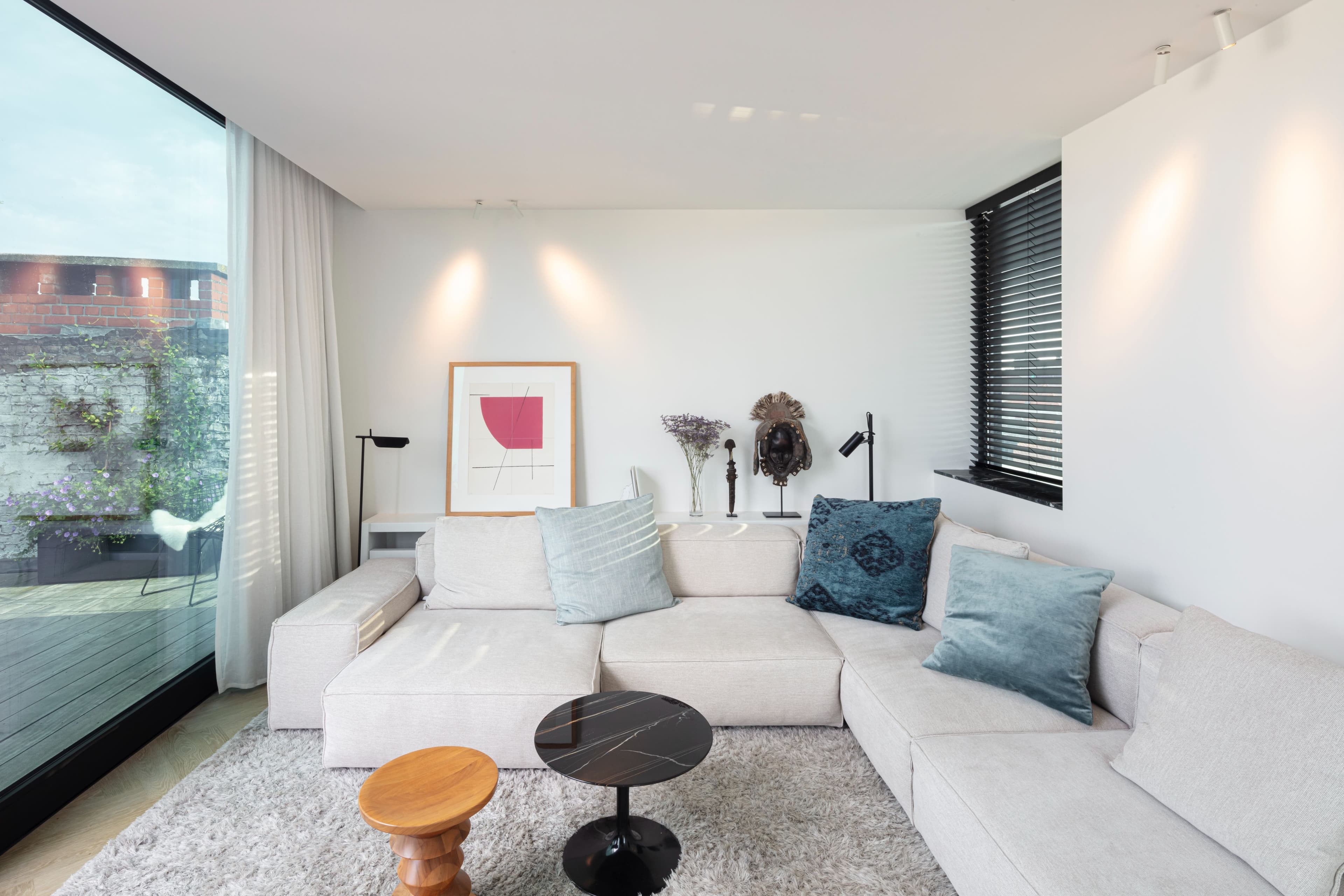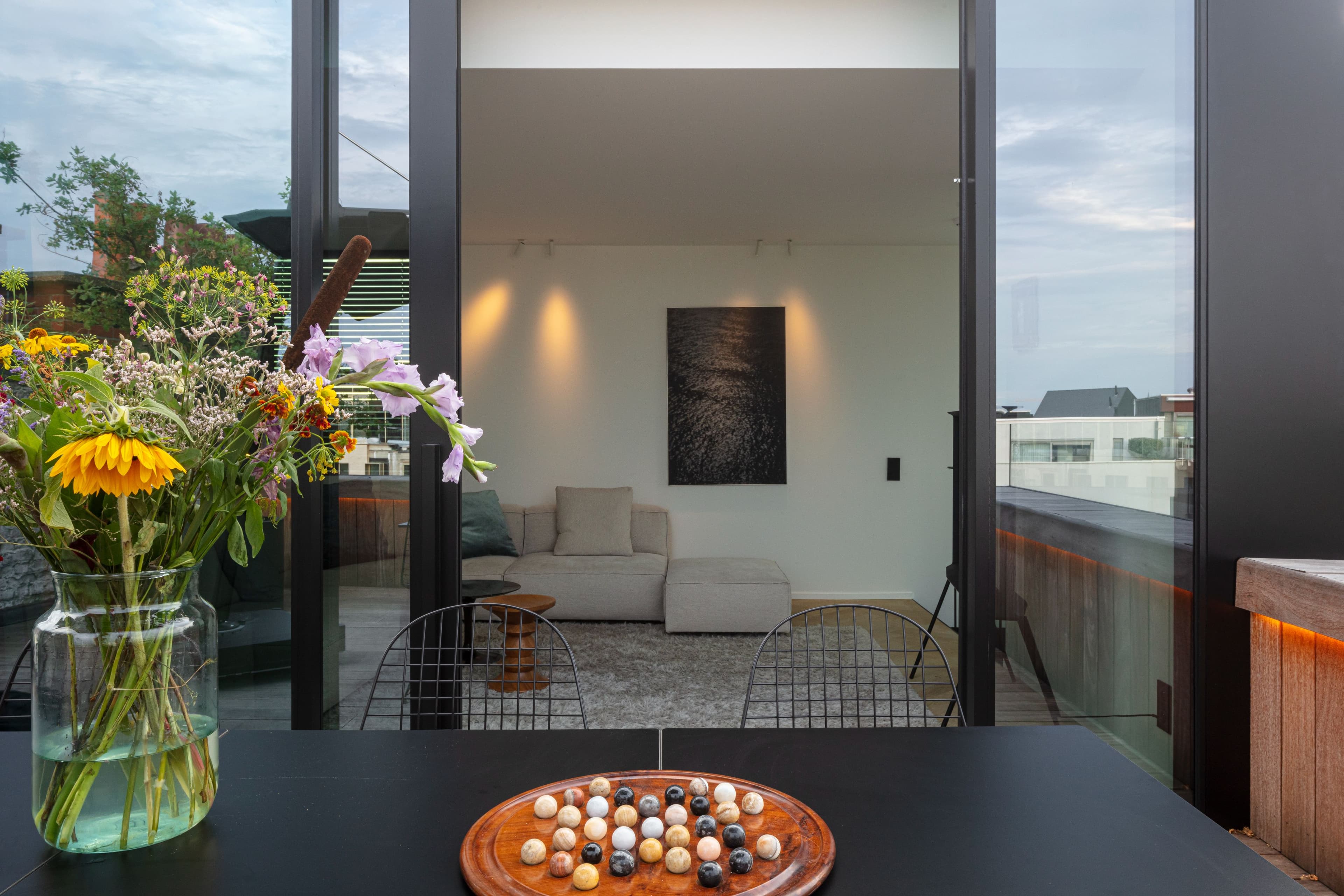 Niettegenstaande het appartement een beperkte oppervlakte onder het dak heeft, hebben we er iets zeer fijns van kunnen maken. Er zijn verschillende doorzichten en de zon valt overvloedig binnen dankzij de ingeving van CAAN architecten die een ‘Black Box’ op het dak hebben geplaatst. Via een draaitrap langs een 6 meter hoog raam (een waar huzaren stukje) kom je boven in de living. In de zomer staat de schuifdeur wagenwijd open en heb je een direct toegang tot het terras. Als je goed luistert hoor je in de verte het geroezemoes van de passanten en water toeristen die net onder het Francois Laurentplein kunnen doorvaren.