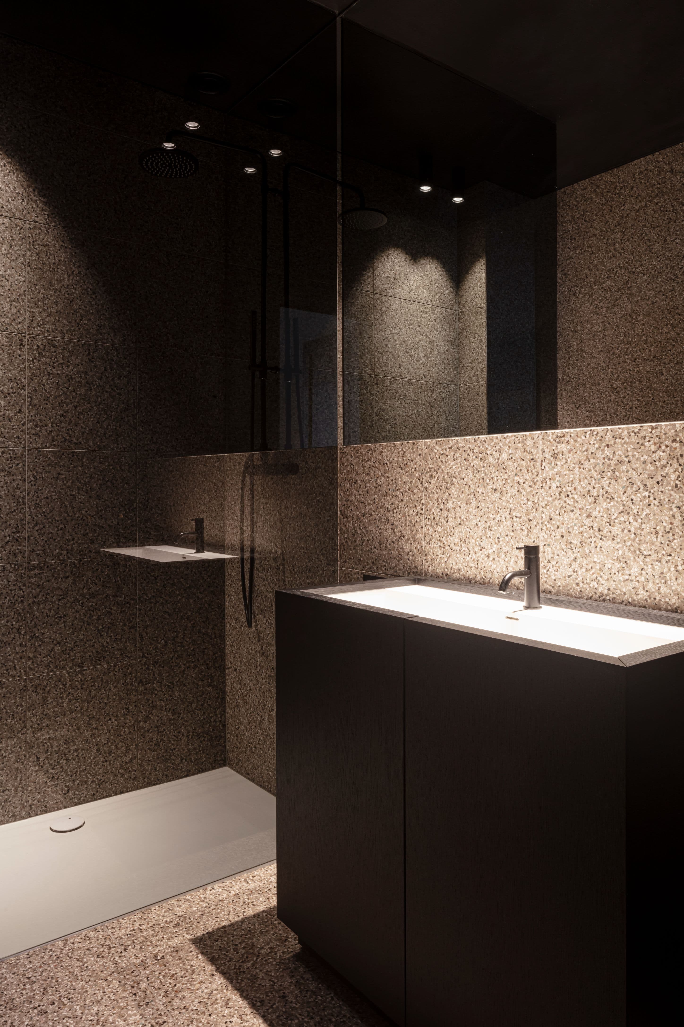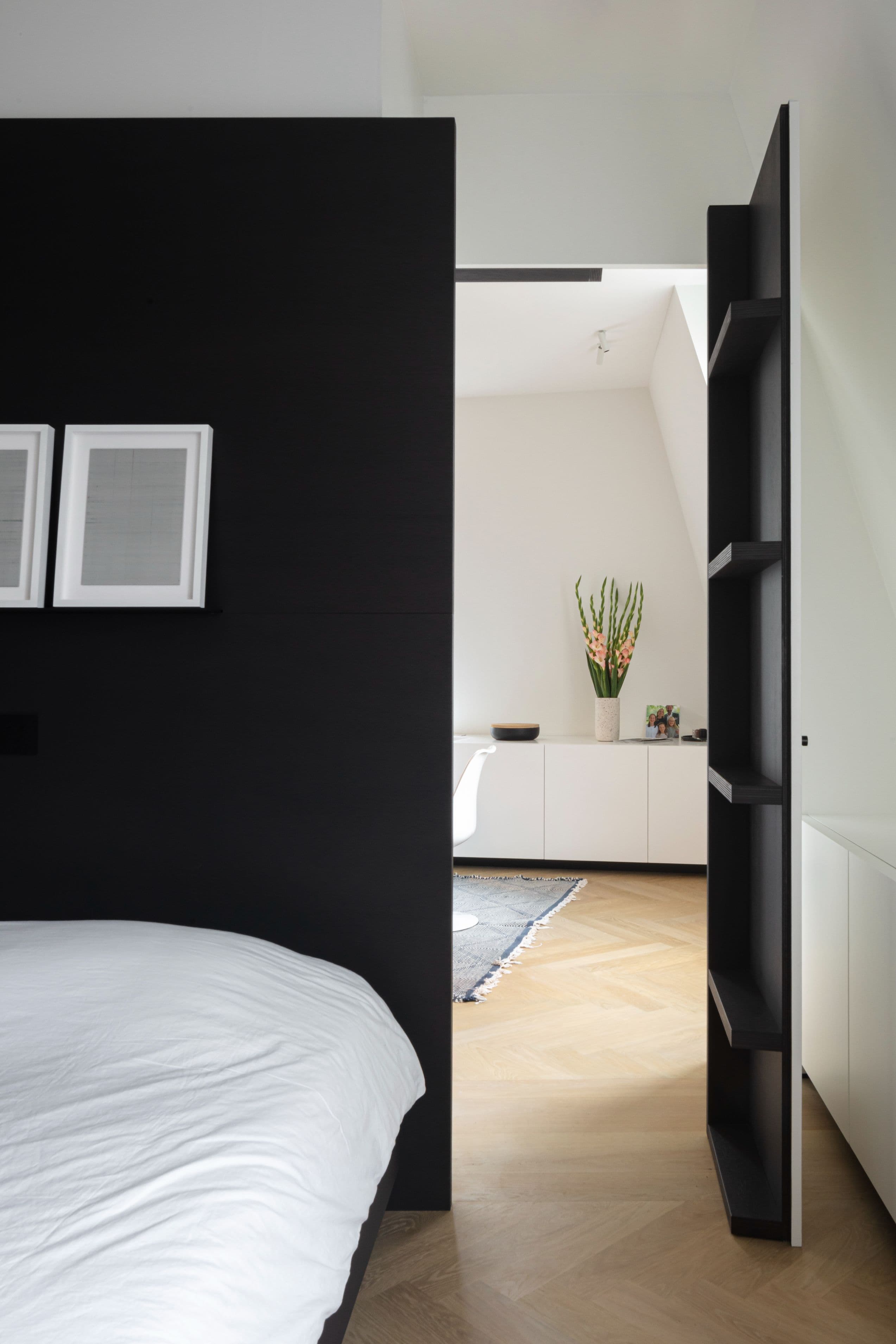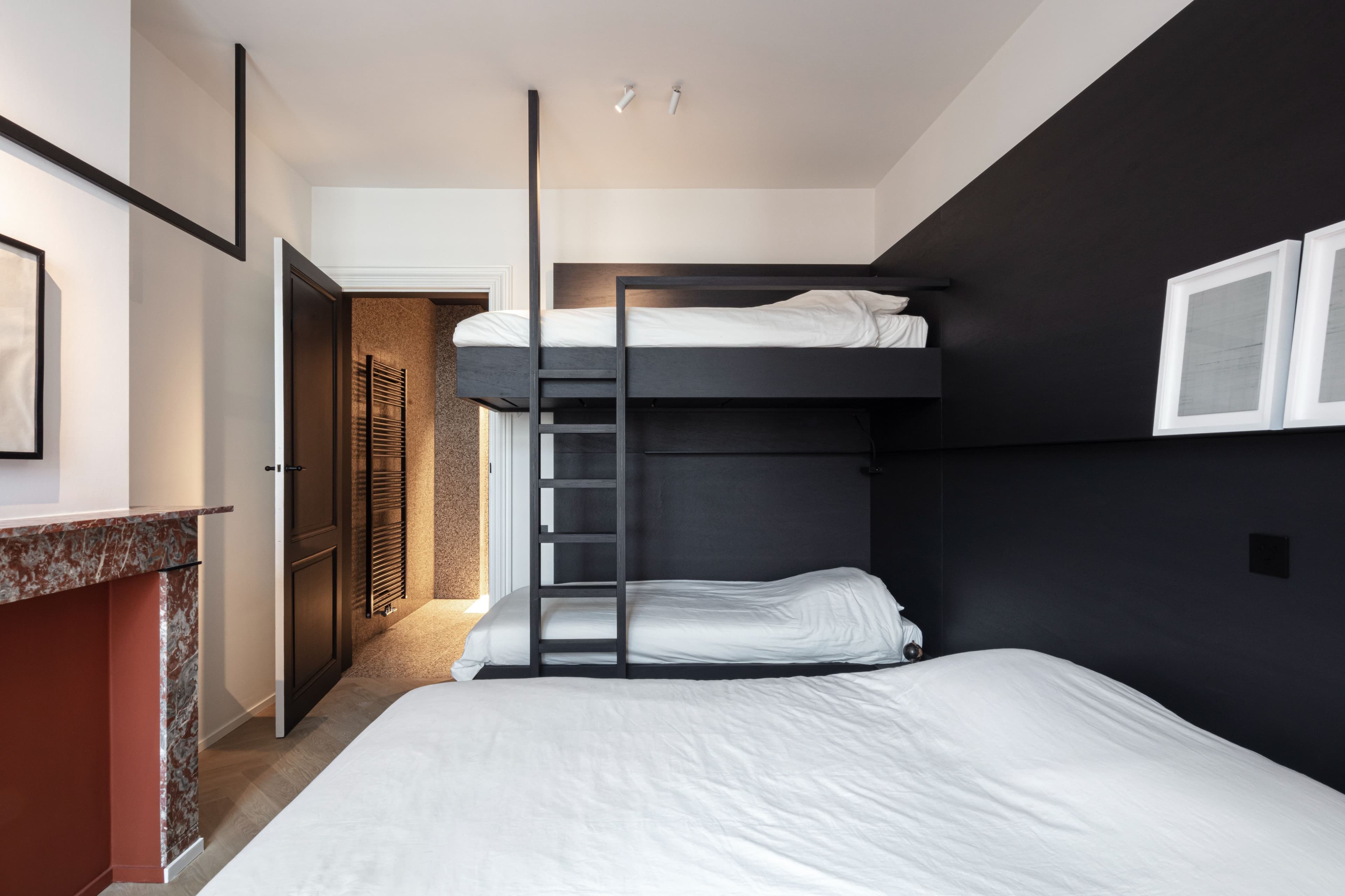 Het zit hem soms in kleine dingen maar de ‘verborgen kinderkamer’ is een van de plezante details van het appartement. Via een keukendeur kom je in de maat gemaakte kamer. Er is een dubbel bed en een stapelbed voorzien. Door het feit dat er een minimum aan materialen werd gebruikt creëer je rust. Letterlijk en figuurlijk. In de aansluitende badkamer hebben we dezelfde materialen gebruikt als de main bedroom.