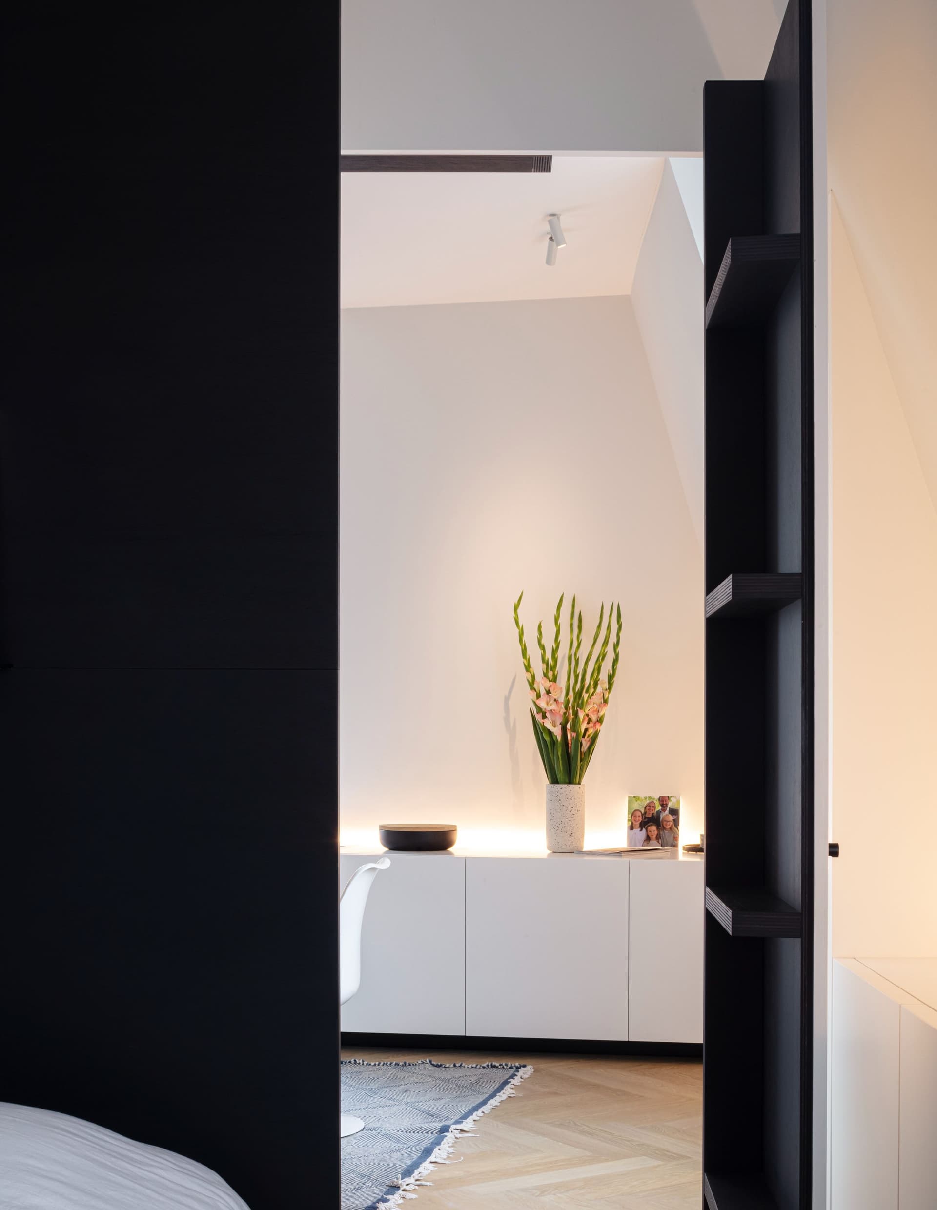 In de keuken is er een mooie wisselwerking tussen de Inox Bukthaup keuken, de groene natuursteen en het donkere hout. Onder de schuine dakrand van de voormalige zolder hebben we lage kasten voorzien met een ingewerkt lichtlijn die het hele appartement word doorgetrokken. Zo verleng je visueel de lengte van de leefruimte bij het vallen van de duisternis.
