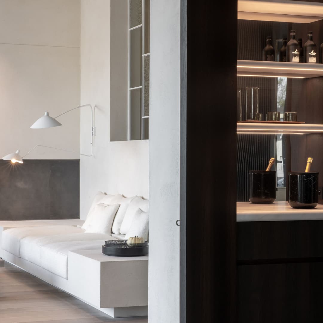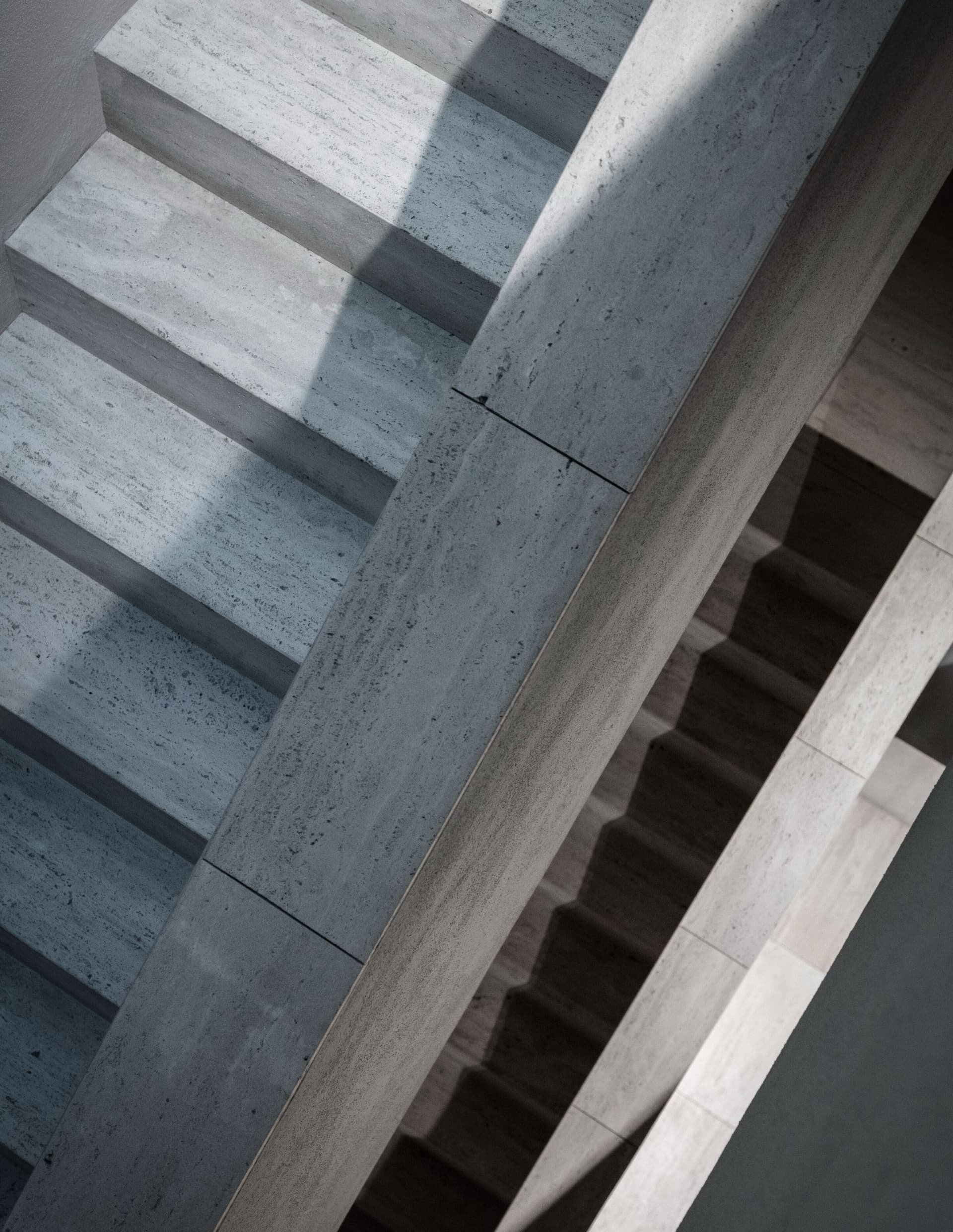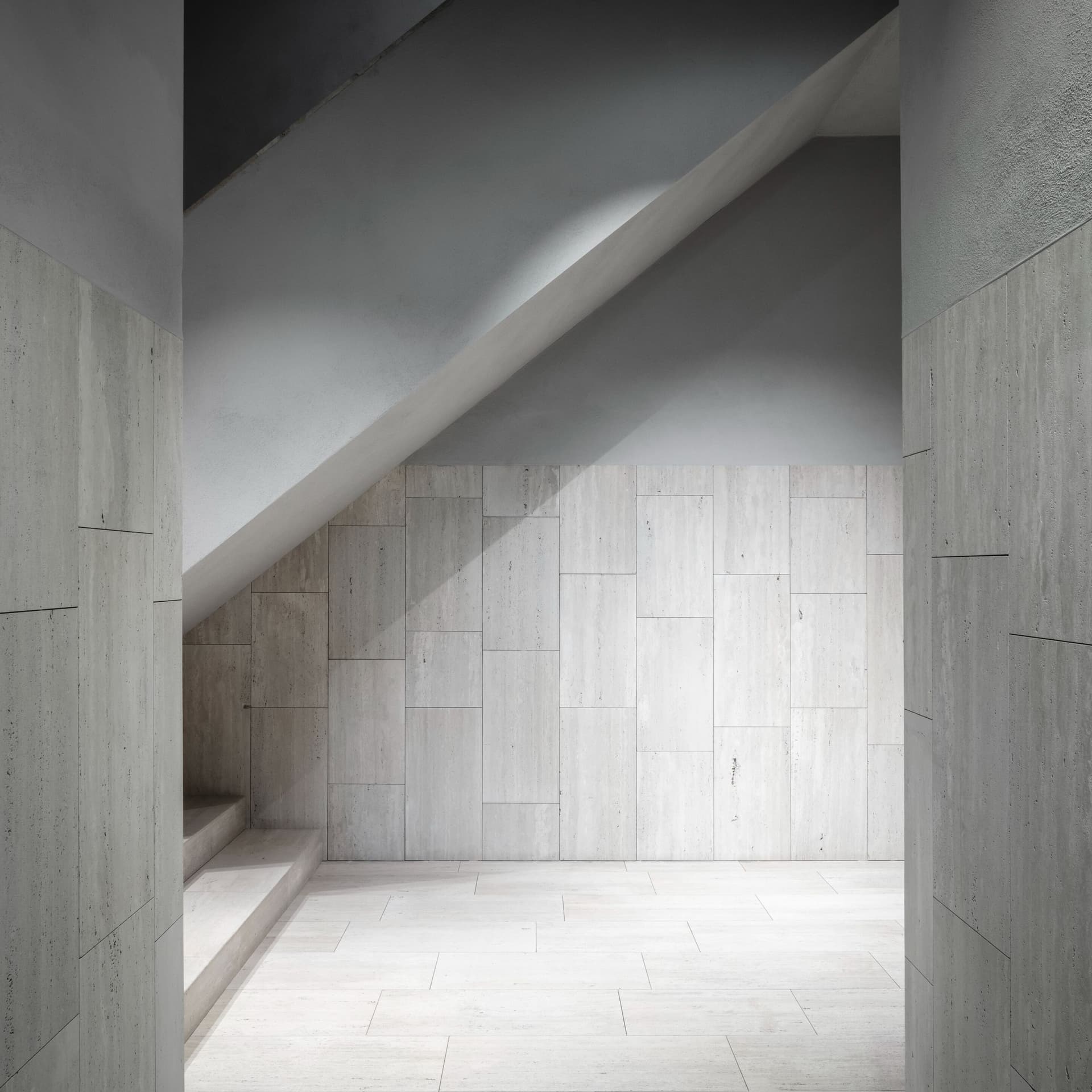 De hal in Rietveldhouse is meer dan een functionele ruimte. Het is ook een sterk architecturaal statement. De vloer – in verstek gelegd door Vloeren Franssens – en de trappen zijn van travertin. In een ode aan de jaren 60 is deze travertin ook in de muren verwerkt tot een hoogte van 2 meter. De bovenkant is in lijn afgewerkt met cement.