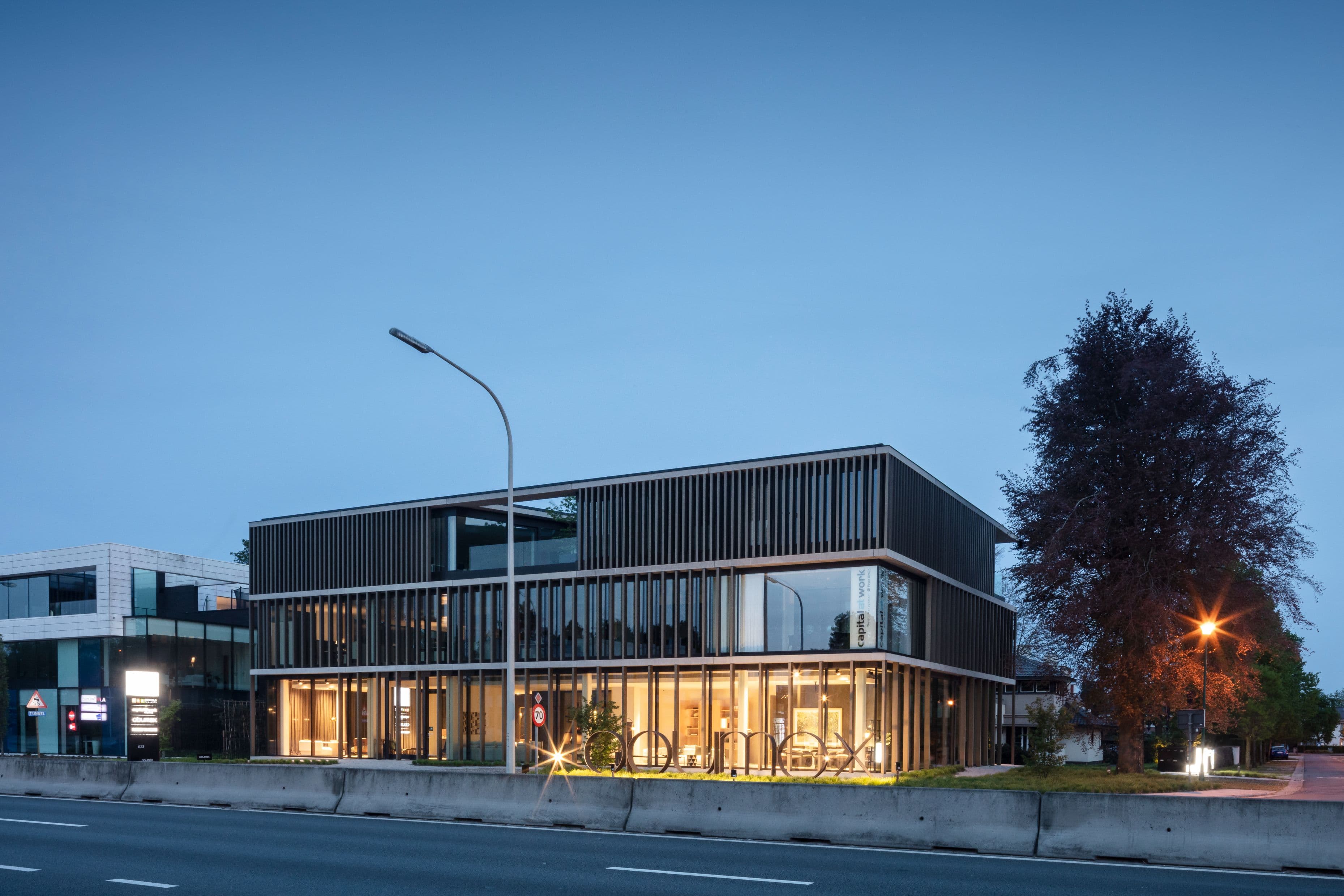 De onderlinge afstand tussen de verticale lamellen wordt kleiner naarmate men hoger komt en we de commerciële delen van dit gebouw achter ons laten. Een fraaie herinnering aan het belang van de leesbaarheid van architectuur. Alle schrijnwerk is voorzien van superisolerende beglazing en blinde delen van ondoorzichtbaar (Colorbel) super-isolerend glas.