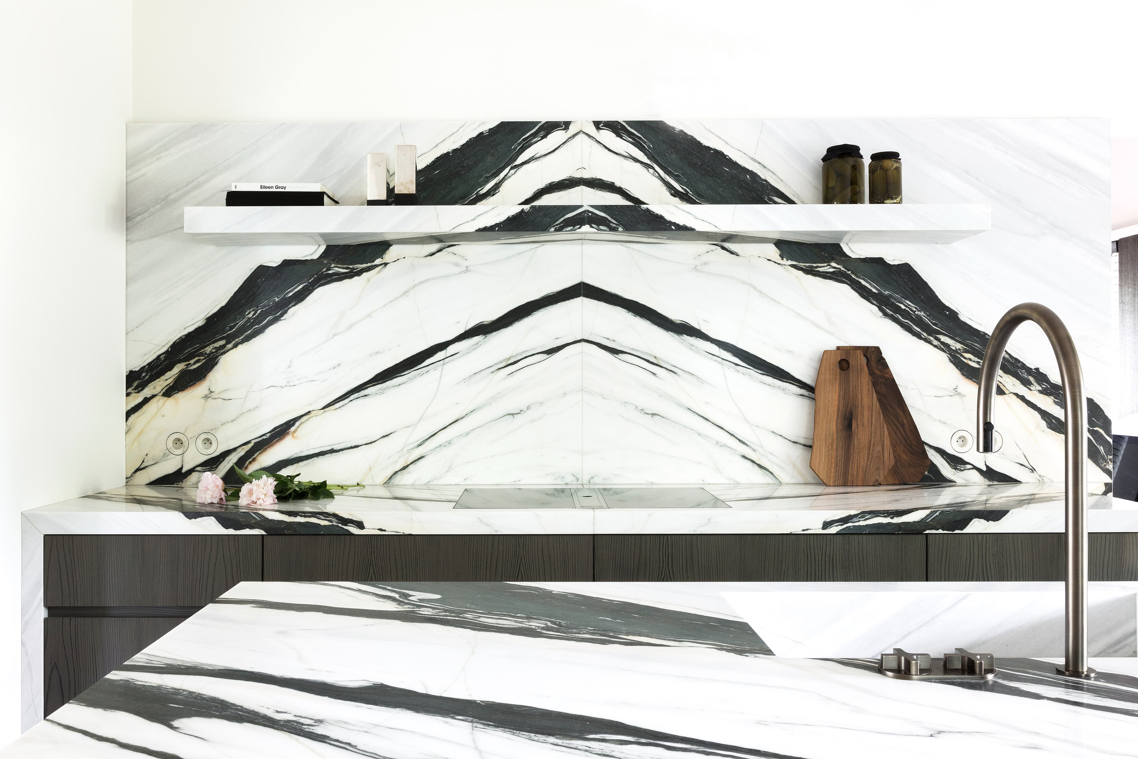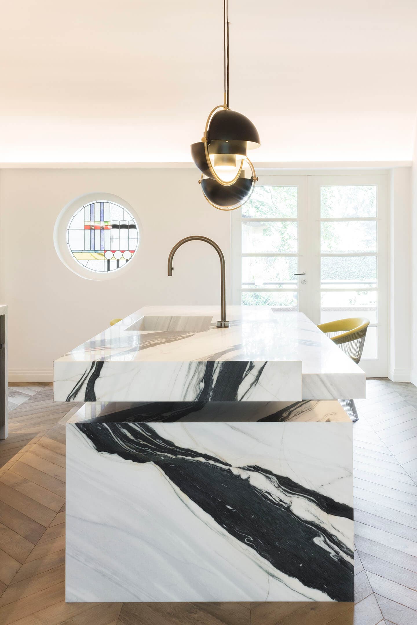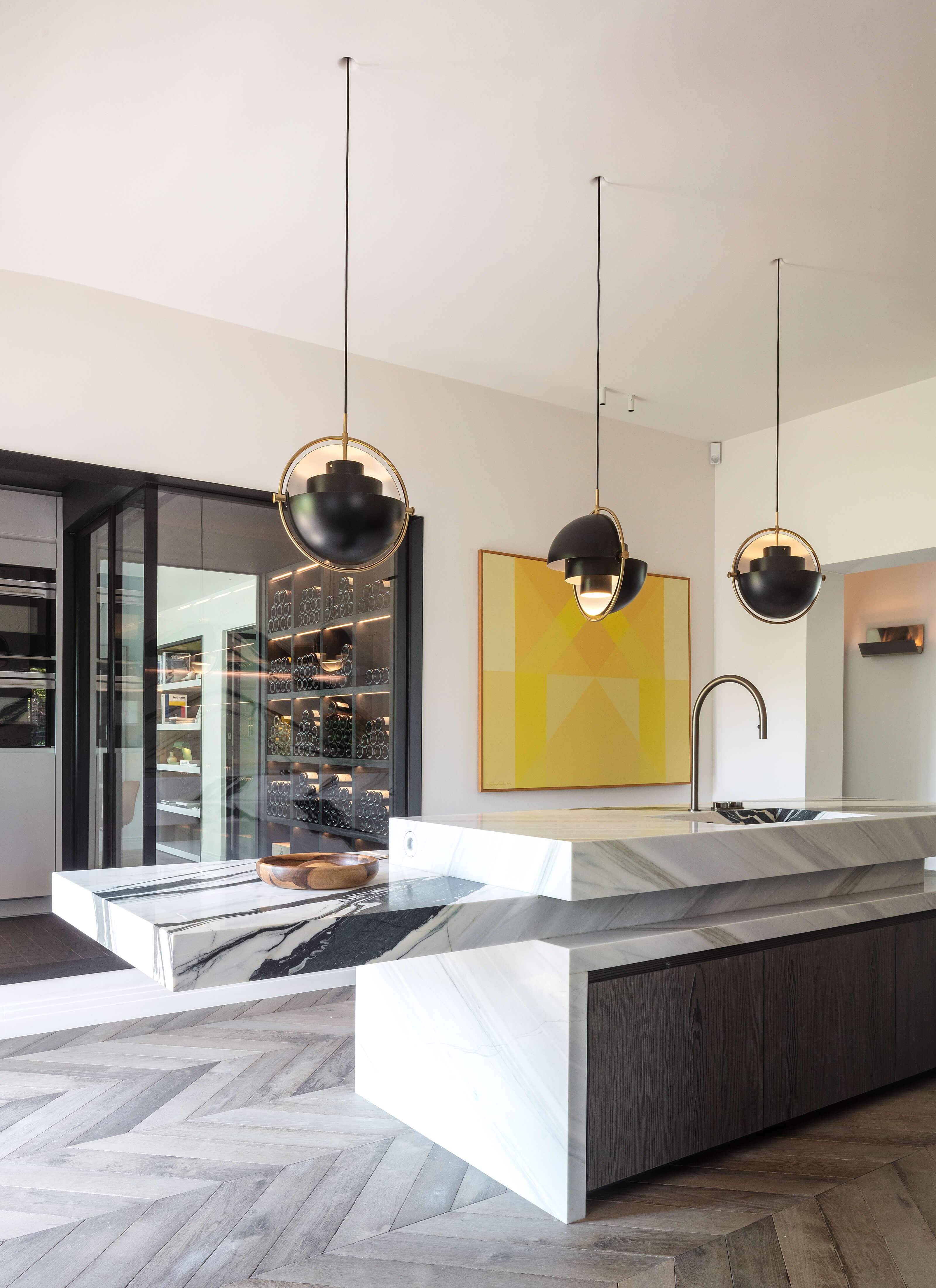 Dirand ziet zijn keuken als een imposant ‘beeldhouwwerk’ waaraan verschillende functies zijn gekoppeld zoals het klassieke keukeneiland en de familietafel. Vanuit dit eiland ontvouwen zich opbergruimtes, kookelementen en andere functies volgens de noden van elk project. Het resultaat is een dynamisch object in een compacte structuur waar eten, koken en werken elkaar vinden. De unieke wit-zwarte Minolo marmer is van natuursteenspecialist Van Den Weghe. Drie wandlampen van Gubi.